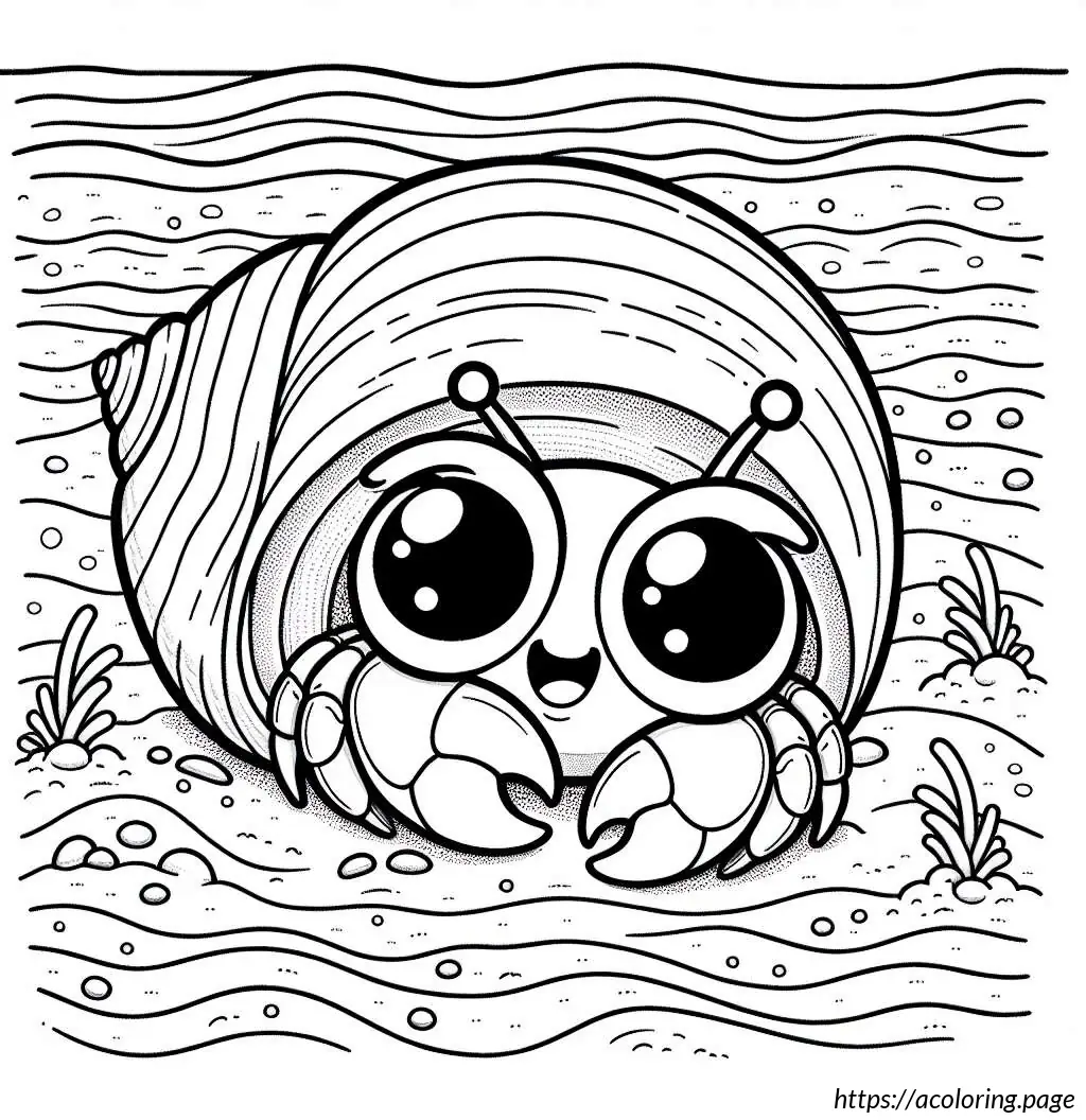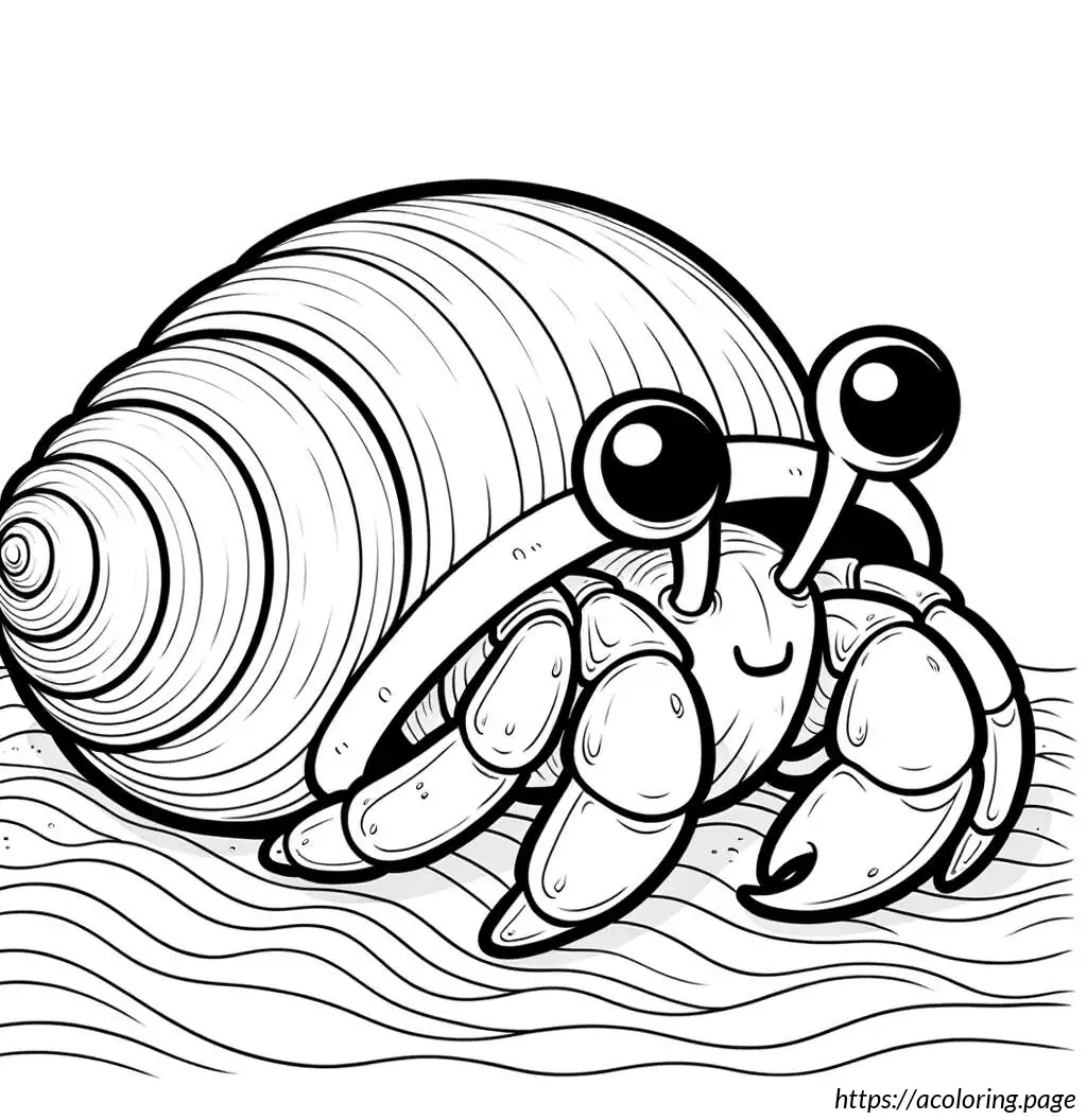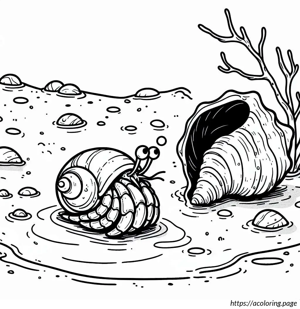 The image is a simple line drawing primarily in black and white. It features a cartoonish hermit crab facing a sea shell. The hermit crab has prominent, oversized eyes, and its body is partly sheltered in a smaller shell which isn’t fully visible. The crab’s claws and legs are well-defined, suggesting mobility. The sea shell to the right is larger, presumably to be the crab’s new home, with smooth, rounded sections giving it a segmented appearance. Between the crab and the shell, the ocean floor is depicted with wavy lines to suggest sand or underwater terrain. The whole scene has an underwater vibe, emphasizing the habitat of the hermit crab.