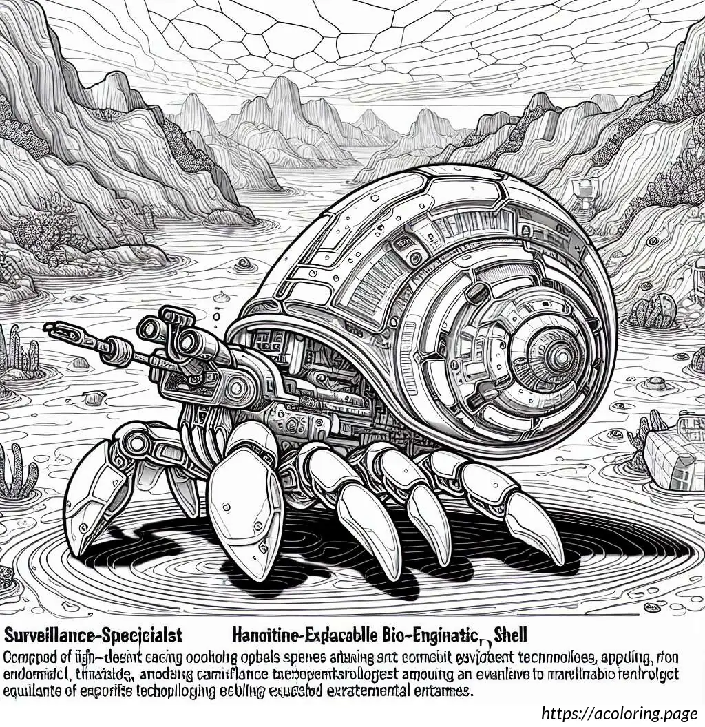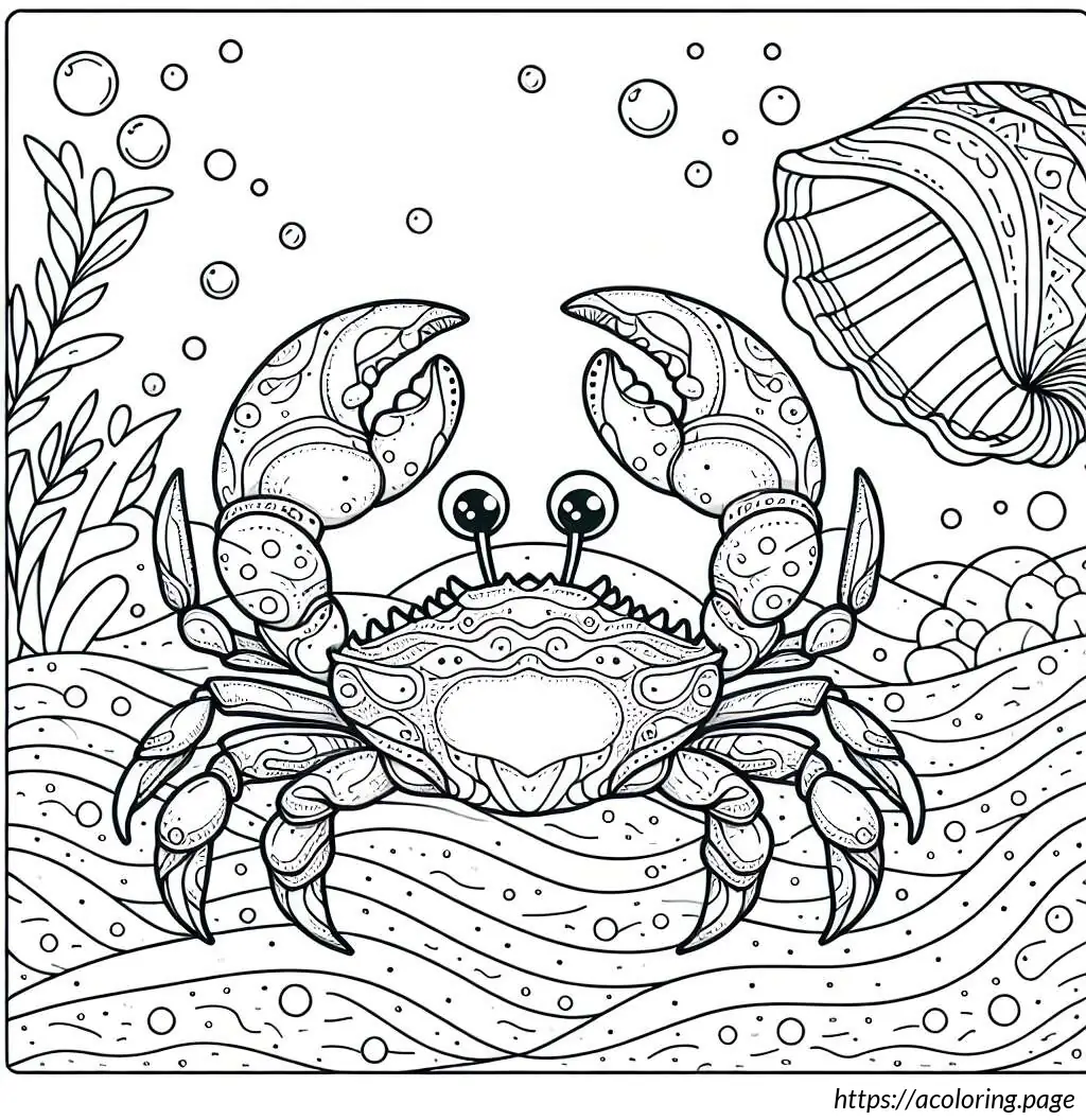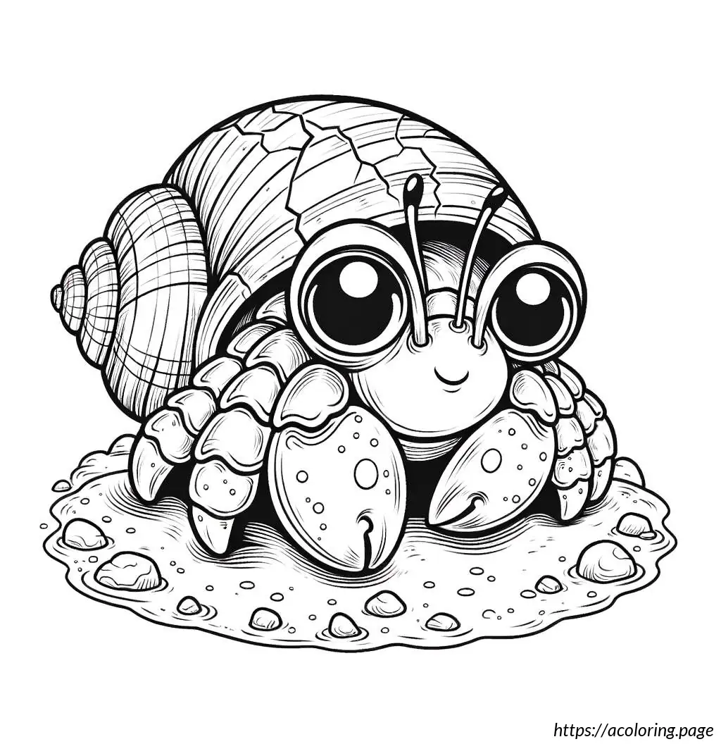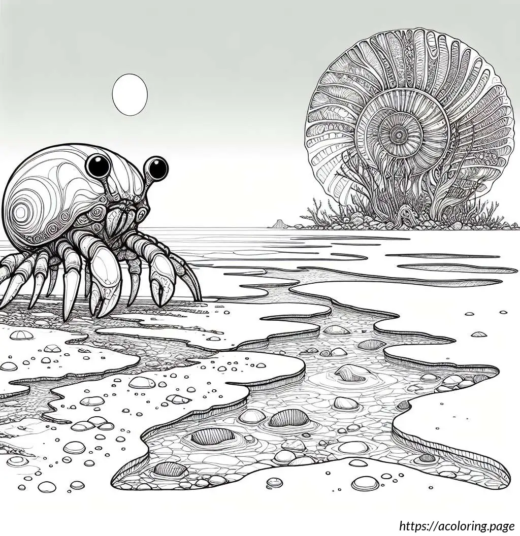 The image is a simple line drawing primarily in black and white. It features a cartoonish hermit crab facing a sea shell. The hermit crab has prominent, oversized eyes, and its body is partly sheltered in a smaller shell which isn’t fully visible. The crab’s claws and legs are well-defined, suggesting mobility. The sea shell to the right is larger, presumably to be the crab’s new home, with smooth, rounded sections giving it a segmented appearance. Between the crab and the shell, the ocean floor is depicted with wavy lines to suggest sand or underwater terrain. The whole scene has an underwater vibe, emphasizing the habitat of the hermit crab.