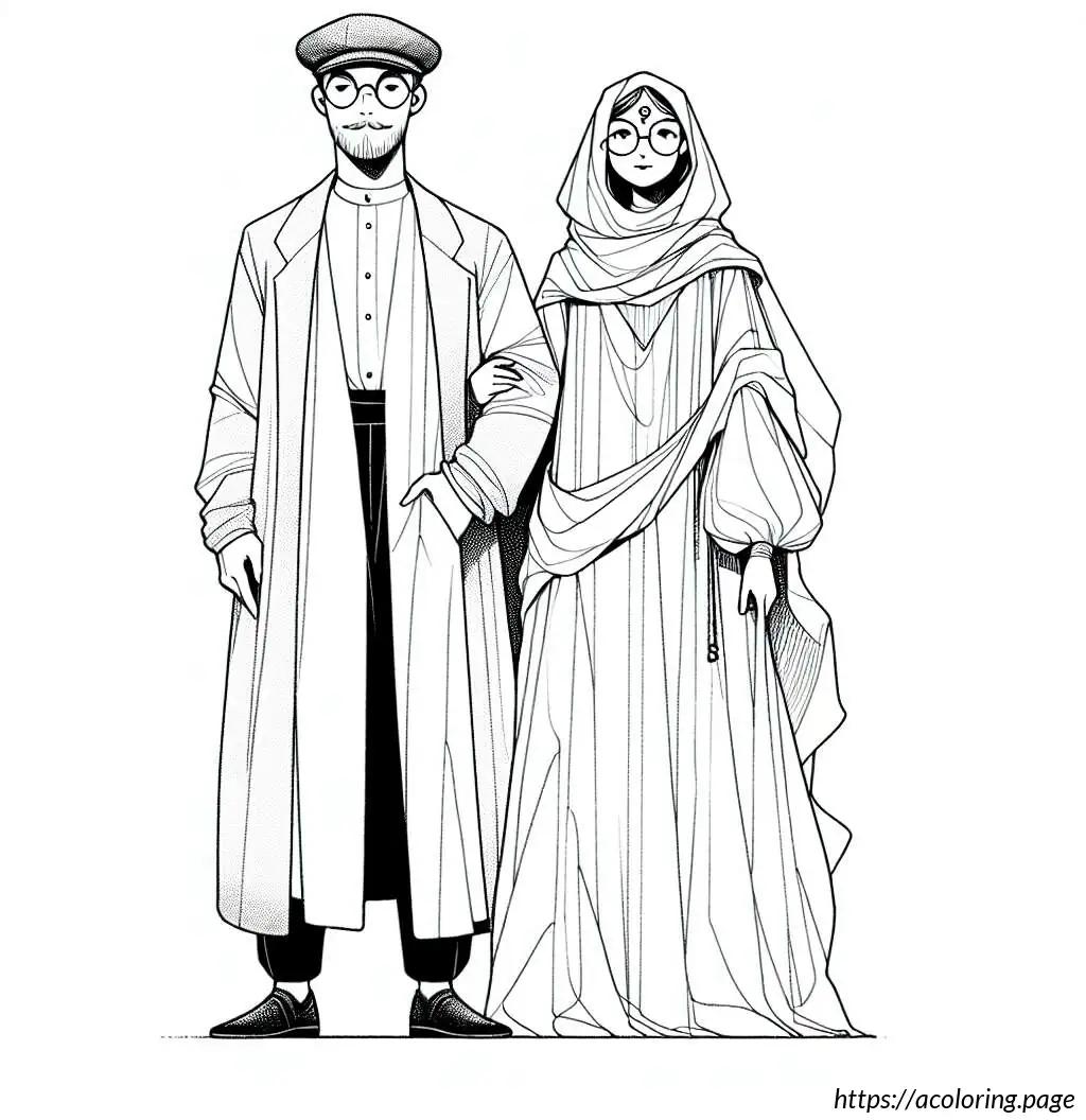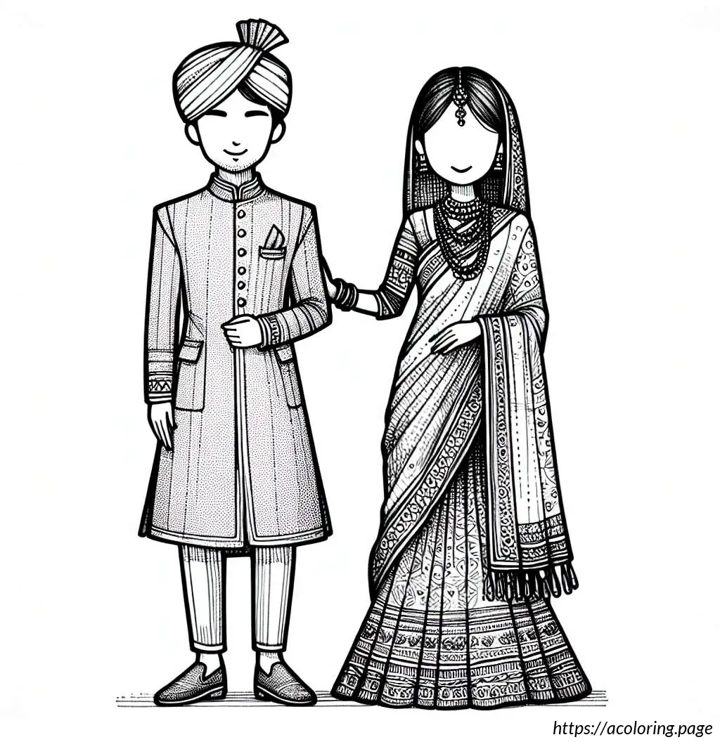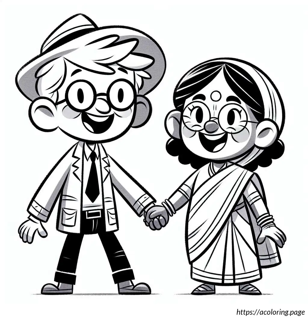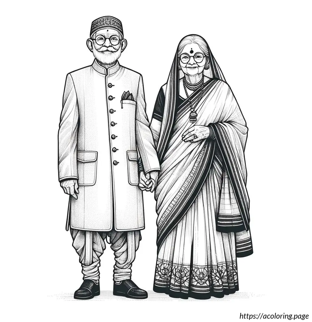 The image depicts a line drawing of an elderly couple, possibly from a South Asian background, dressed in traditional attire. The man is wearing a long-sleeved, knee-length sherwani jacket paired with trousers and a traditional cap. He has noticeable facial features like round glasses and a friendly smile. The woman is dressed in a sari, complete with a draped shawl over her upper body, and she also wears glasses. Her hair is pulled back, and she has a bindi on her forehead, which is a colored dot worn by many women from South Asia. Both characters appear cheerful and are holding hands, suggesting a close relationship, possibly depicting warmth and companionship.