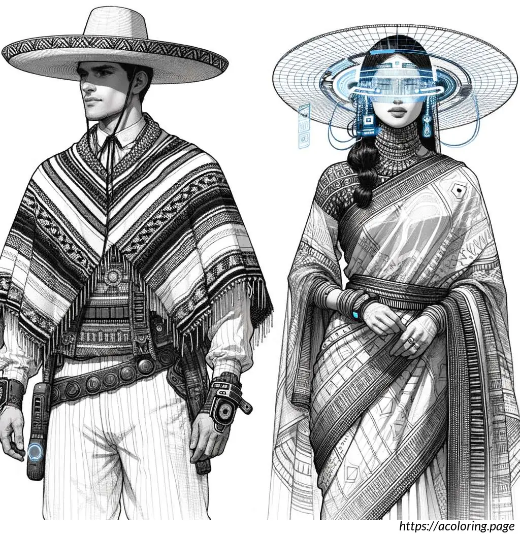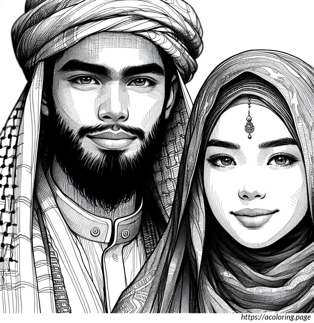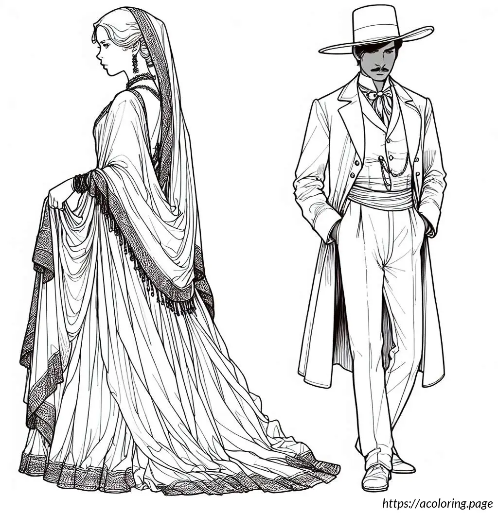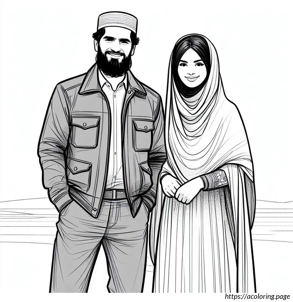The image depicts a line drawing of an elderly couple, possibly from a South Asian background, dressed in traditional attire. The man is wearing a long-sleeved, knee-length sherwani jacket paired with trousers and a traditional cap. He has noticeable facial features like round glasses and a friendly smile. The woman is dressed in a sari, complete with a draped shawl over her upper body, and she also wears glasses. Her hair is pulled back, and she has a bindi on her forehead, which is a colored dot worn by many women from South Asia. Both characters appear cheerful and are holding hands, suggesting a close relationship, possibly depicting warmth and companionship.