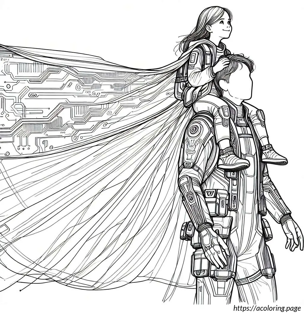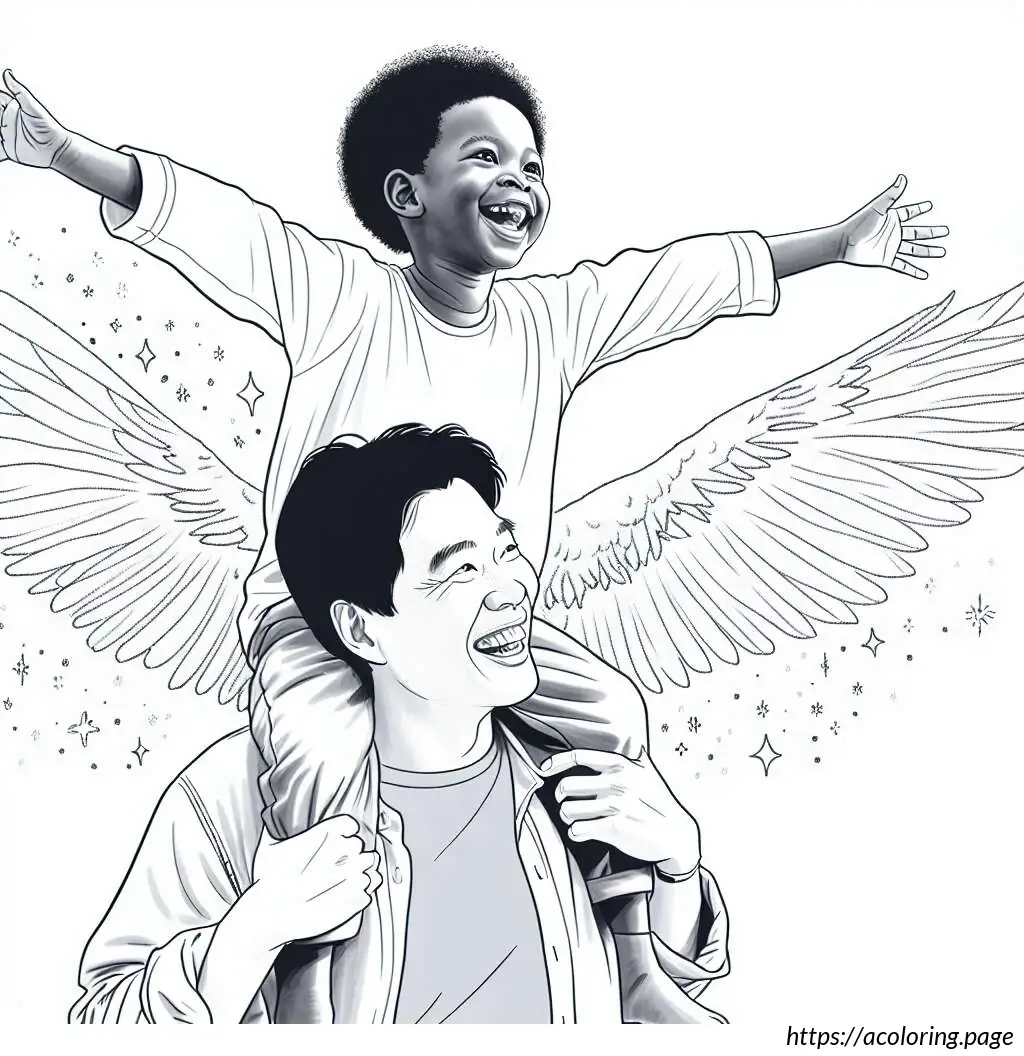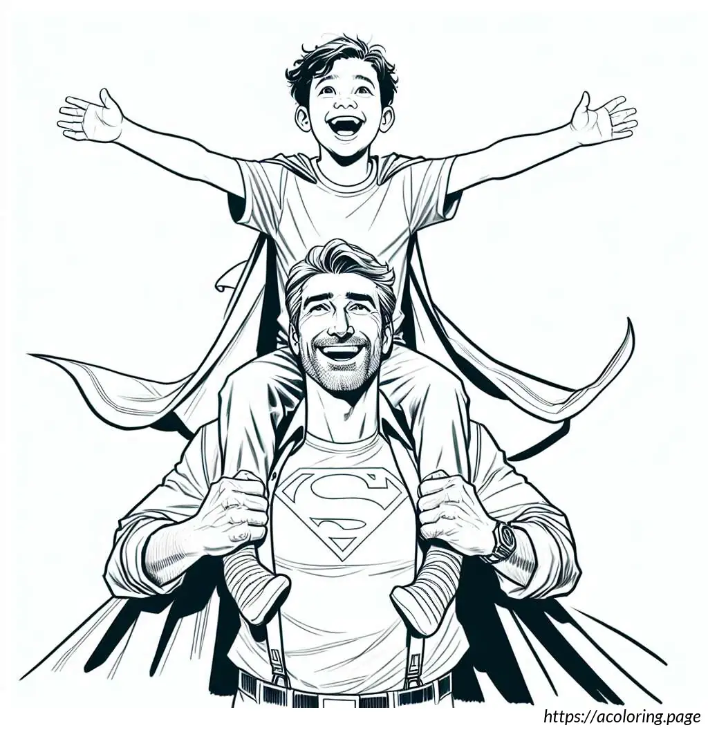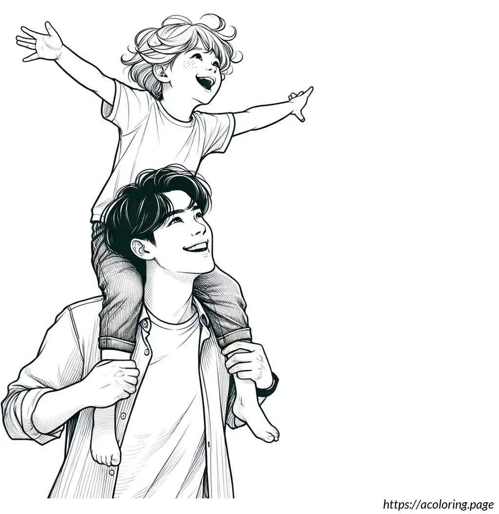The image shows a line drawing depicting what appears to be a joyful scene of two males, likely a father and his young son. The father is standing upright, smiling broadly, looking up to his son who is perched on his shoulders. The young boy, also smiling, is stretching his arms out to the sides in a playful manner, mimicking the action of flying.