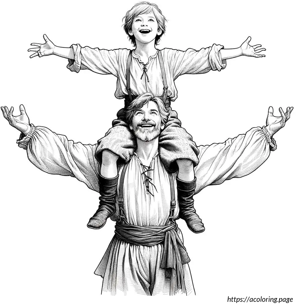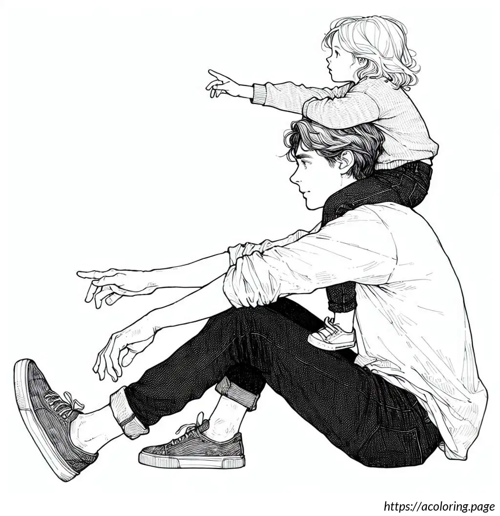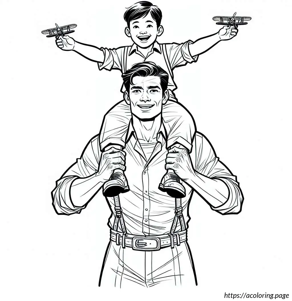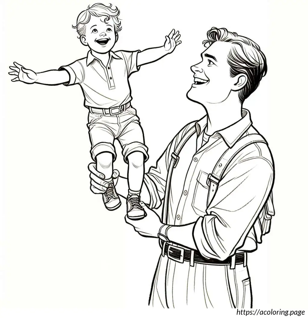 The father is dressed in a shirt with rolled-up sleeves, trousers, and a belt. He supports his son with his hands securely placed on the boy’s ankles. Both characters are drawn with simplistic yet expressive facial features.