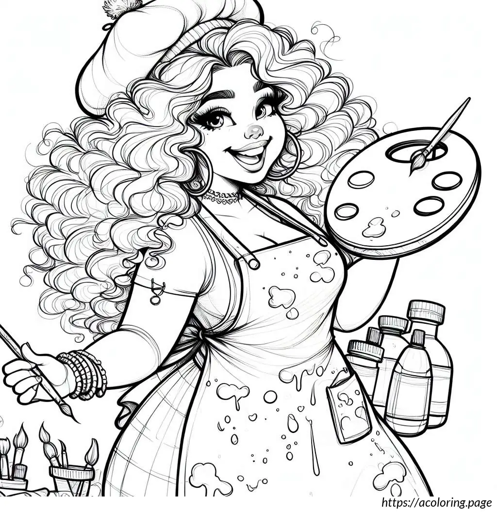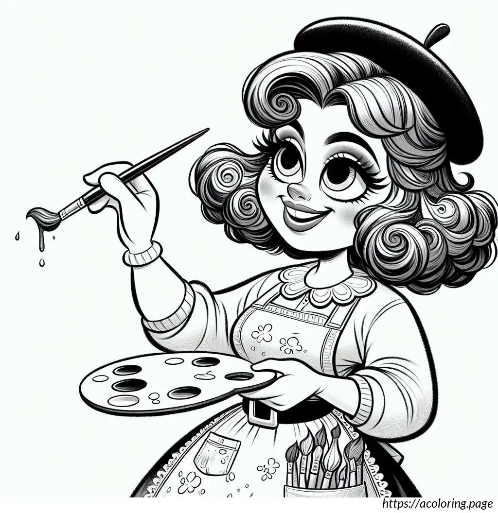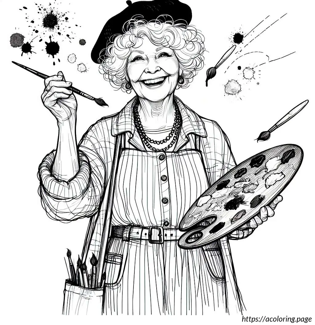 This image is a line drawing of a cheerful, elderly woman who appears to be an artist. She has curly hair, a round face, and is smiling. The woman wears a beret and a large, loose artist’s smock that covers her body. The smock has paint stains on it, suggesting she has been painting. She holds a palette covered with various blobs of paint in her left hand and a paintbrush in her right hand. She is also dressed in pants that are loose-fitting, which complement her casual, artistic attire. The outline style of the drawing is simple and clear, emphasizing the joyful expression and creative occupation of the woman.