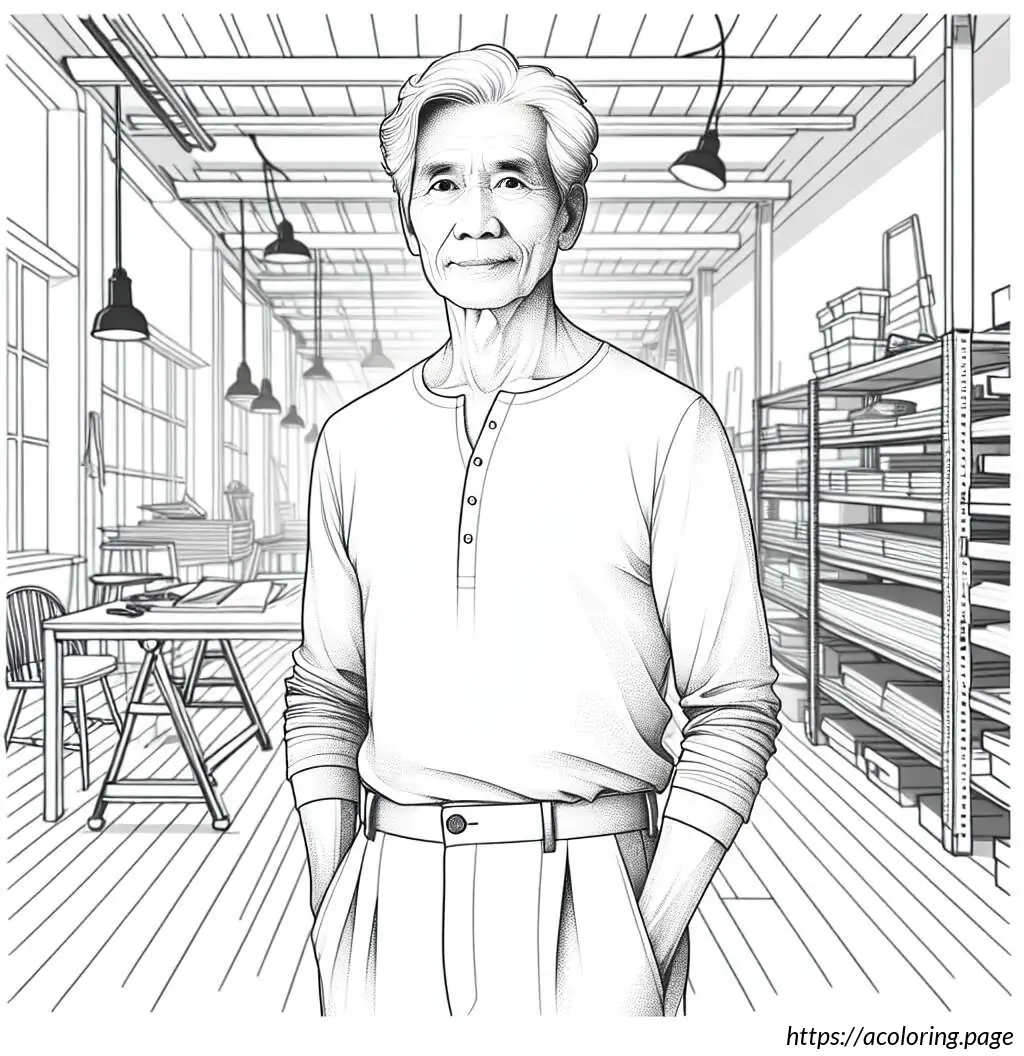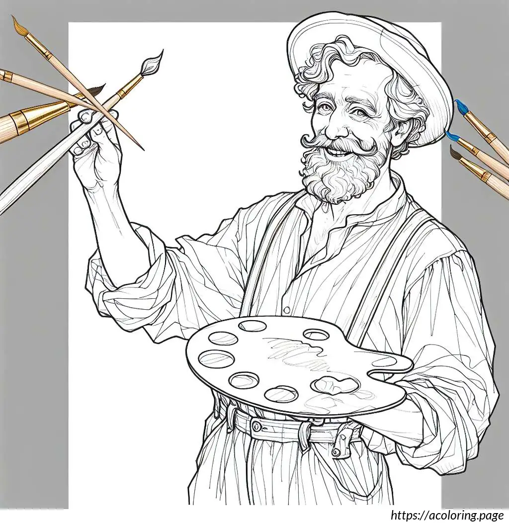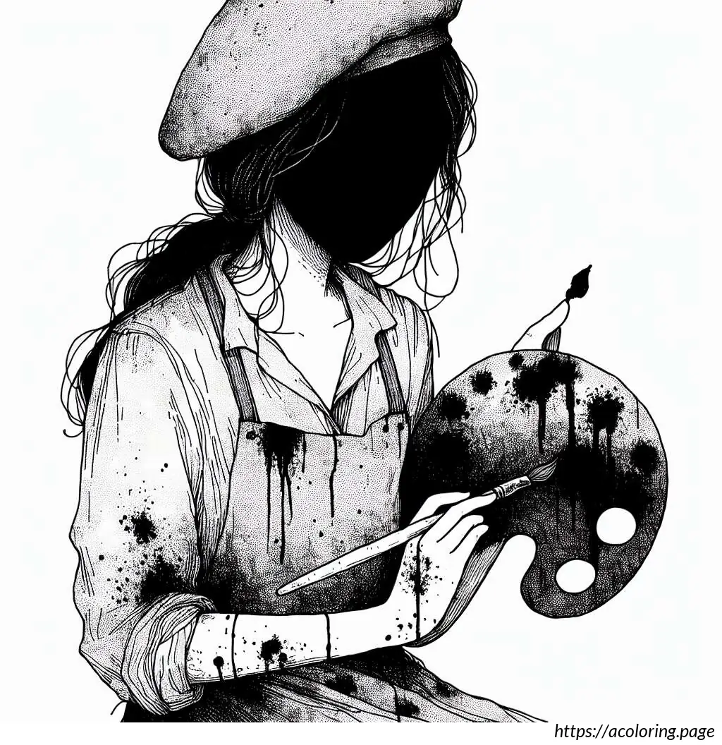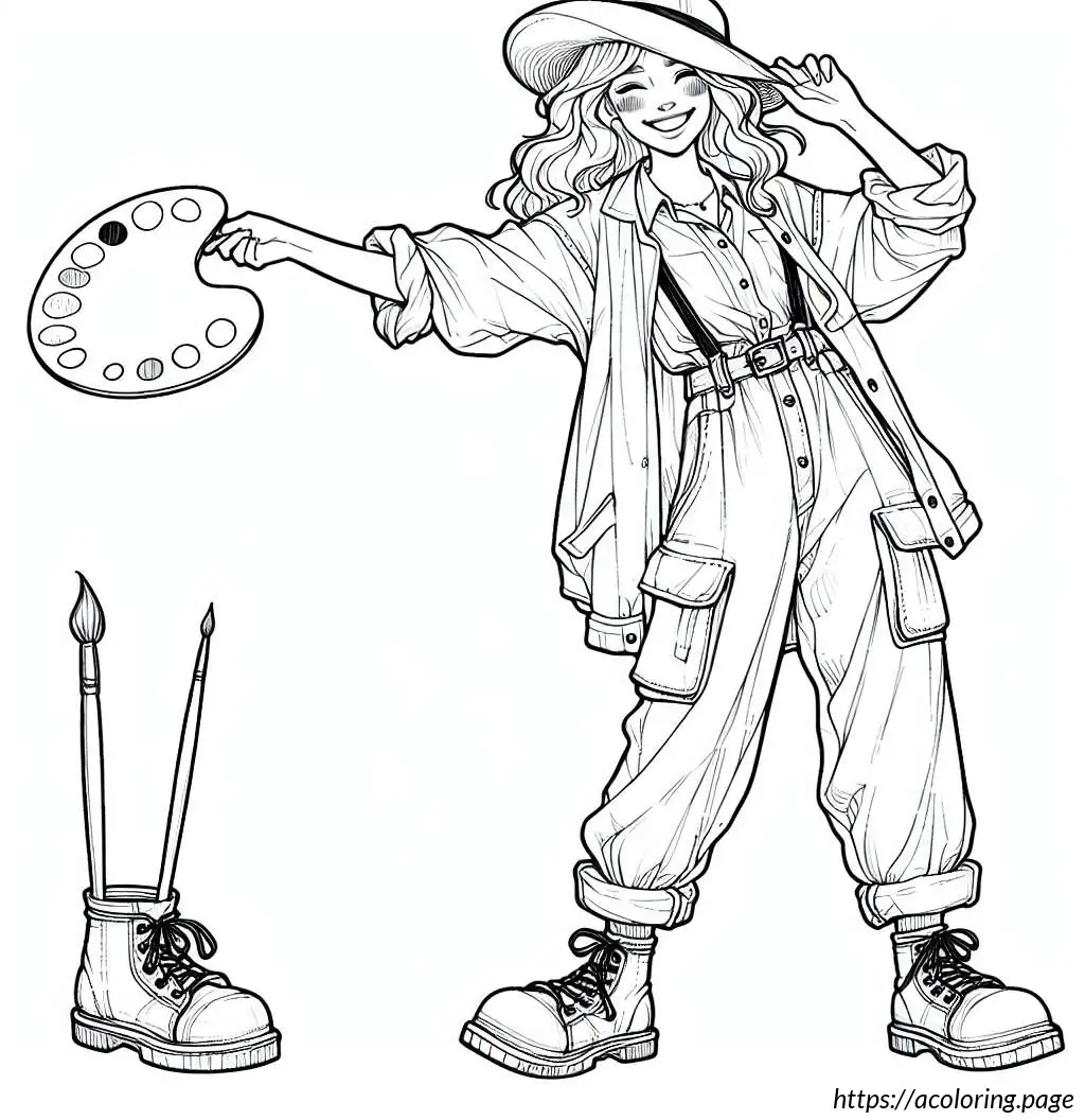 This image is a line drawing of a cheerful, elderly woman who appears to be an artist. She has curly hair, a round face, and is smiling. The woman wears a beret and a large, loose artist’s smock that covers her body. The smock has paint stains on it, suggesting she has been painting. She holds a palette covered with various blobs of paint in her left hand and a paintbrush in her right hand. She is also dressed in pants that are loose-fitting, which complement her casual, artistic attire. The outline style of the drawing is simple and clear, emphasizing the joyful expression and creative occupation of the woman.