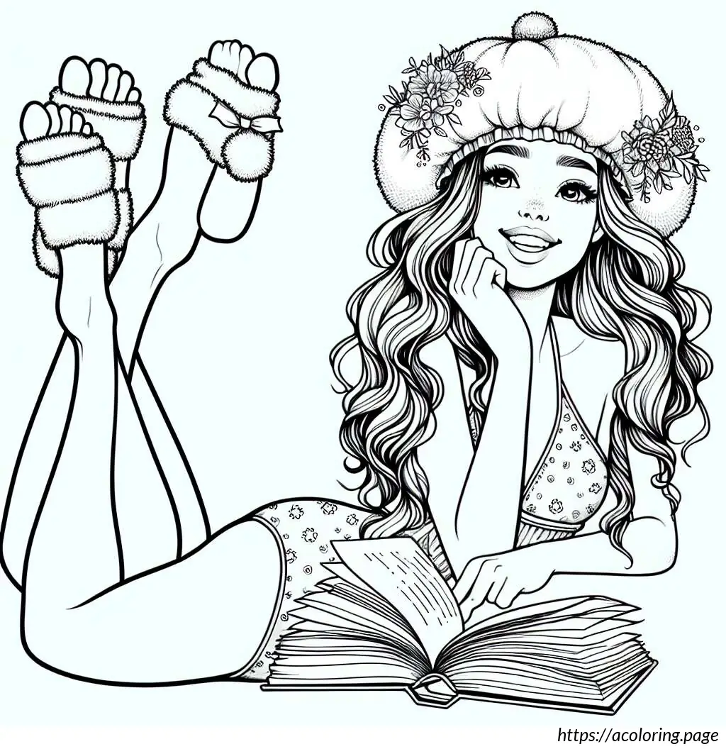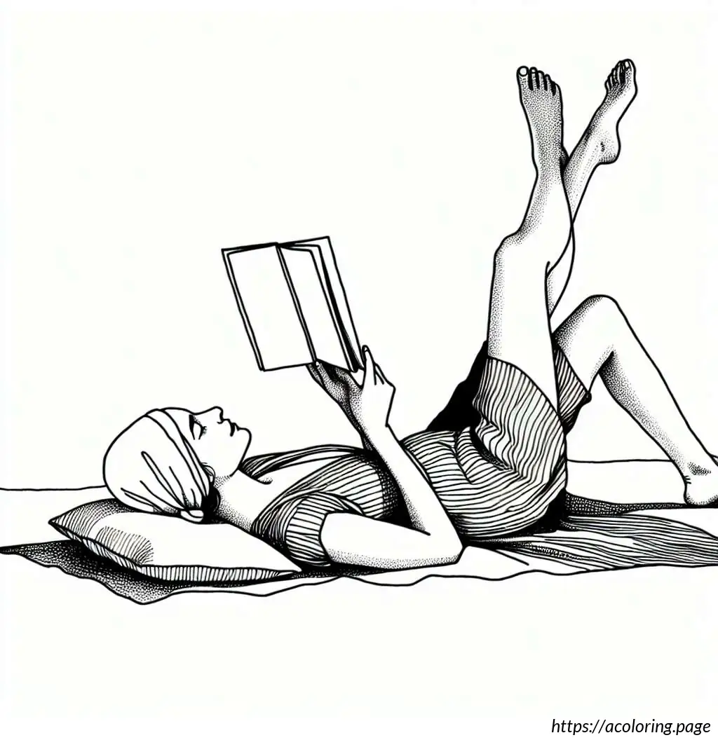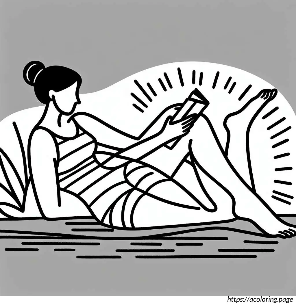 The image features a line drawing of a woman in a bathing suit. She is depicted lying on her stomach, propped up on her bent elbows, and is reading a book. She has her knees bent and feet raised in the air. The woman is wearing a shower cap and there are radiating lines around her head, suggesting concentration or absorption in her reading. The art style is simple and clear, using black lines without any color fill.