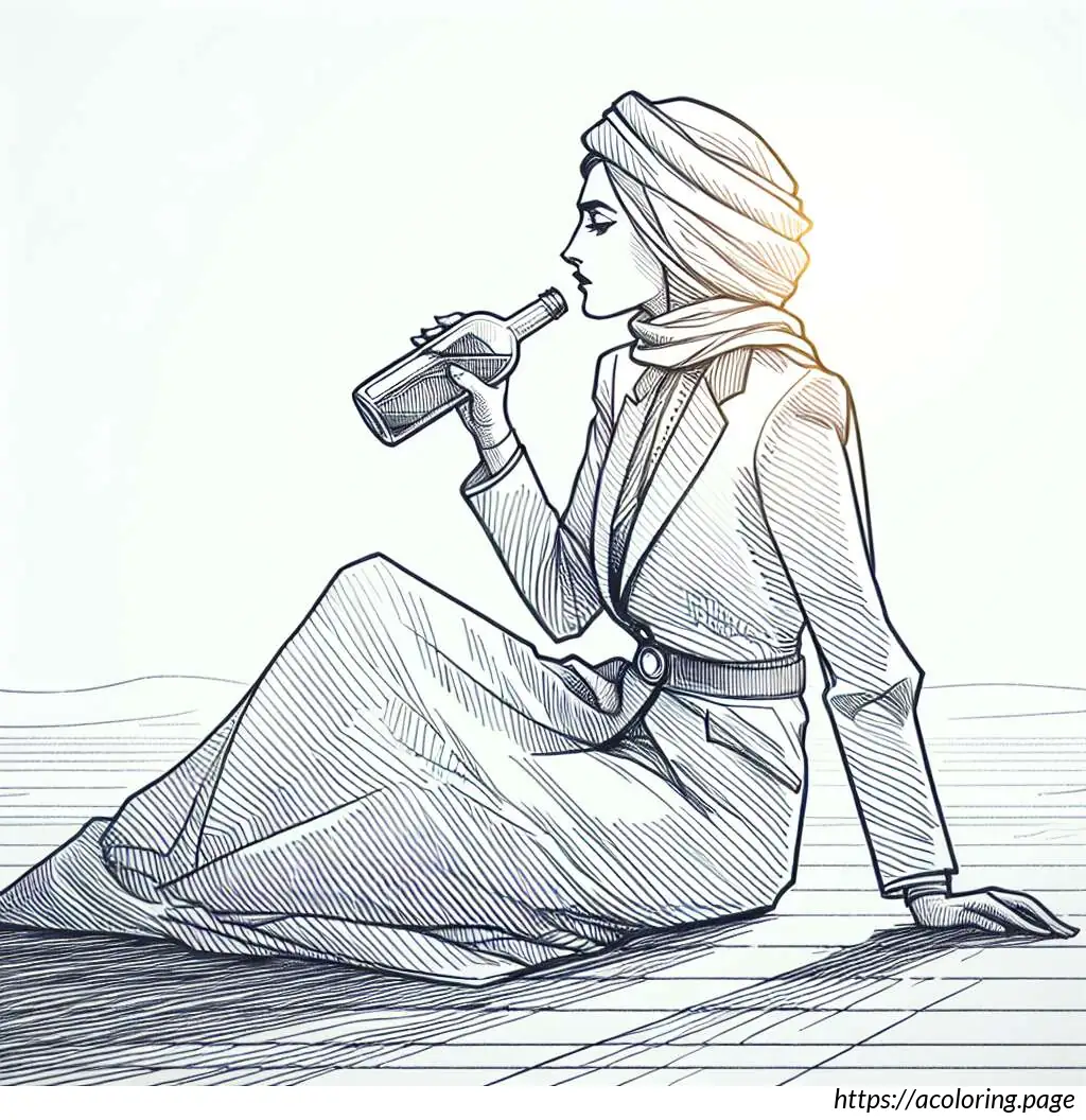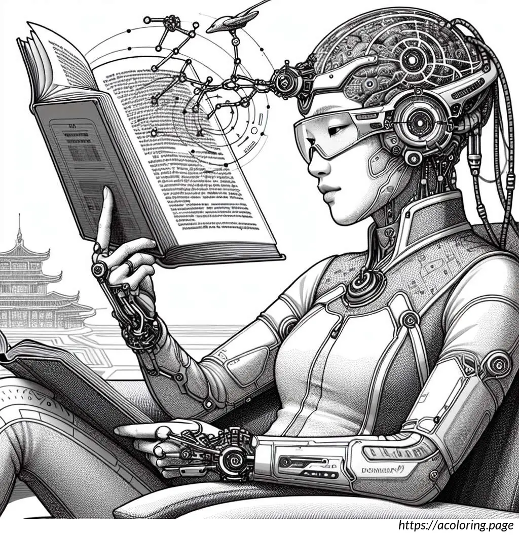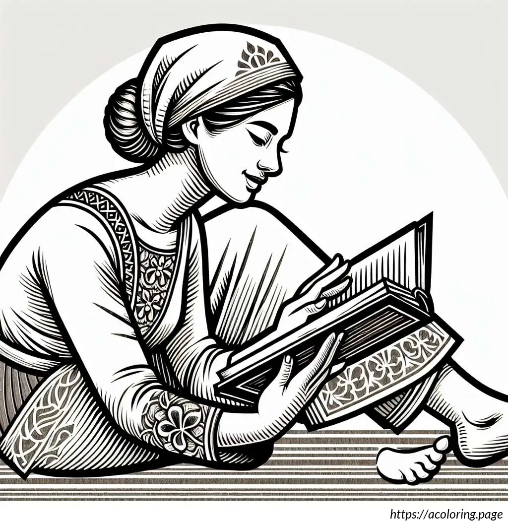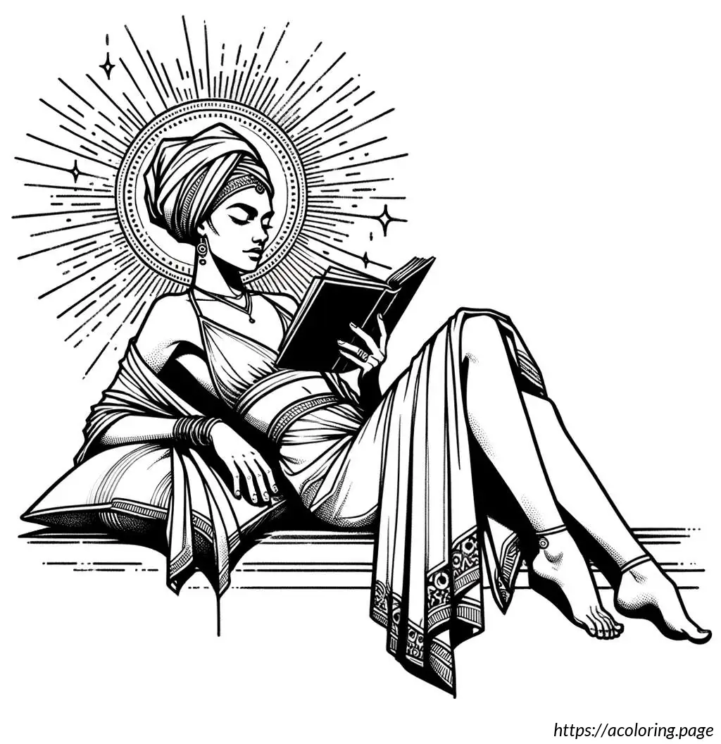 The image features a line drawing of a woman in a bathing suit. She is depicted lying on her stomach, propped up on her bent elbows, and is reading a book. She has her knees bent and feet raised in the air. The woman is wearing a shower cap and there are radiating lines around her head, suggesting concentration or absorption in her reading. The art style is simple and clear, using black lines without any color fill.