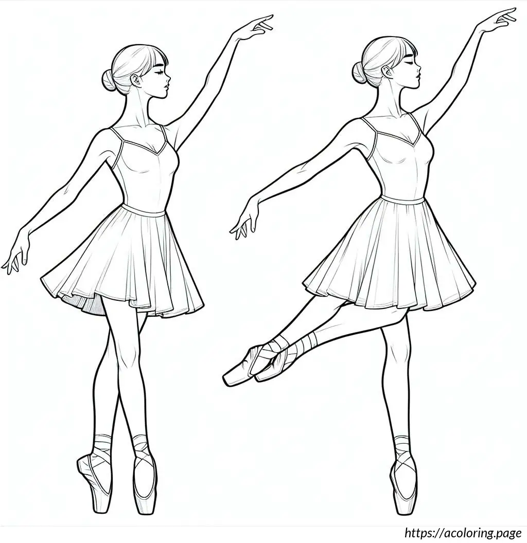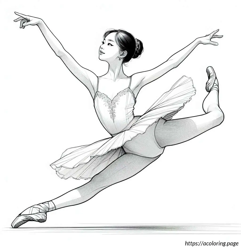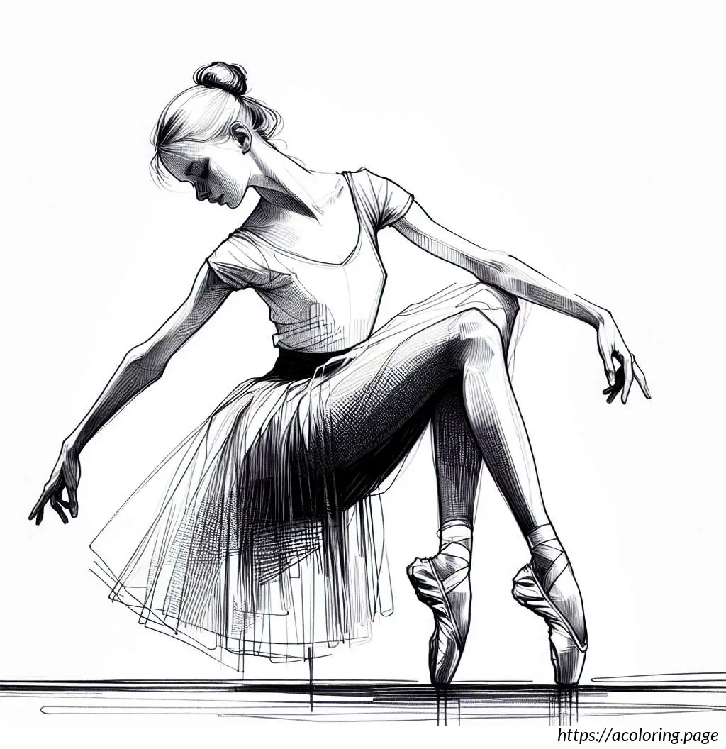 This image shows a line drawing of a young girl performing ballet. She is in a dynamic pose with one leg lifted high up behind her, pointed toe reaching towards the sky, which suggests a ballet move such as an arabesque. She is wearing a typical ballet outfit, consisting of a leotard with a flared skirt attached. Her hair is styled into a neat bun on top of her head, a common hairstyle for ballet dancers to keep their hair out of the face while dancing. The girl’s facial expression is focused and poised, with her eyes looking forward and one arm extended gracefully in front of her. The drawing uses clean, simple lines to depict the dancer, emphasizing the elegance and fluidity of the ballet position.