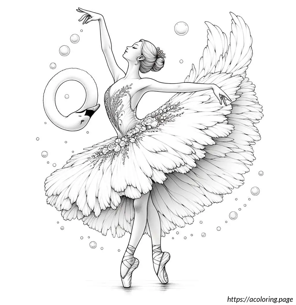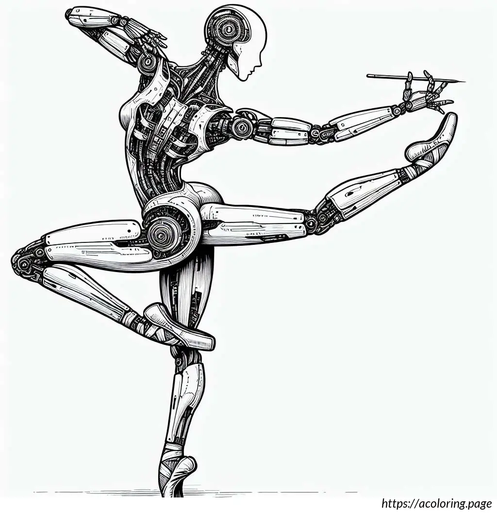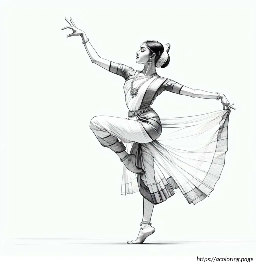 This image shows a line drawing of a young girl performing ballet. She is in a dynamic pose with one leg lifted high up behind her, pointed toe reaching towards the sky, which suggests a ballet move such as an arabesque. She is wearing a typical ballet outfit, consisting of a leotard with a flared skirt attached. Her hair is styled into a neat bun on top of her head, a common hairstyle for ballet dancers to keep their hair out of the face while dancing. The girl’s facial expression is focused and poised, with her eyes looking forward and one arm extended gracefully in front of her. The drawing uses clean, simple lines to depict the dancer, emphasizing the elegance and fluidity of the ballet position.