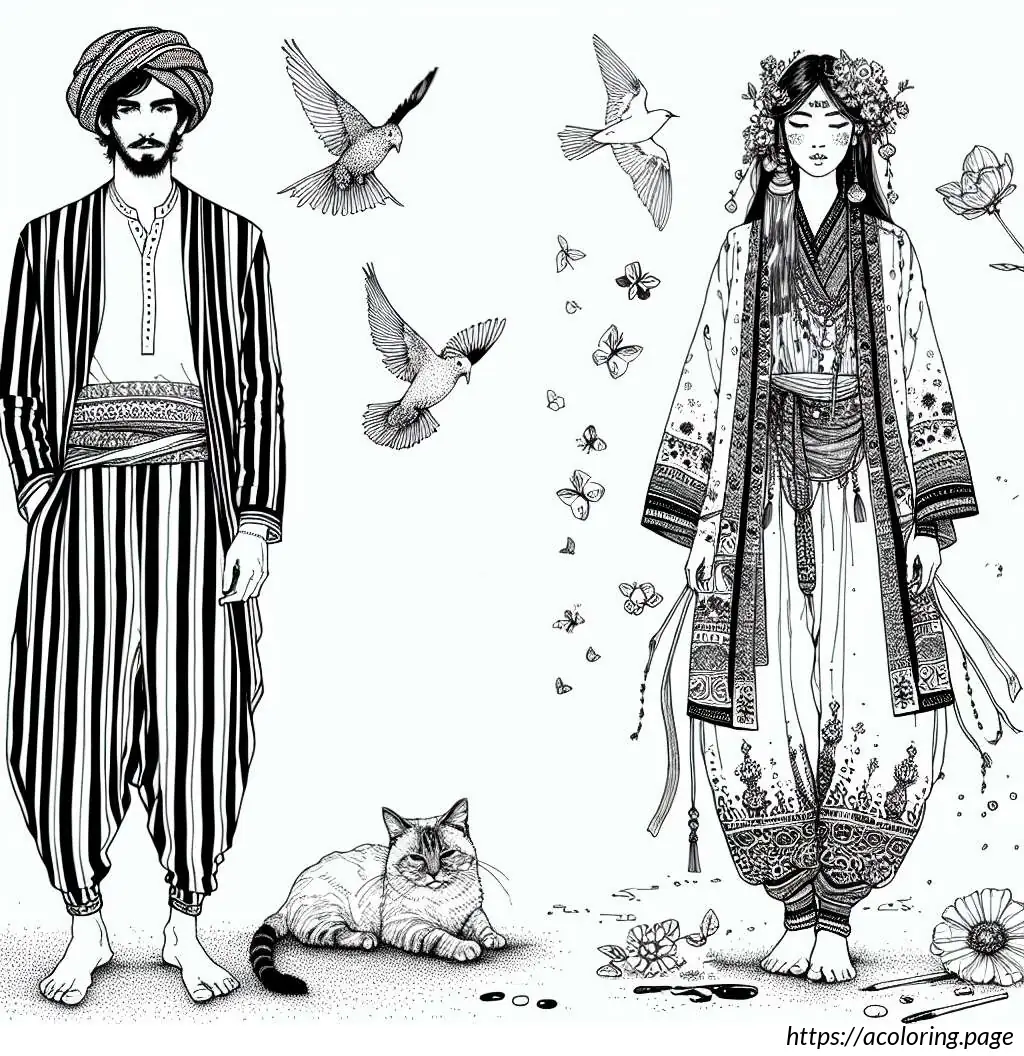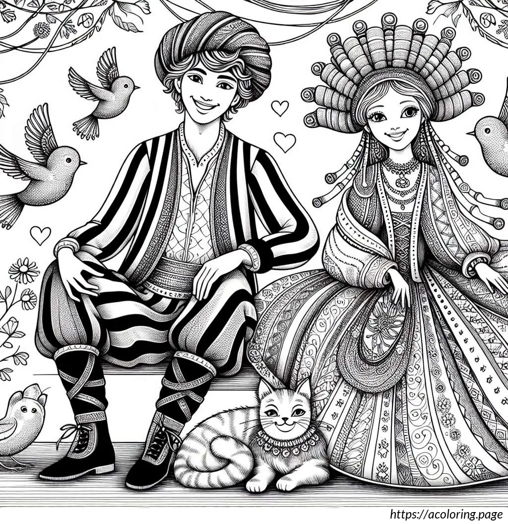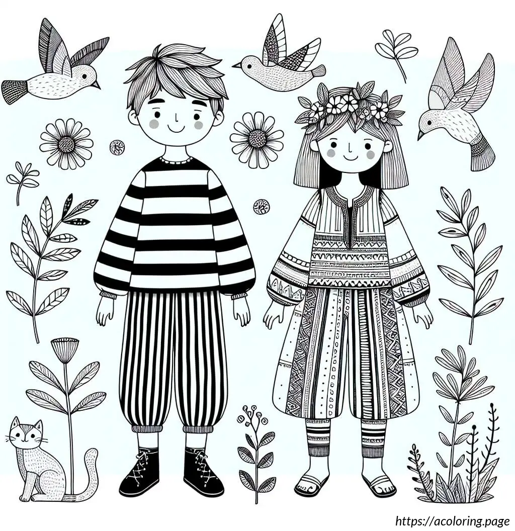 This image is a black and white line drawing suitable for coloring. It features two characters; a male and a female. The male, on the left, is smiling broadly. He wears a striped shirt, pants, shoes, and a peculiar cap. His hands are at his sides. The female on the right also has a cheerful expression, and is dressed in an ornately patterned outfit that includes a wrap-around skirt, a long-sleeve shirt, and a shawl draped over one shoulder. Her hair has multiple cylindrical rolls and is adorned with flowers.