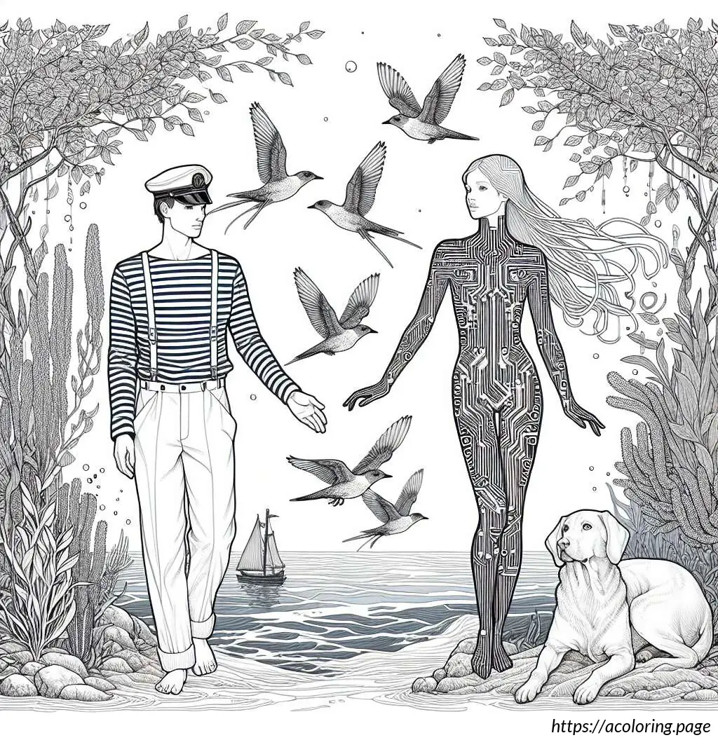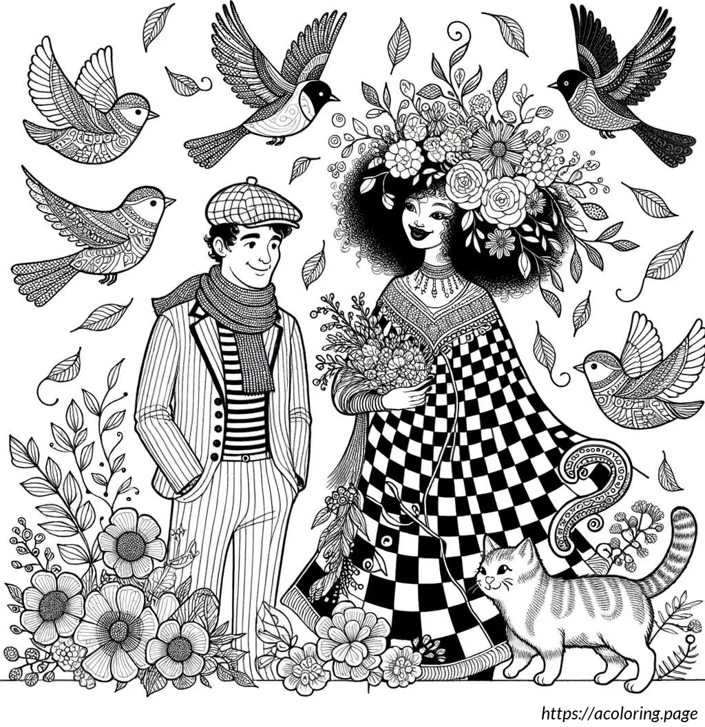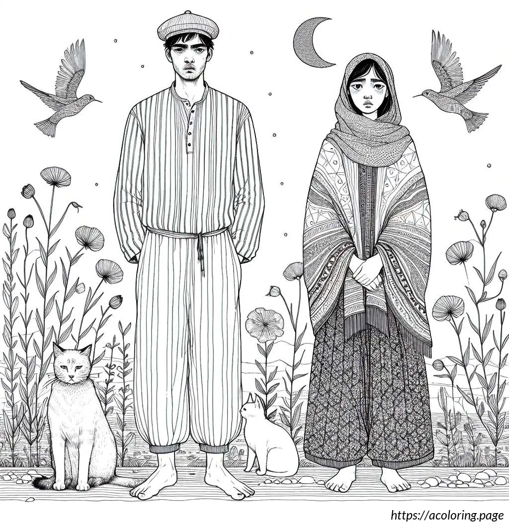 This image is a black and white line drawing suitable for coloring. It features two characters; a male and a female. The male, on the left, is smiling broadly. He wears a striped shirt, pants, shoes, and a peculiar cap. His hands are at his sides. The female on the right also has a cheerful expression, and is dressed in an ornately patterned outfit that includes a wrap-around skirt, a long-sleeve shirt, and a shawl draped over one shoulder. Her hair has multiple cylindrical rolls and is adorned with flowers.
