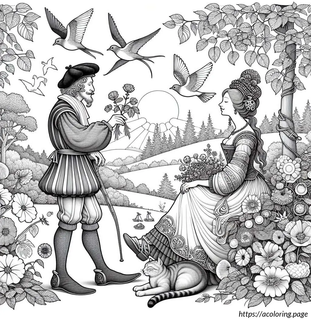 Around them, the scene includes two flying birds positioned between and above their heads, appearing animated and joyful. Below the characters, on the ground, there is a cat lying on its stomach, with its eyes narrowly opened. Additionally, there are two clusters of flowers on the ground next to the characters, adding to the serene and pleasant setting of the scene.