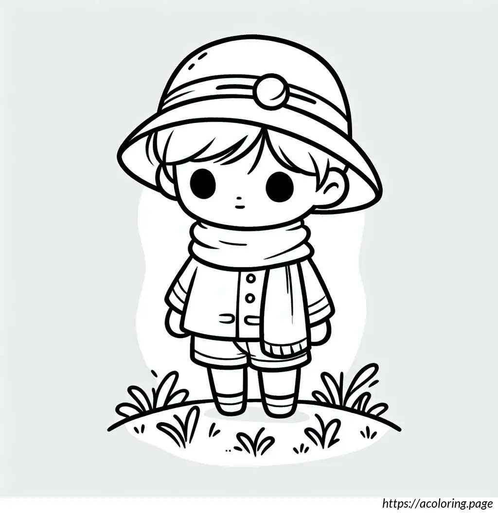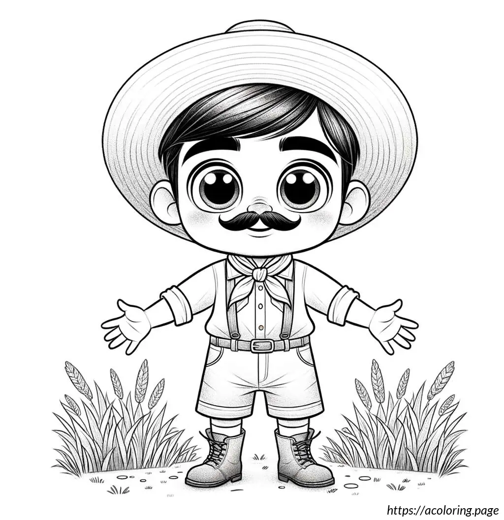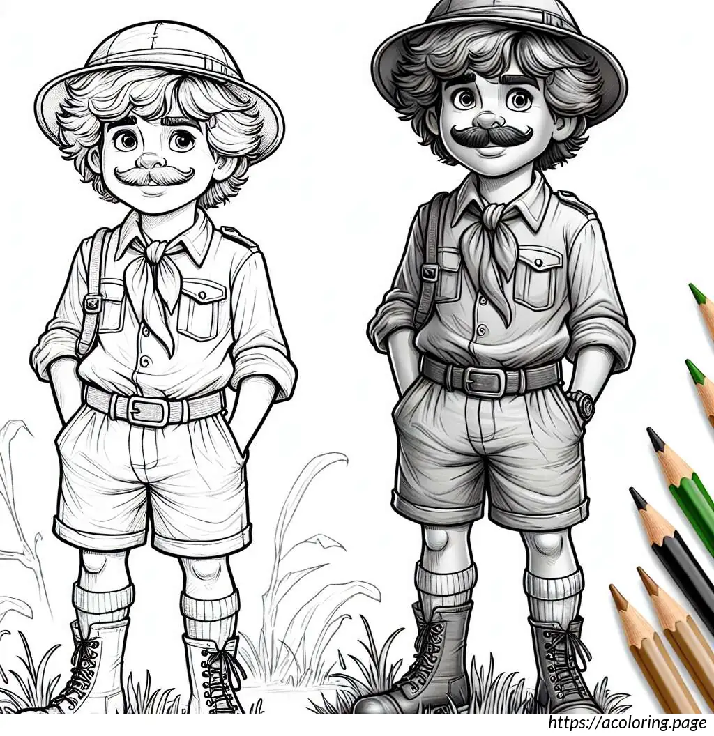 This image is a black and white line drawing of a cartoon character resembling a safari explorer or adventurer. The character is depicted as a young boy with wavy hair and a mustache, wearing a safari outfit. He is outfitted with a brimmed hat, a neckerchief tied at the front with a knot, an unbuttoned long-sleeve shirt over a T-shirt, shorts, and laced-up boots. The character is standing with arms spread slightly and a smile on his face, showing a friendly demeanor. The background suggests that he might be standing on grass, as indicated by the jagged line detailing at the bottom of the frame. The overall drawing is simple and appears designed for coloring activities, given its clear outlines and ample white space.