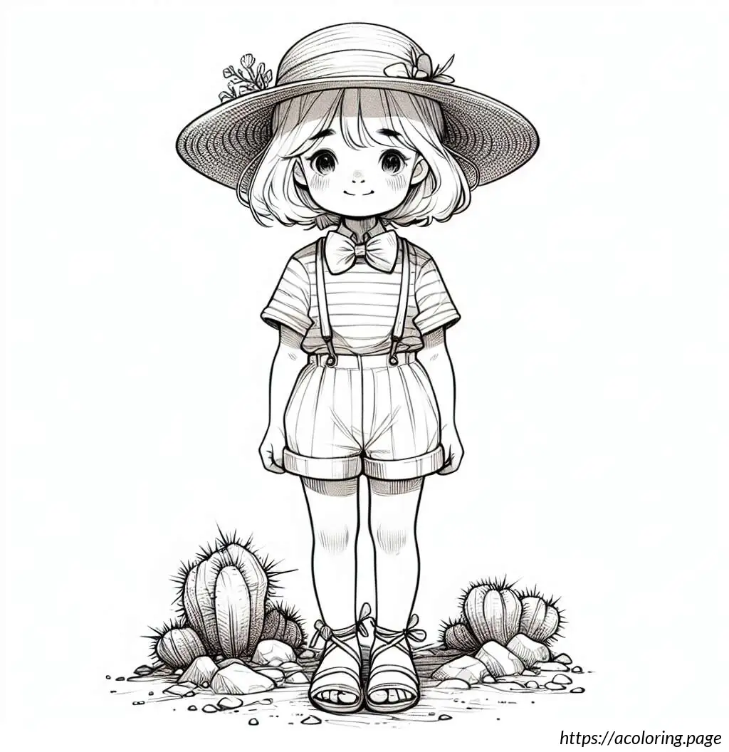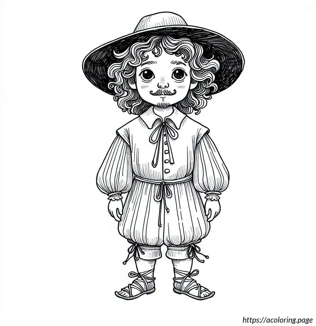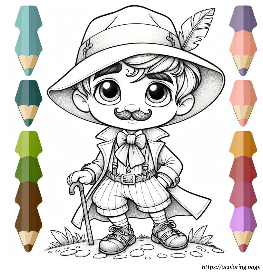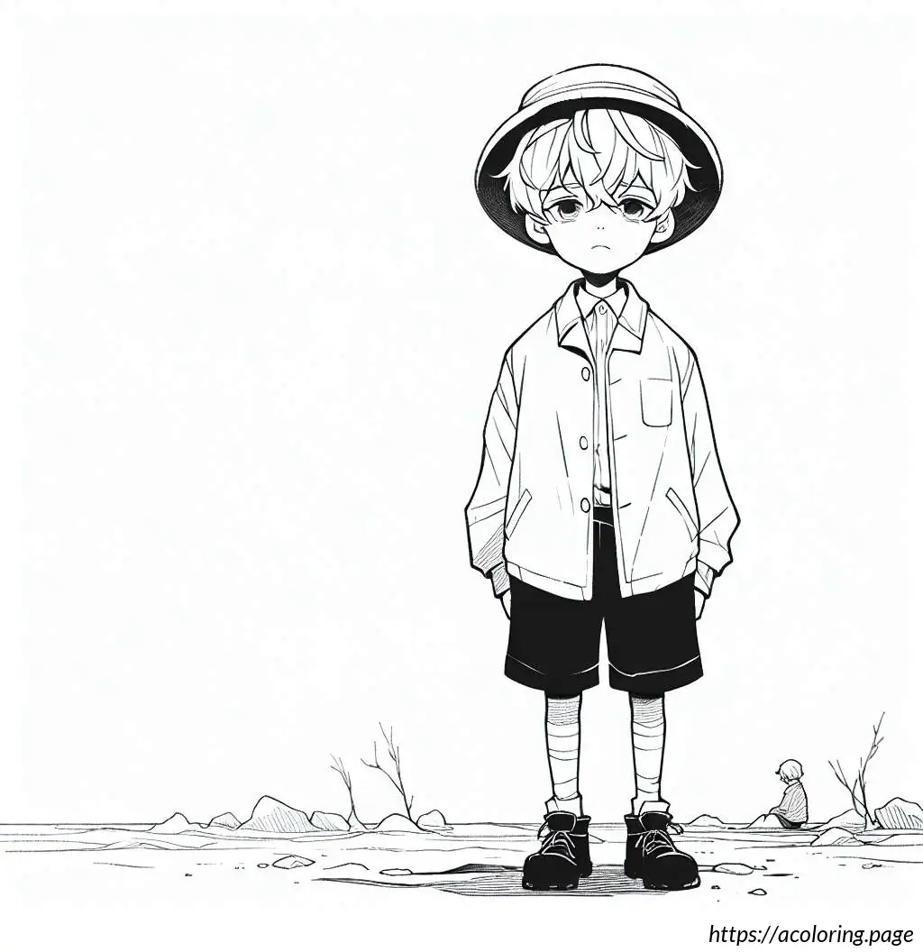 This image is a black and white line drawing of a cartoon character resembling a safari explorer or adventurer. The character is depicted as a young boy with wavy hair and a mustache, wearing a safari outfit. He is outfitted with a brimmed hat, a neckerchief tied at the front with a knot, an unbuttoned long-sleeve shirt over a T-shirt, shorts, and laced-up boots. The character is standing with arms spread slightly and a smile on his face, showing a friendly demeanor. The background suggests that he might be standing on grass, as indicated by the jagged line detailing at the bottom of the frame. The overall drawing is simple and appears designed for coloring activities, given its clear outlines and ample white space.