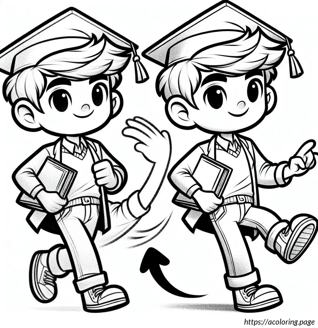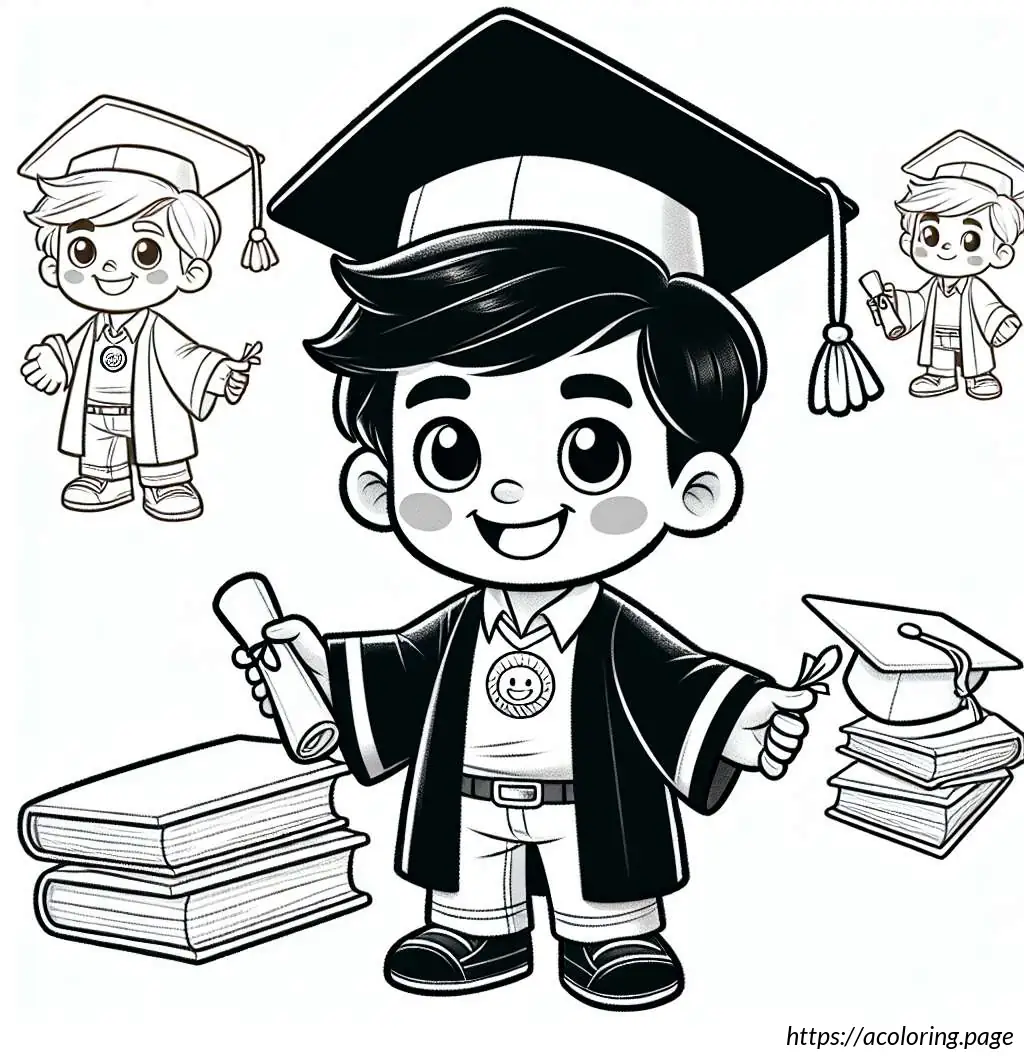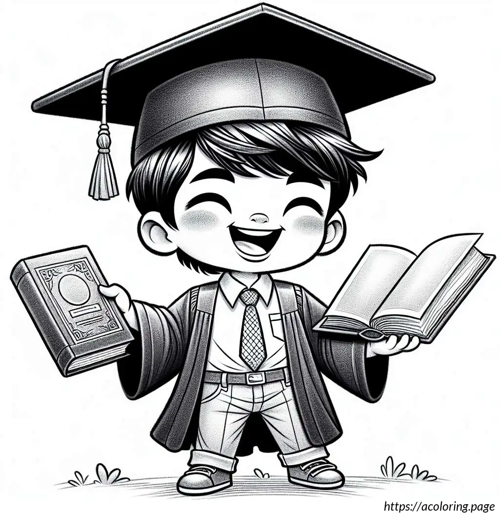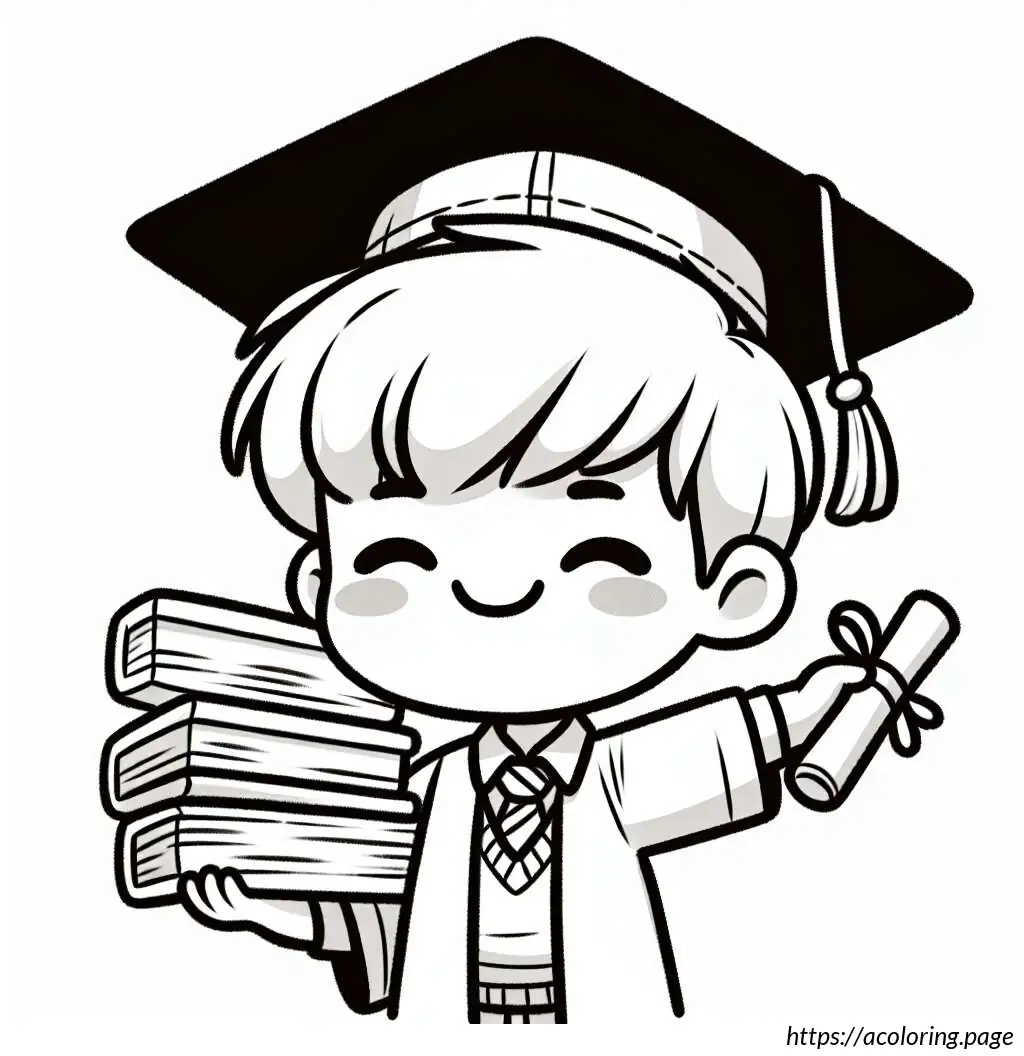 The image depicts a cartoon of a young boy dressed as a graduate. He wears a graduation cap and a casual t-shirt featuring a simple emblem, which looks like a depiction of another face. He holds several books in one arm and has a cheerful expression on his face. The character also holds a diploma in his other hand, symbolizing academic achievement. He is wearing loose-fitting pants and simple shoes. The drawing is a black and white line art, suitable for coloring activities.