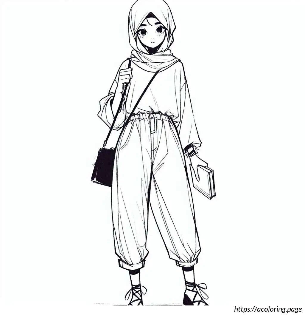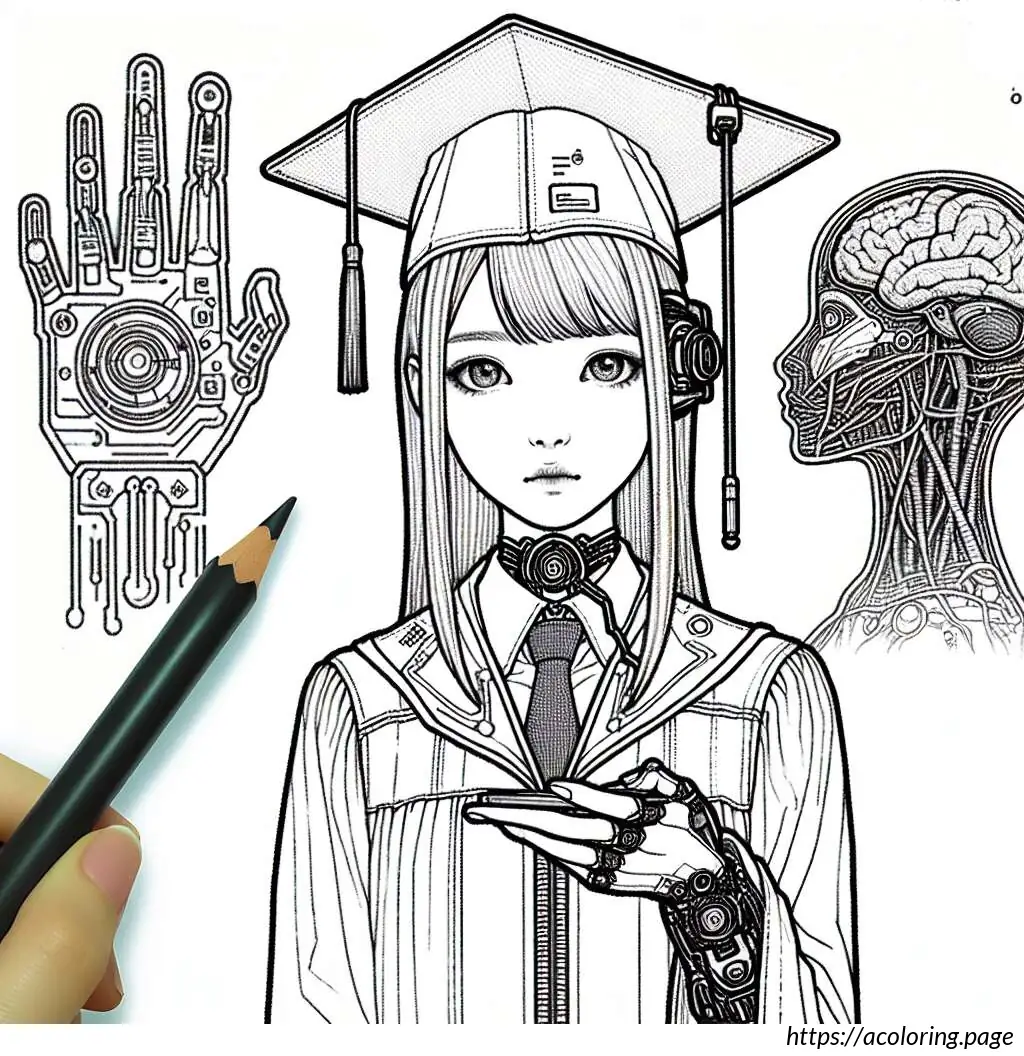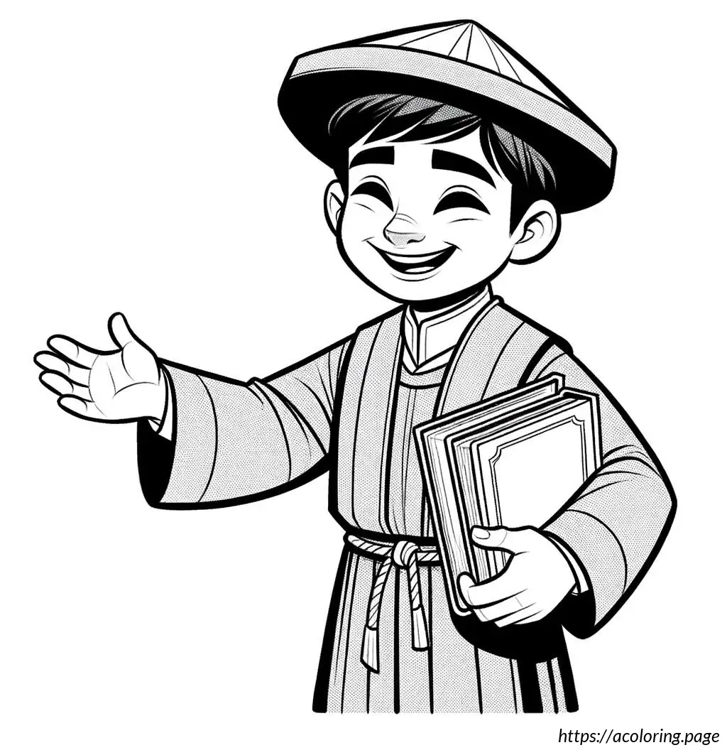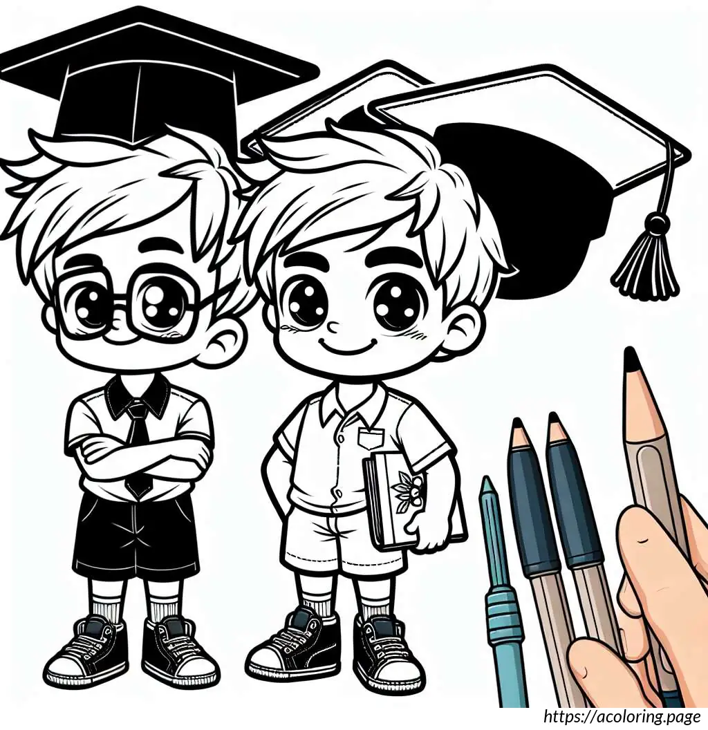 The image depicts a cartoon of a young boy dressed as a graduate. He wears a graduation cap and a casual t-shirt featuring a simple emblem, which looks like a depiction of another face. He holds several books in one arm and has a cheerful expression on his face. The character also holds a diploma in his other hand, symbolizing academic achievement. He is wearing loose-fitting pants and simple shoes. The drawing is a black and white line art, suitable for coloring activities.