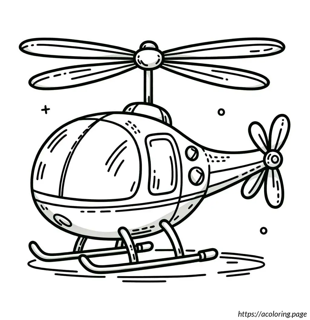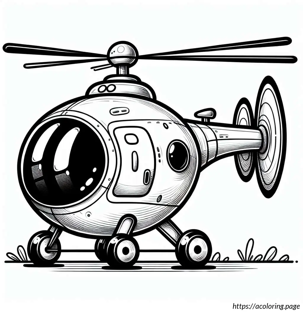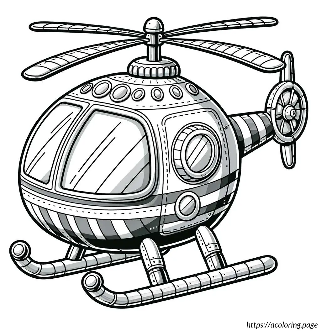 This image features a stylized illustration of a helicopter. The helicopter is depicted with a large, bulbous body and has stripes running horizontally along the lower portion. It includes a single door visible on the side, circular windows, and is supported by small, simplistic wheels. At the top, there’s a rotor composed of two blades creating a motion effect, and at the tail end, there’s a smaller rotor to indicate the tail rotor of the helicopter. The design is cartoonish with bold, smooth lines, making it appear friendly and simplified. The overall layout and elements suggest this illustration could be intended for a children’s book or similar media.