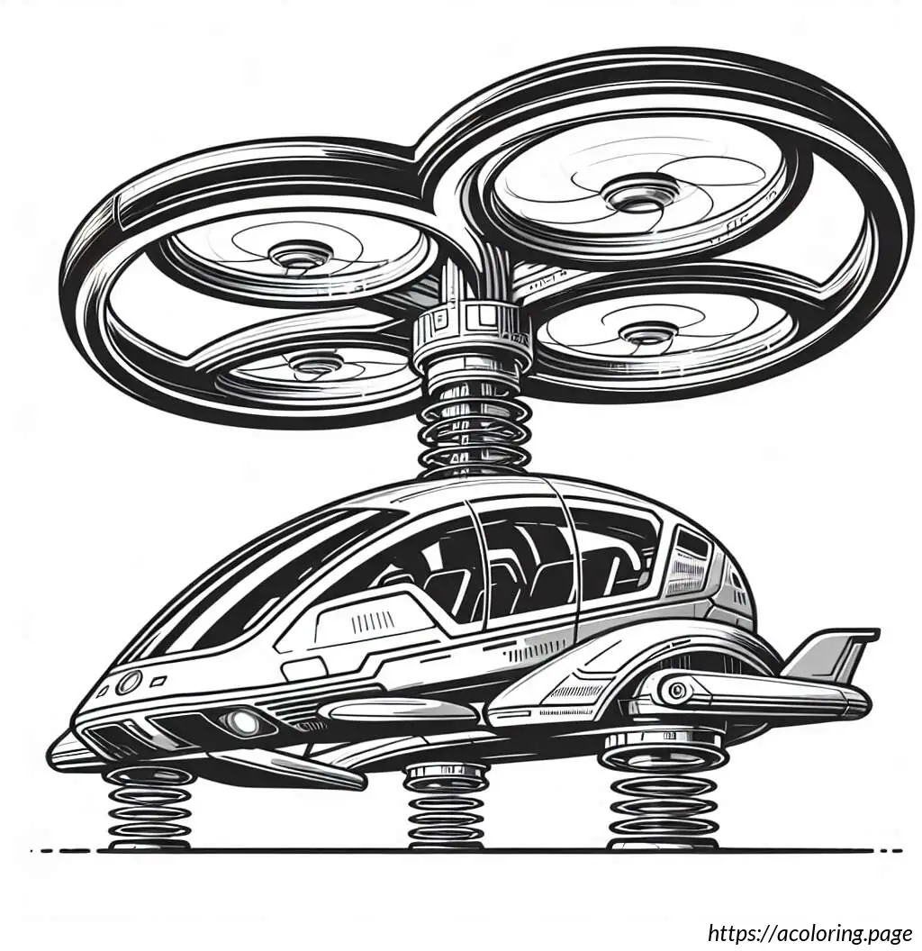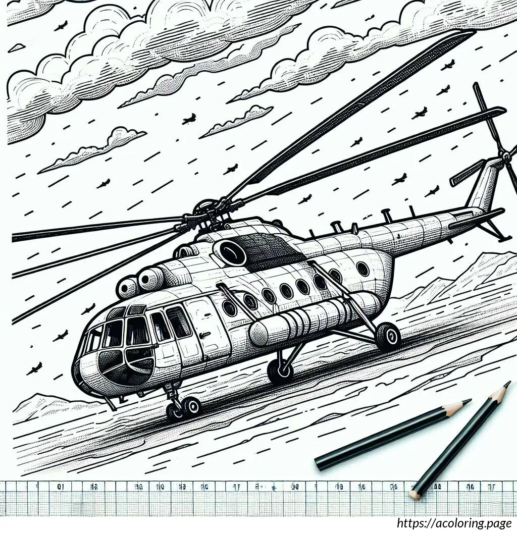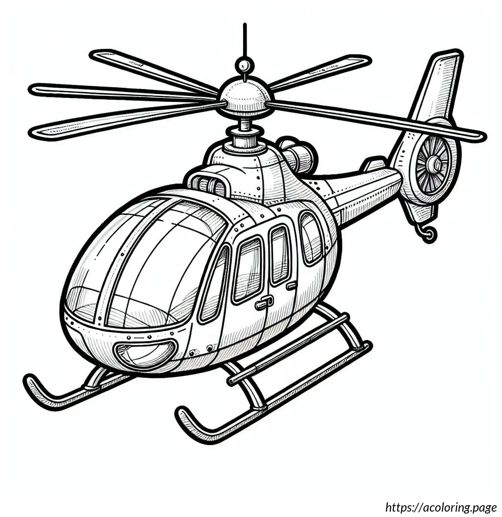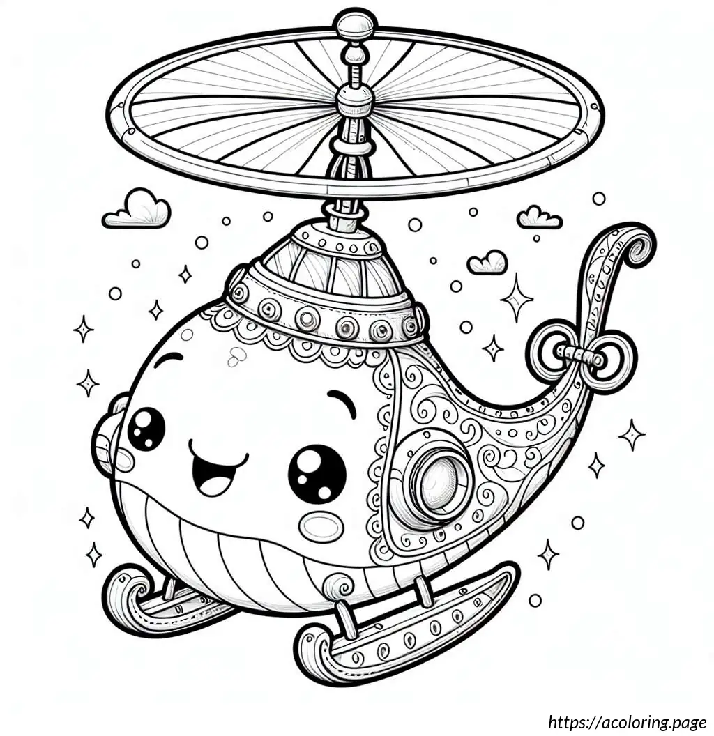 This image features a stylized illustration of a helicopter. The helicopter is depicted with a large, bulbous body and has stripes running horizontally along the lower portion. It includes a single door visible on the side, circular windows, and is supported by small, simplistic wheels. At the top, there’s a rotor composed of two blades creating a motion effect, and at the tail end, there’s a smaller rotor to indicate the tail rotor of the helicopter. The design is cartoonish with bold, smooth lines, making it appear friendly and simplified. The overall layout and elements suggest this illustration could be intended for a children’s book or similar media.