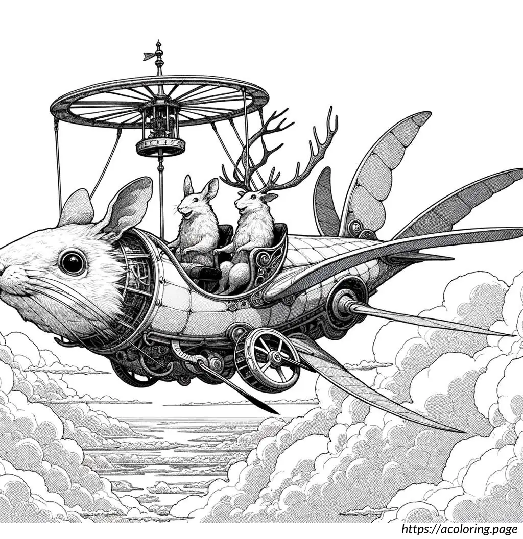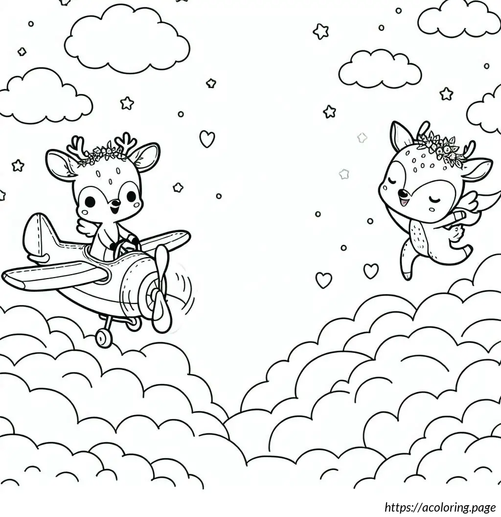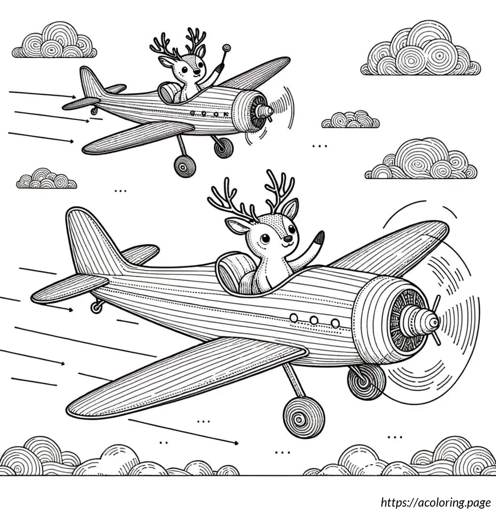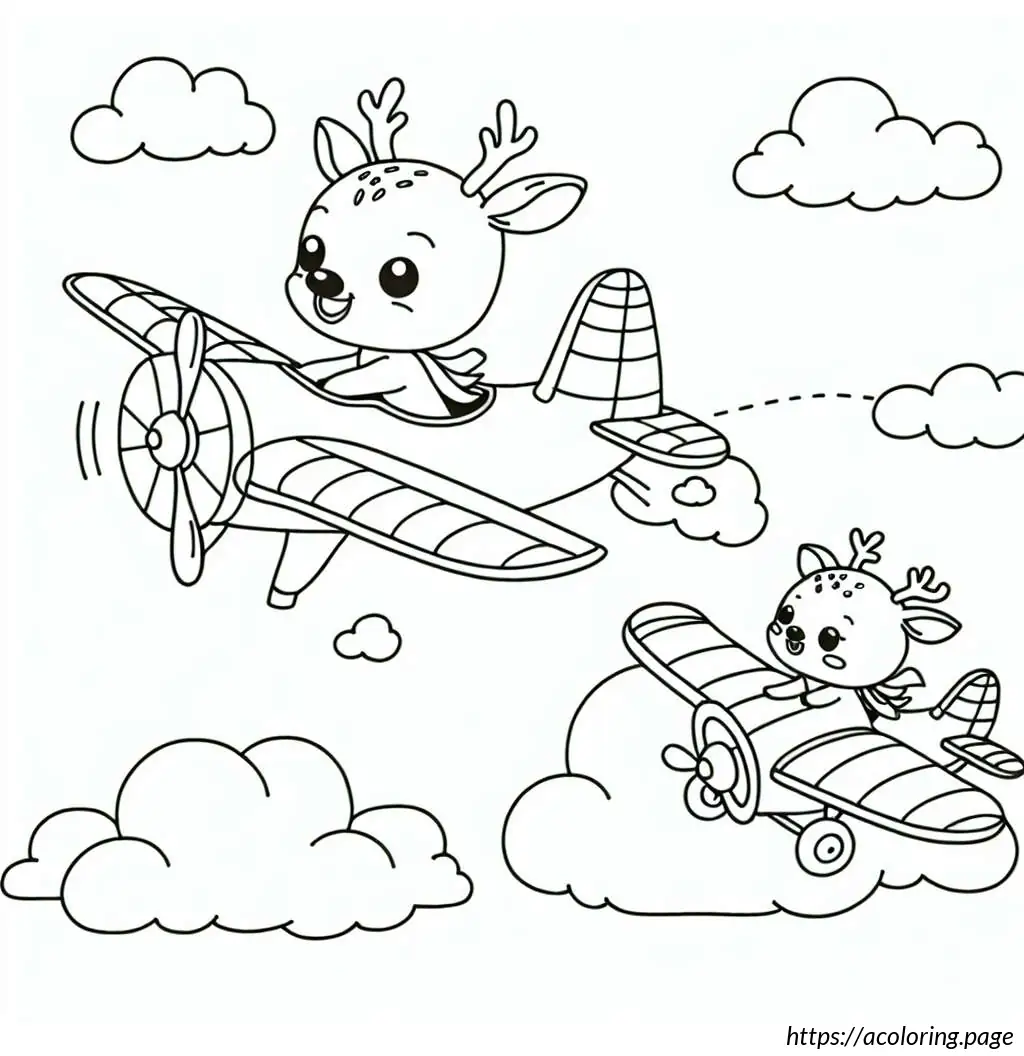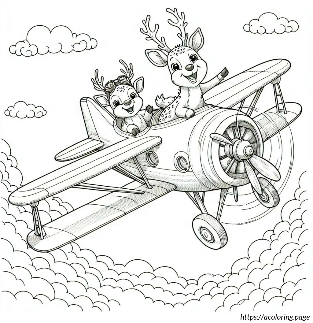 The first deer-like creature at the front appears to be piloting the plane. It has an elongated, slightly pointed face, resembling a typical cartoon depiction of an animal with a pilot’s demeanor. This character seems quite engaged in flying, with one hand raised as if it’s maneuvering the controls. The second character, positioned behind the pilot, features a joyful expression with its arms raised, as if delighted by the flight, waving cheerfully. Both characters are adorned with small, rounded antlers, adding to their deer-like appearance.