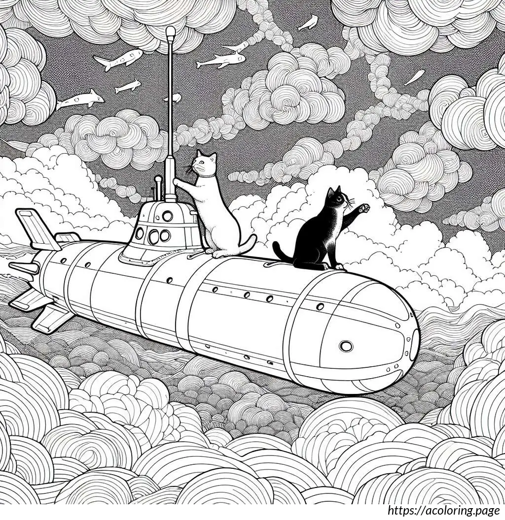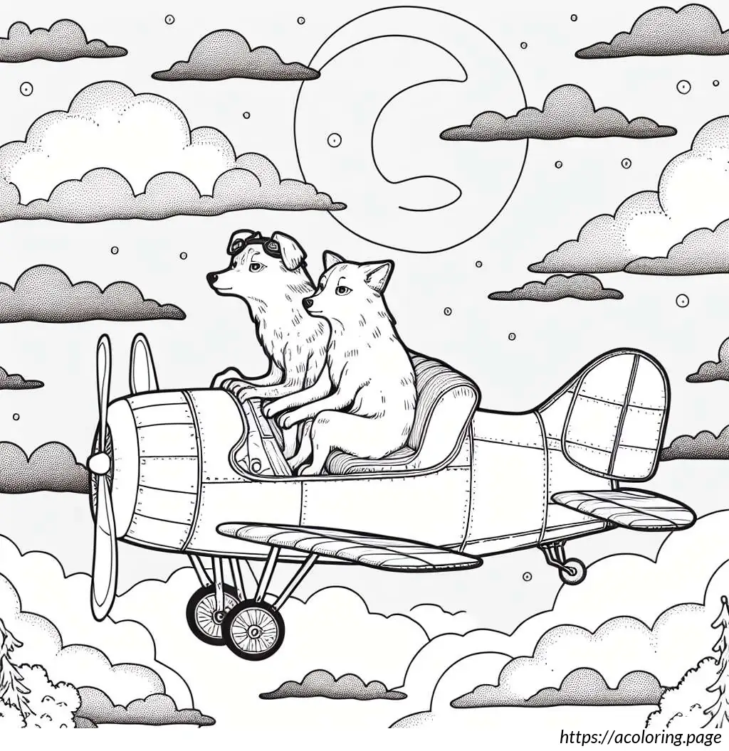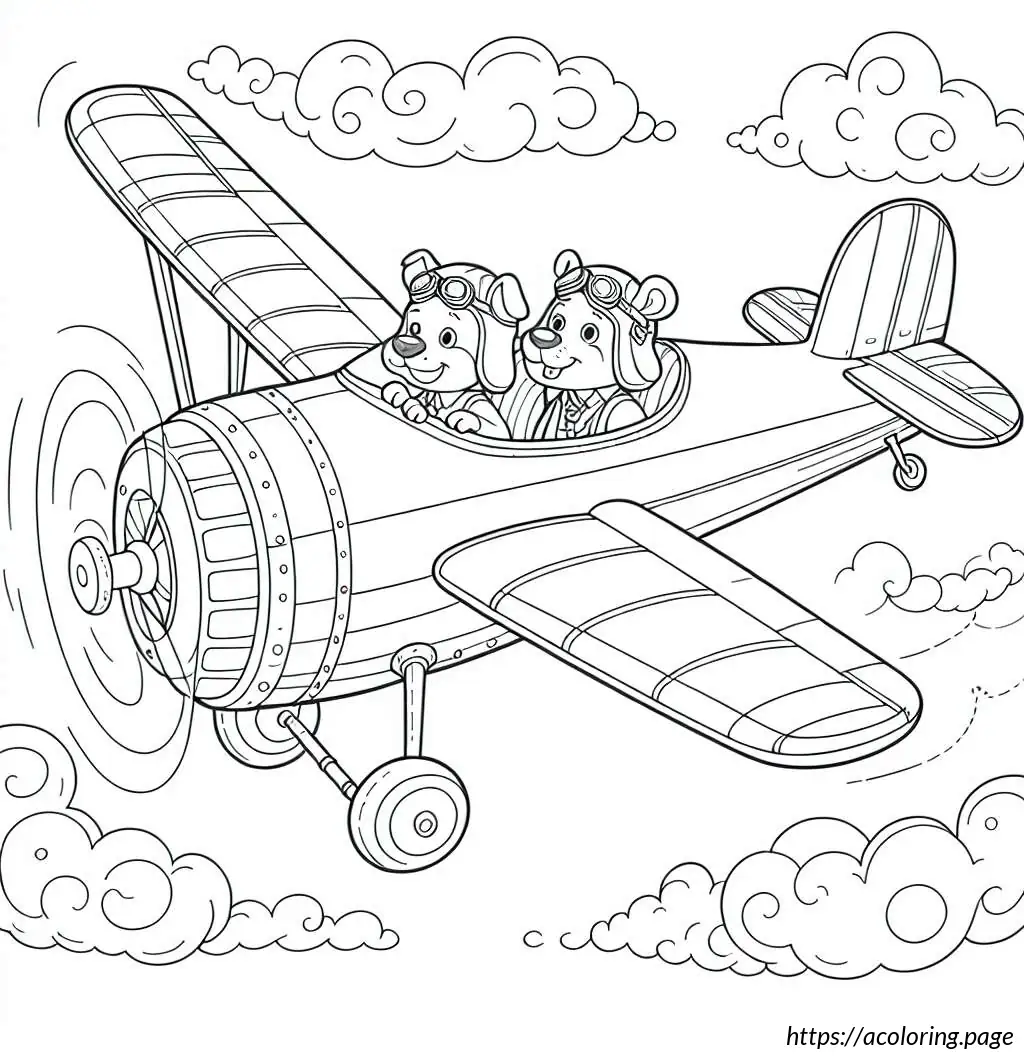 The background is minimalistic, with a few clouds sporadically placed around the airplane, enhancing the theme of flying high in the sky. The overall style is clean and outlines with no fill, typical of a coloring book illustration.