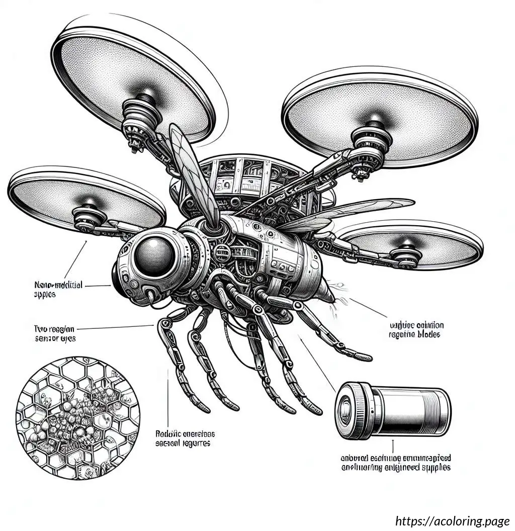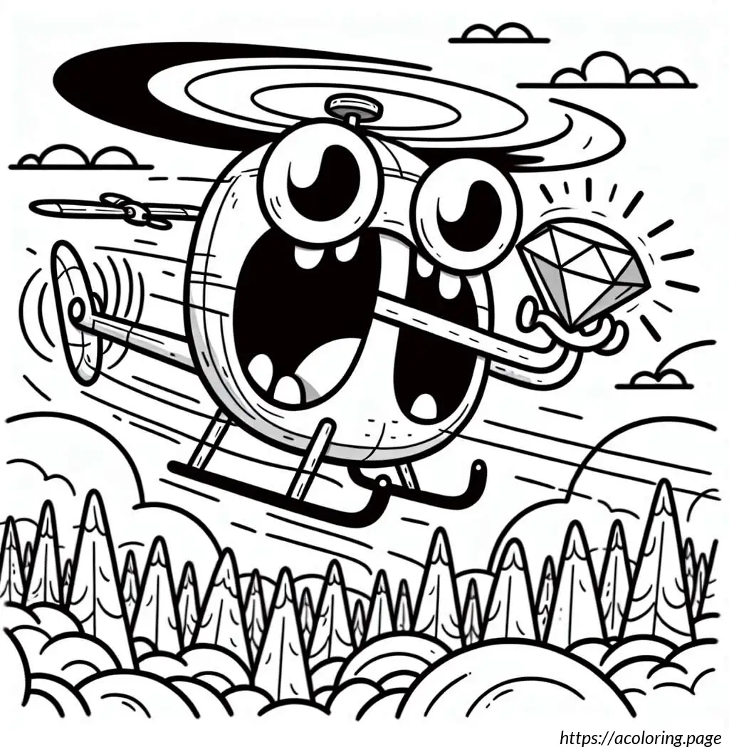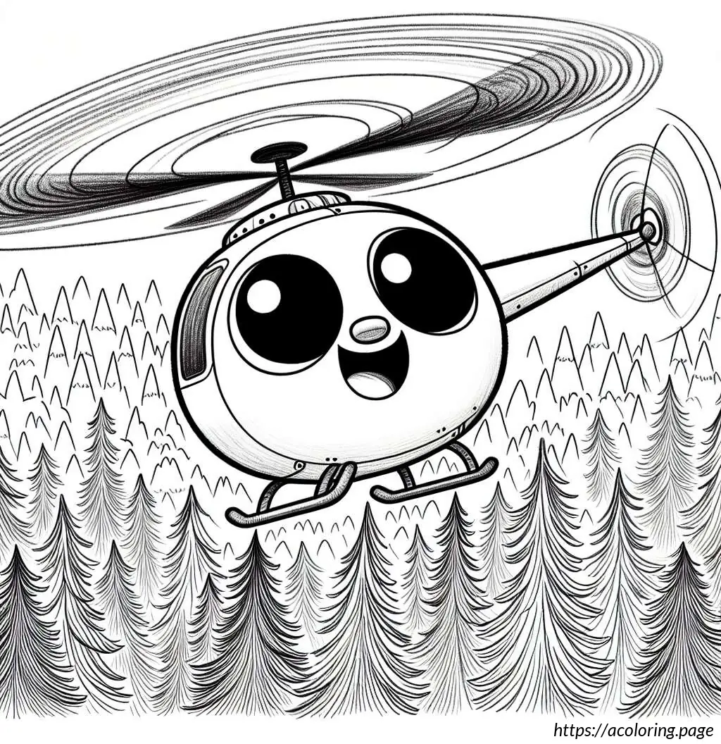 This image shows a cartoon-style drawing that features a helicopter with a whimsical and playful design. The helicopter appears to have a face, with eyes looking forward and a side-mounted mouth expressing surprise or shout. It has mechanical components such as rotors on the top and tail, depicted in a simplified and comic style that suggests rapid motion, evident from the lines indicating movement around the rotors.