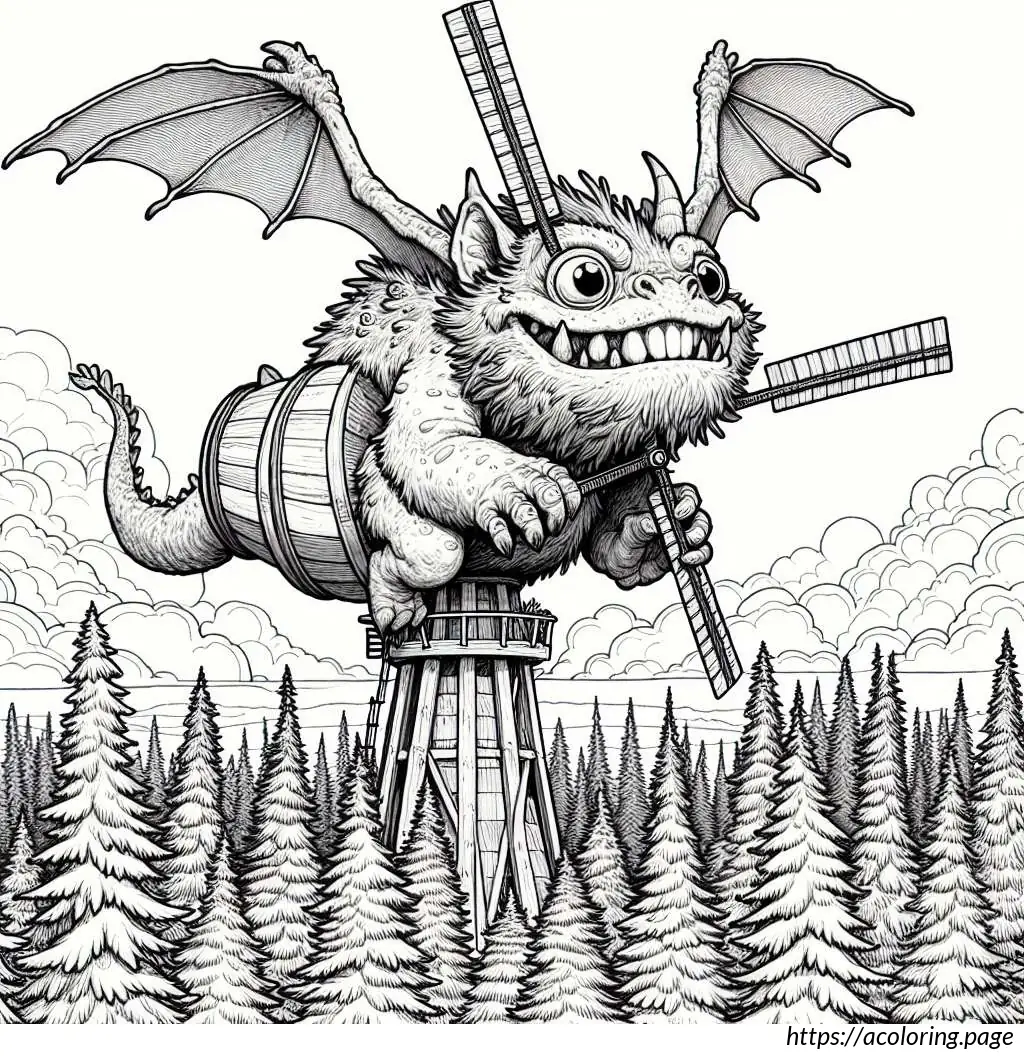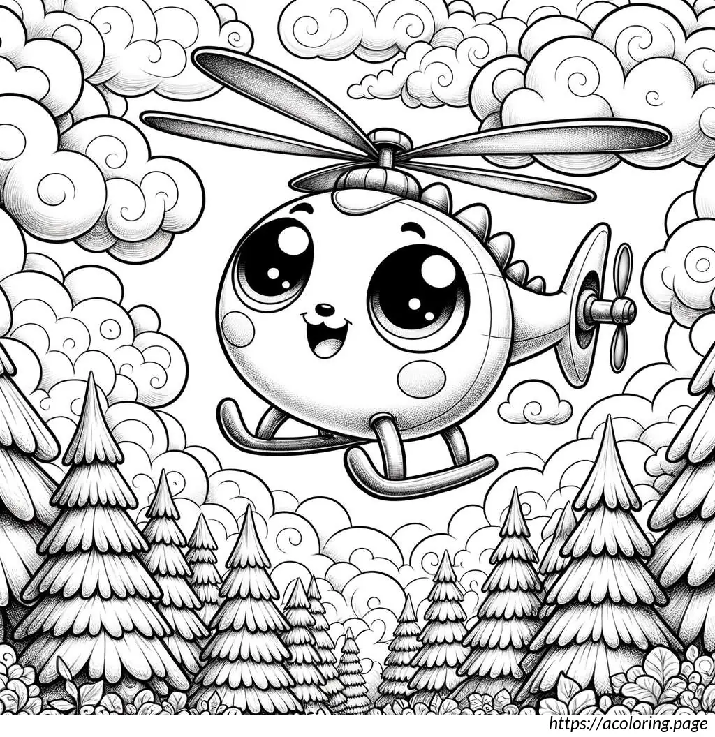 The helicopter is carrying a bucket filled with water, which is spilling as it flies. Below the helicopter, there are clouds indicating the helicopter is at a high altitude, and beneath the clouds, a series of pine trees can be seen, suggesting the setting is a forested or mountainous area. The simple line art and absence of color enhance the cartoonish aesthetic, making it suitable for a coloring activity or children’s illustration.