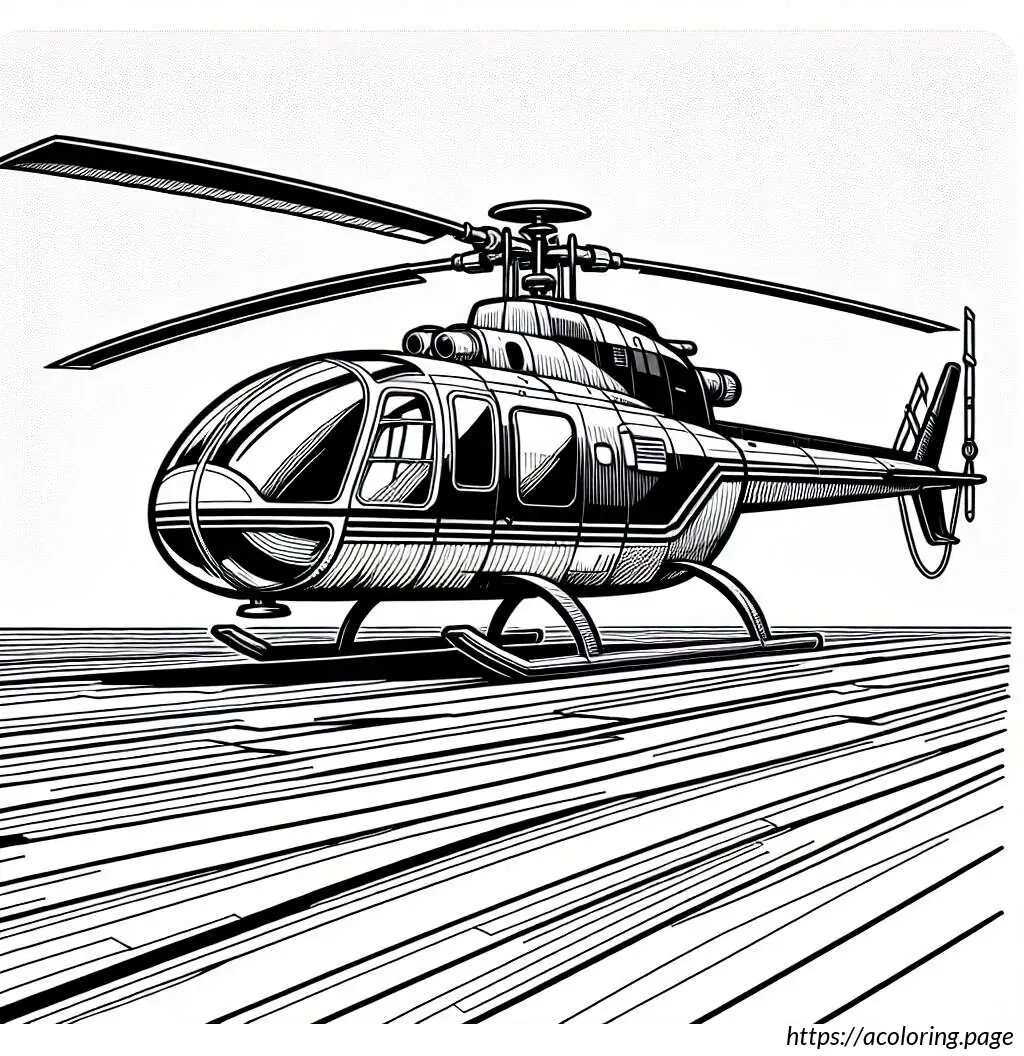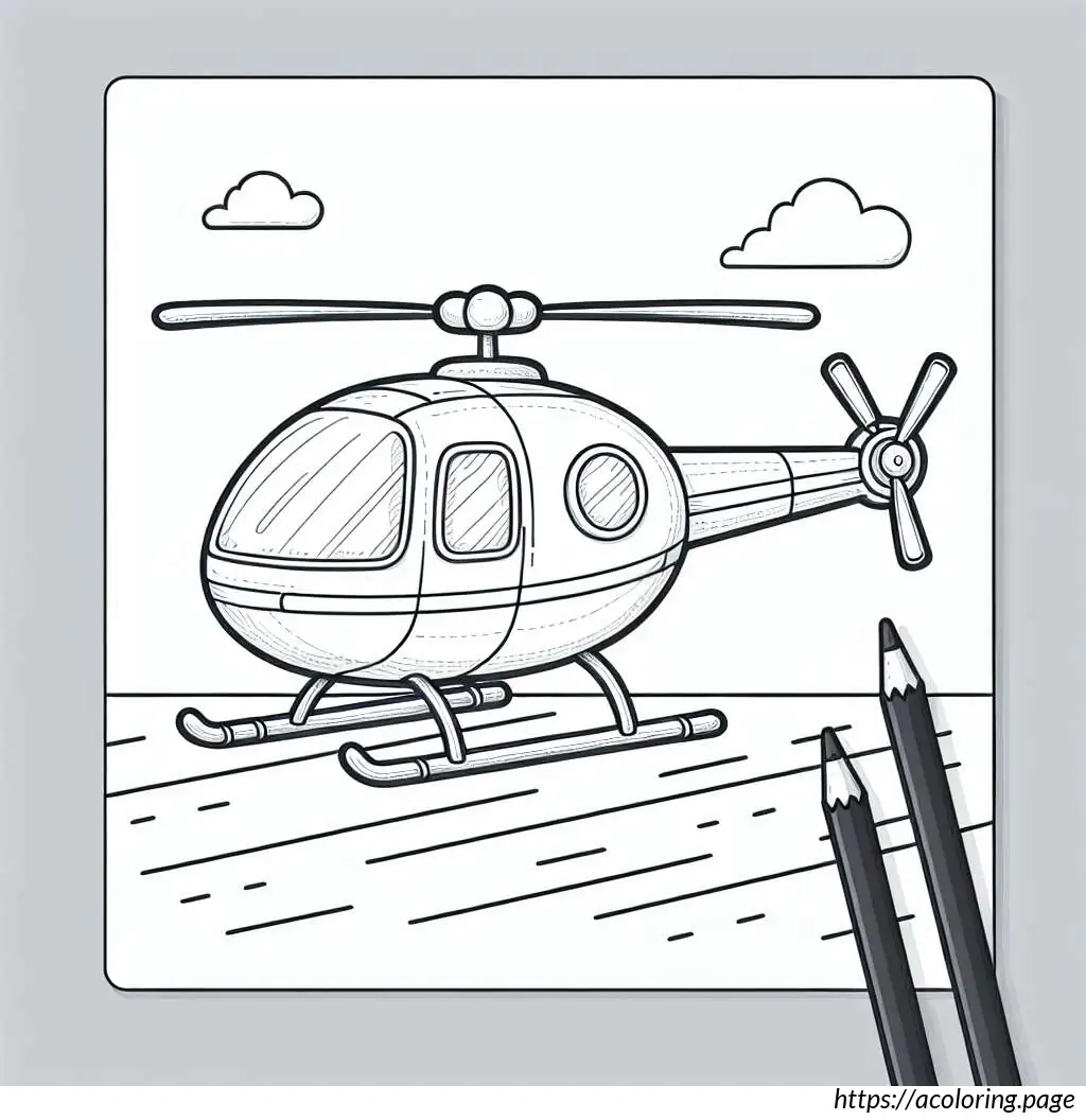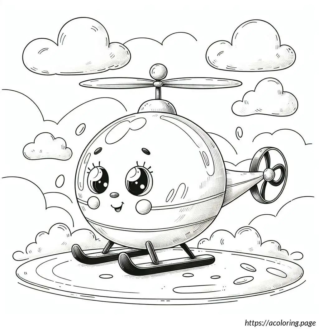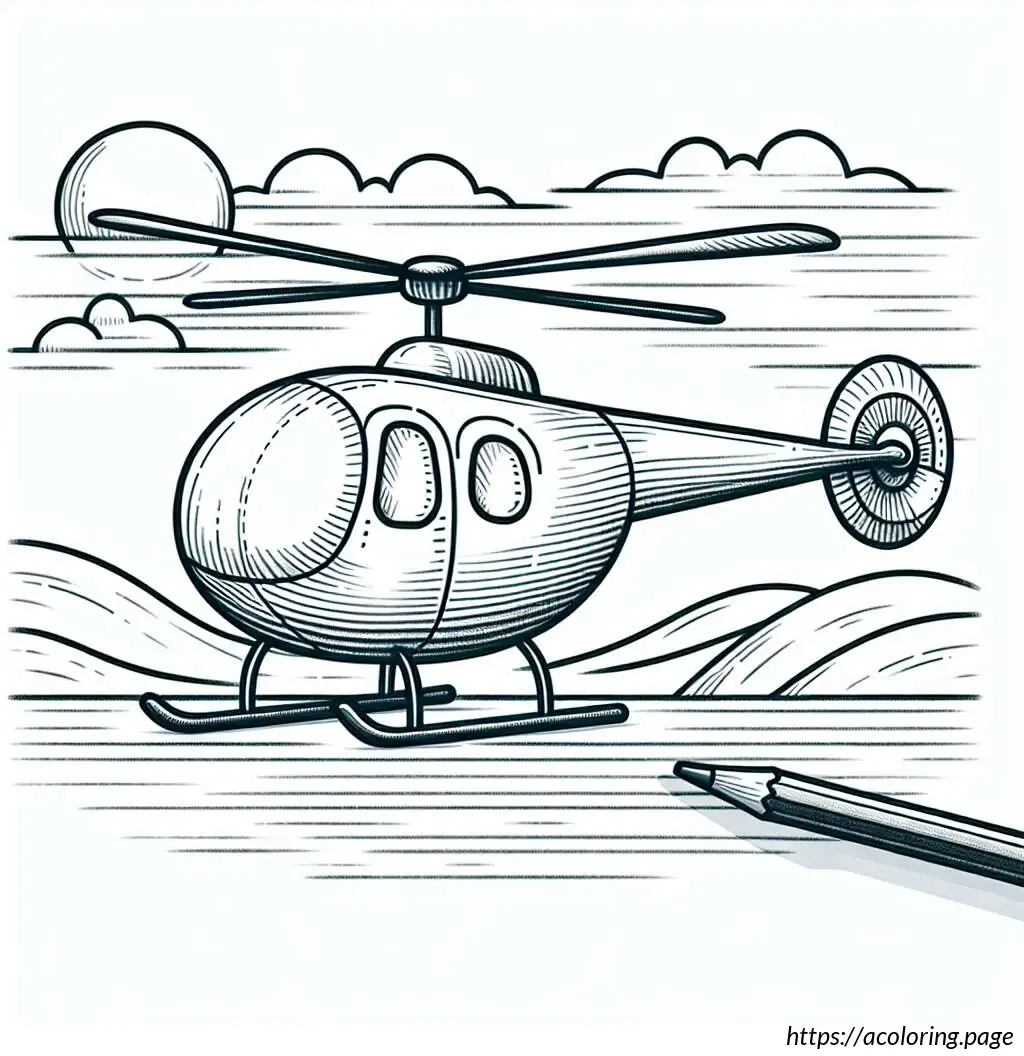 This image is a simple line drawing of a helicopter. The helicopter is depicted with a large, rounded main body and a smaller, circular tail section. Above the main body, there are two rotor blades that are horizontally aligned. The tail has a singular vertical rotor at its end. The helicopter is resting on two skids which serve as its landing gear. The background consists of simple, horizontal lines suggesting a flat surface or horizon, contributing to the minimalistic style of the illustration. The overall design is stylized and cartoonish, primarily outlined in black with no interior details or shading.