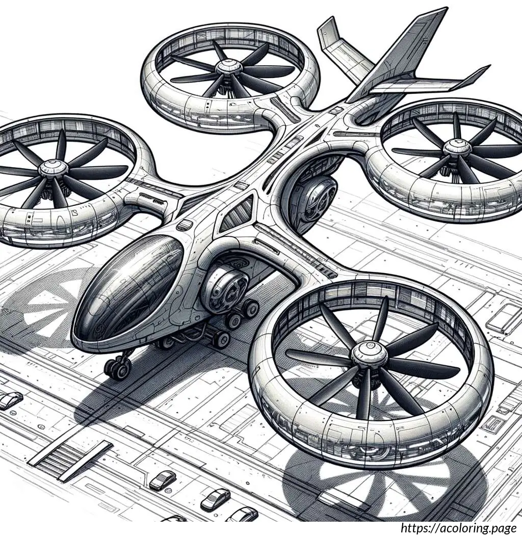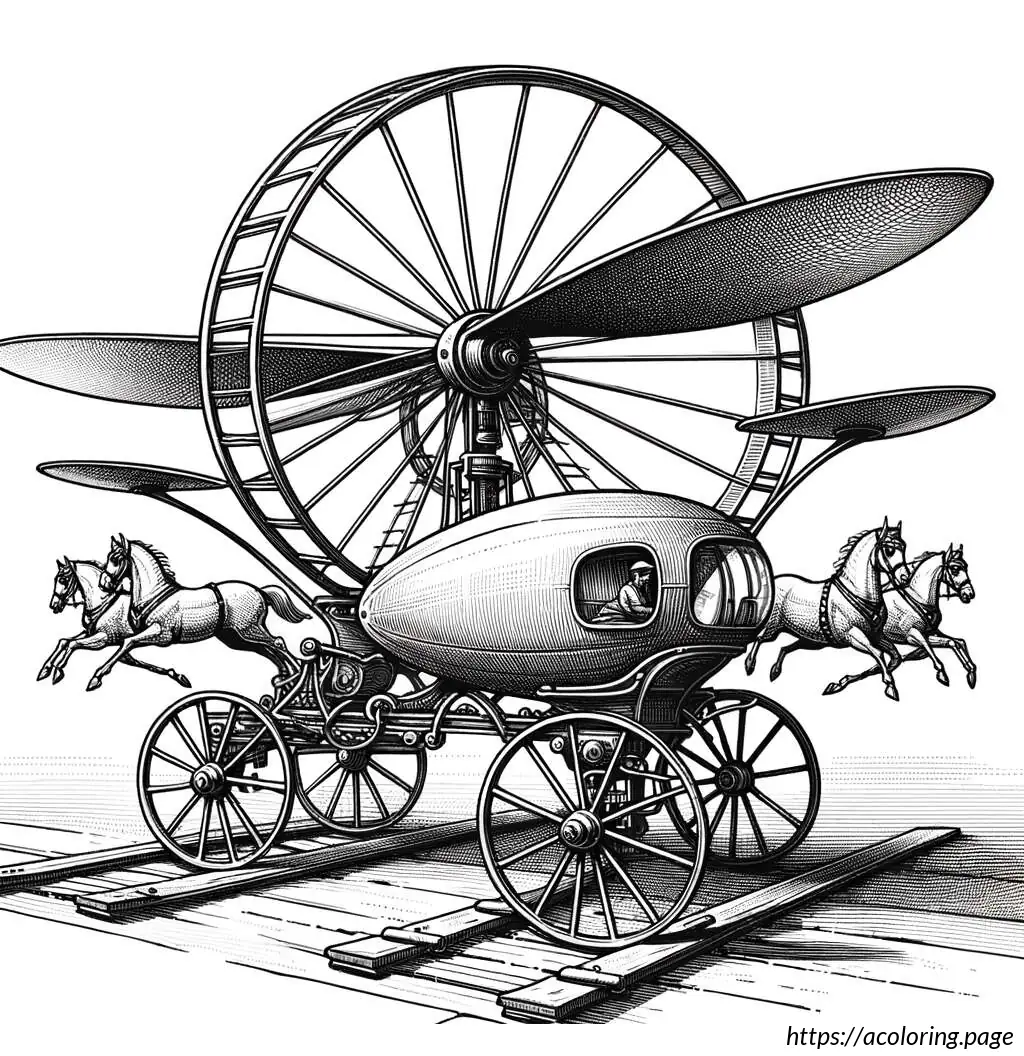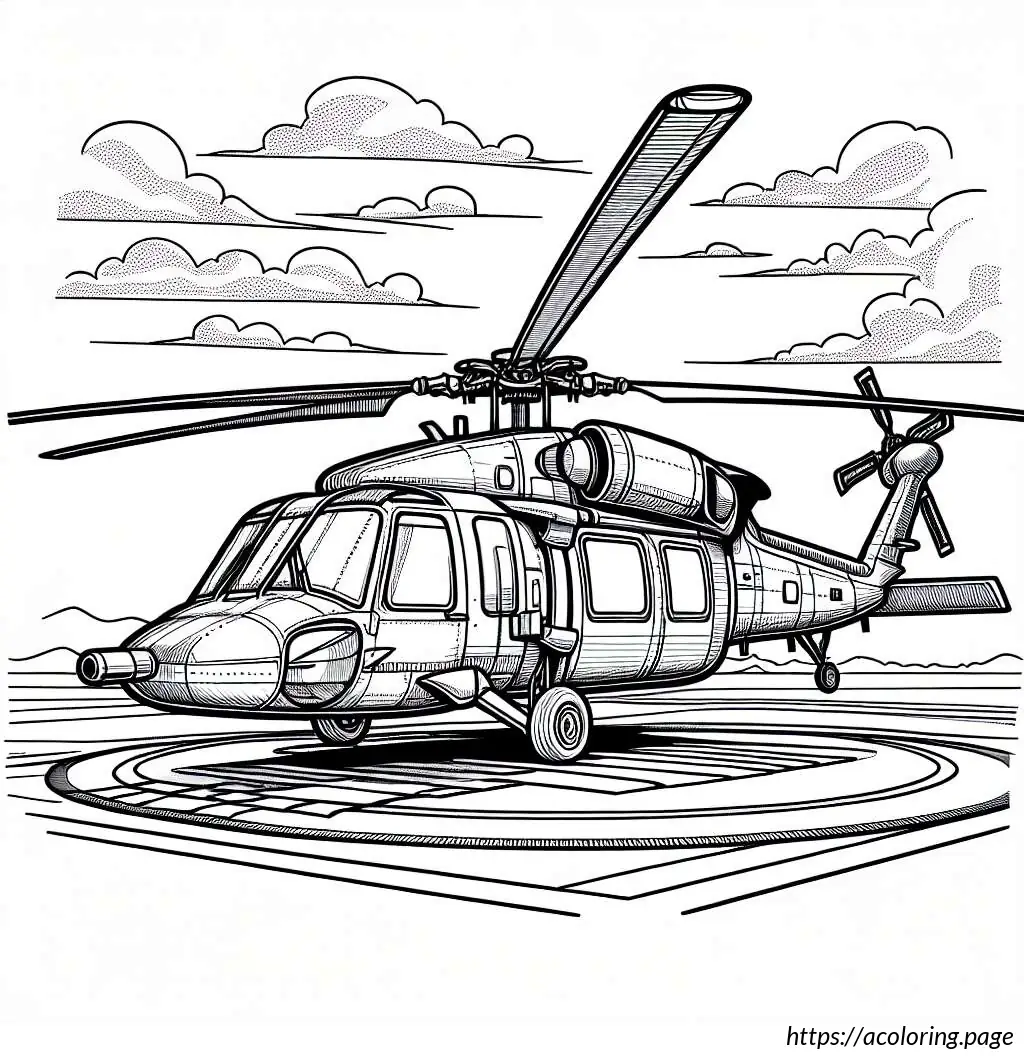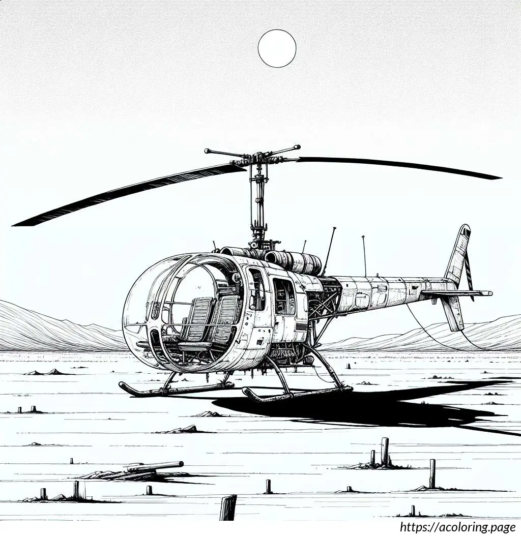 This image is a simple line drawing of a helicopter. The helicopter is depicted with a large, rounded main body and a smaller, circular tail section. Above the main body, there are two rotor blades that are horizontally aligned. The tail has a singular vertical rotor at its end. The helicopter is resting on two skids which serve as its landing gear. The background consists of simple, horizontal lines suggesting a flat surface or horizon, contributing to the minimalistic style of the illustration. The overall design is stylized and cartoonish, primarily outlined in black with no interior details or shading.