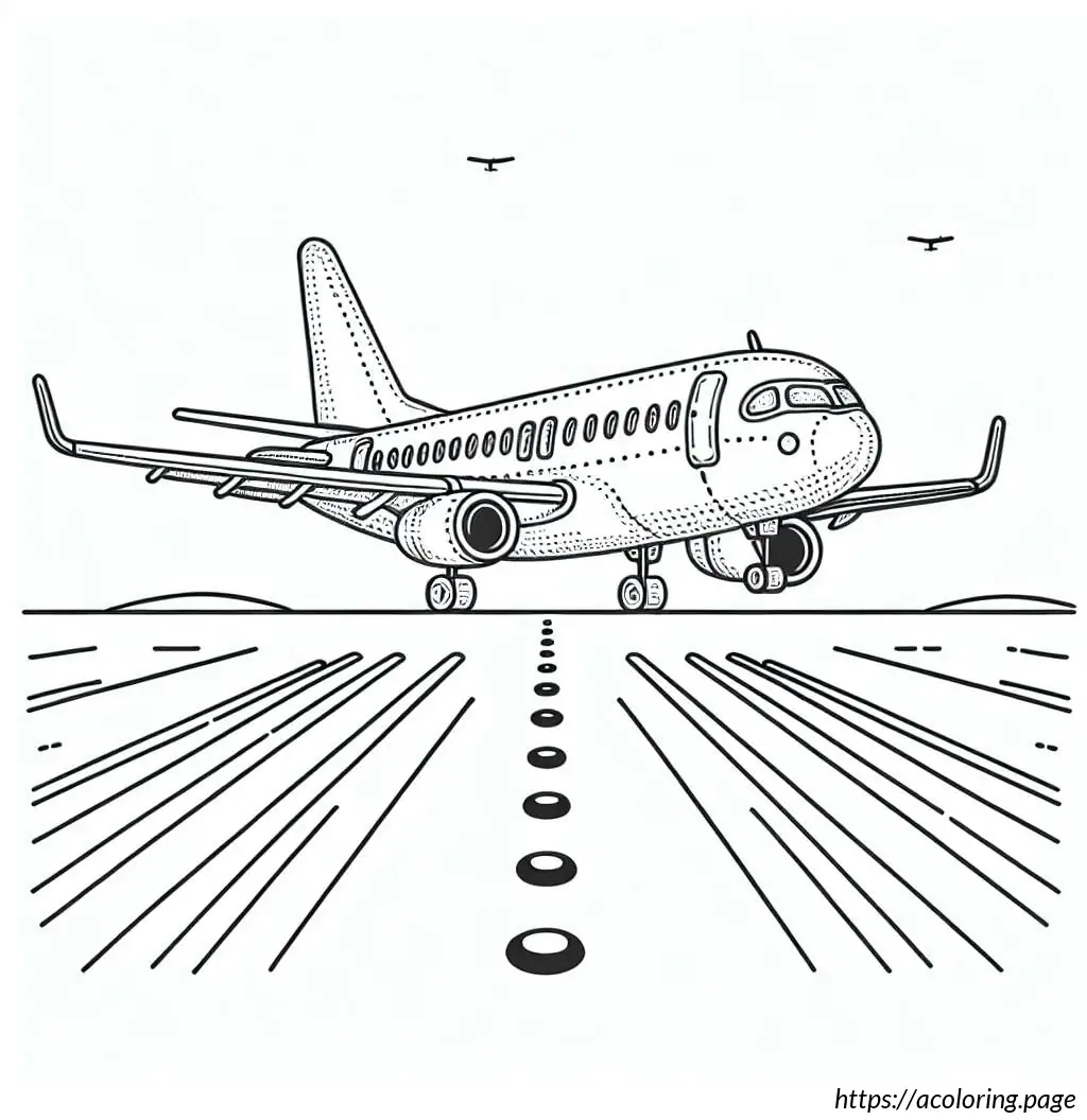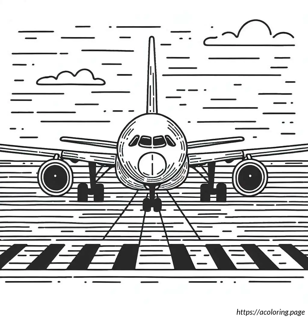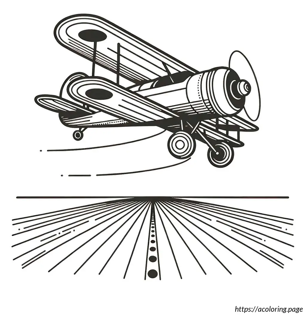 This image features a simple line drawing of an airplane on a runway. The airplane is depicted in a cartoonish or basic illustrative style, characterized by its rounded body and cockpit. It has two main wings attached to the center of its fuselage, and a tail with one vertical stabilizer at the back. The aircraft is equipped with landing gear that includes wheels visible under the wings and possibly under the body of the plane. There are circles or dots on the plane that likely represent windows or design details. The airplane appears to be positioned on a runway, indicated by the horizontal lines in the background, suggesting a perspective of either taking off or landing. The image uses bold, black outlines with no shading or color, giving it a clean and straightforward appearance.