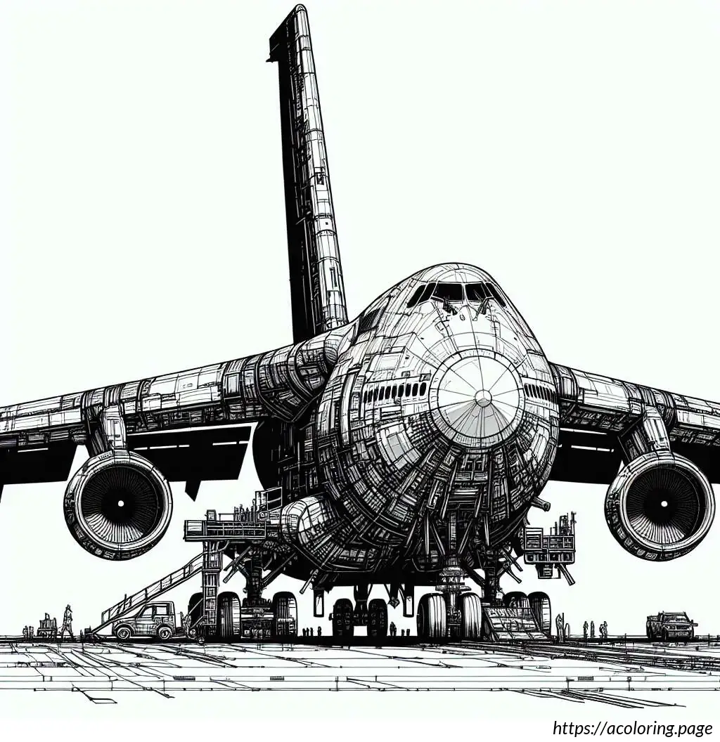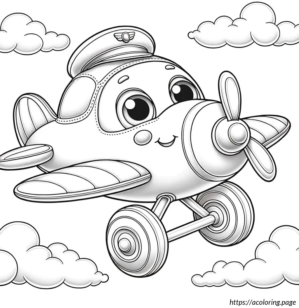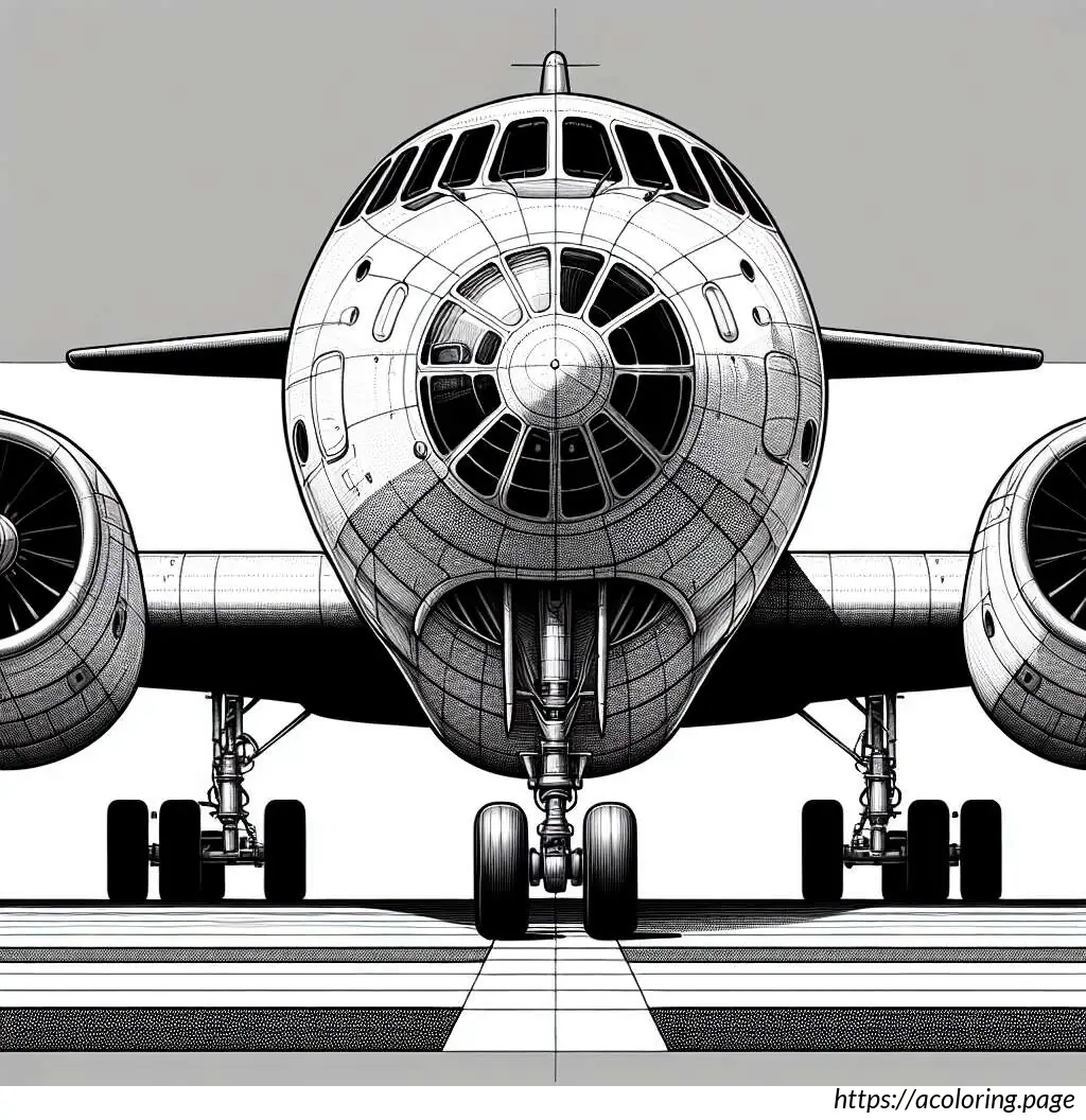This image features a simple line drawing of an airplane on a runway. The airplane is depicted in a cartoonish or basic illustrative style, characterized by its rounded body and cockpit. It has two main wings attached to the center of its fuselage, and a tail with one vertical stabilizer at the back. The aircraft is equipped with landing gear that includes wheels visible under the wings and possibly under the body of the plane. There are circles or dots on the plane that likely represent windows or design details. The airplane appears to be positioned on a runway, indicated by the horizontal lines in the background, suggesting a perspective of either taking off or landing. The image uses bold, black outlines with no shading or color, giving it a clean and straightforward appearance.