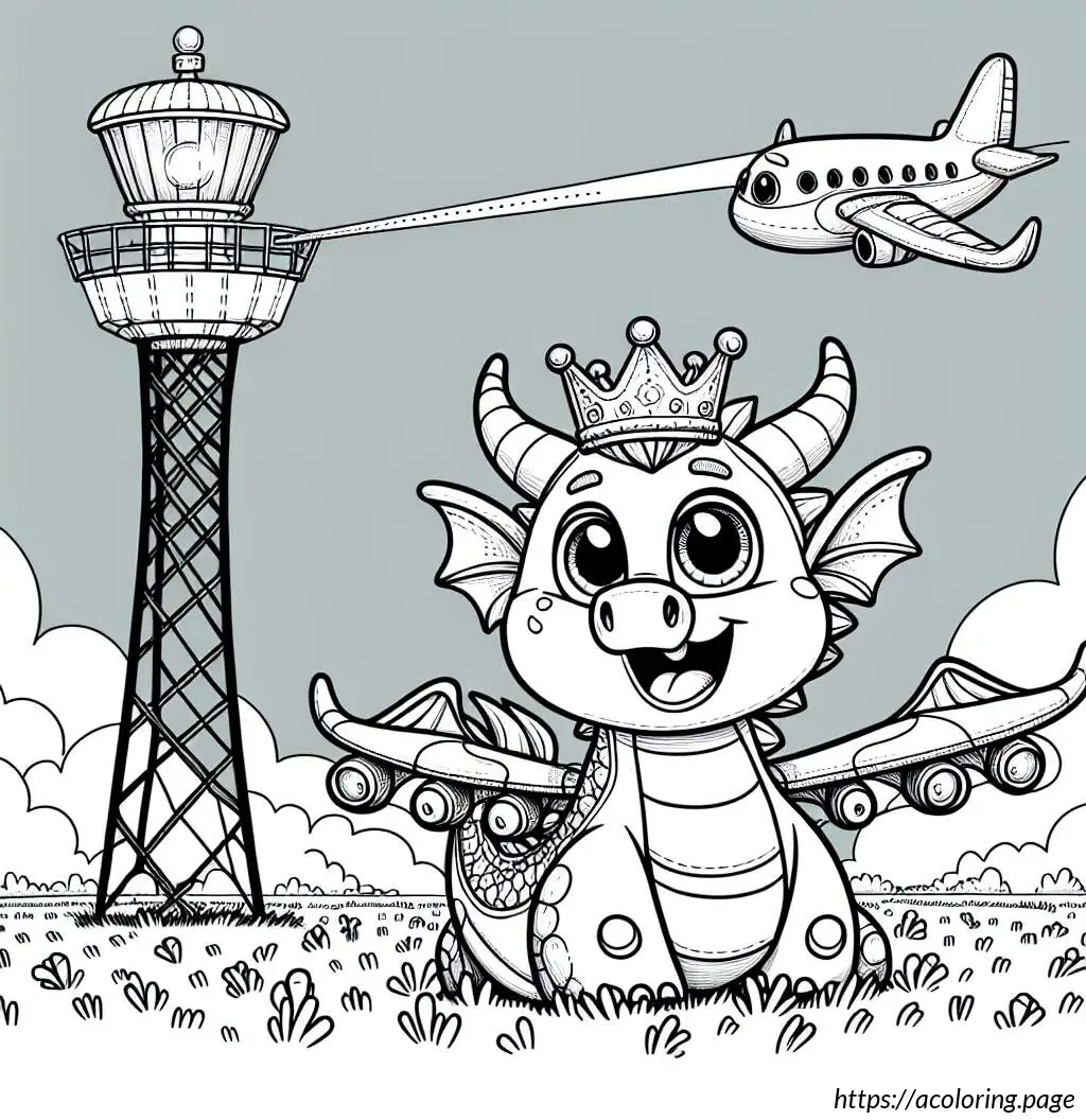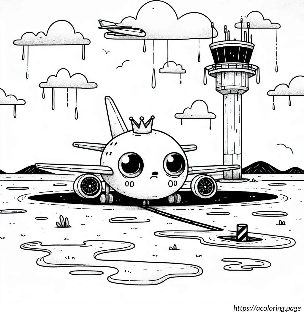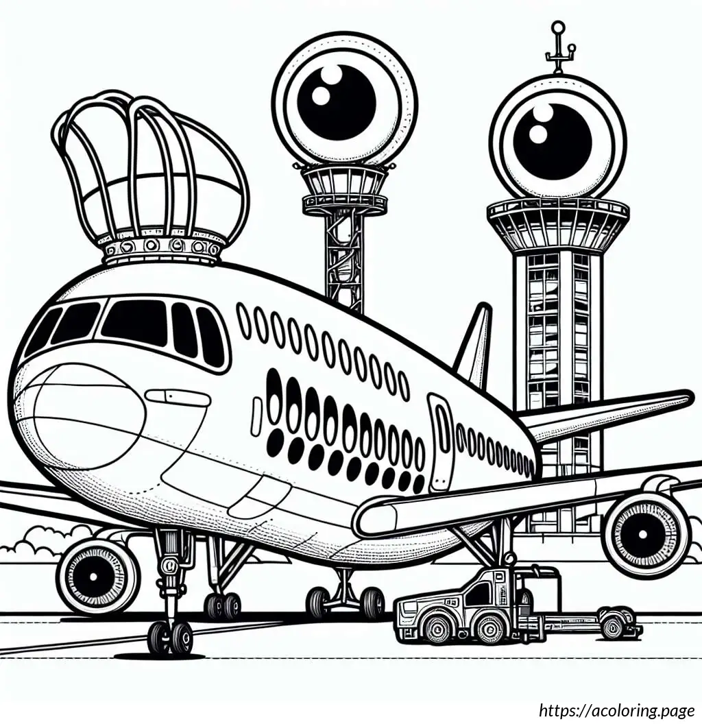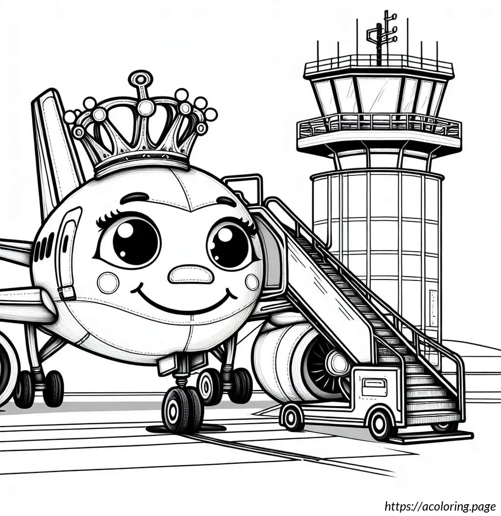 This image features a whimsical drawing of an airplane, characterized with an anthropomorphic face, giving it a cartoonish appearance. The airplane has eyes, a nose, and a smiling mouth, adding personality and a friendly demeanor to the aircraft. It also sports a crown-like element on the top of its head, suggesting a royal or distinguished theme.