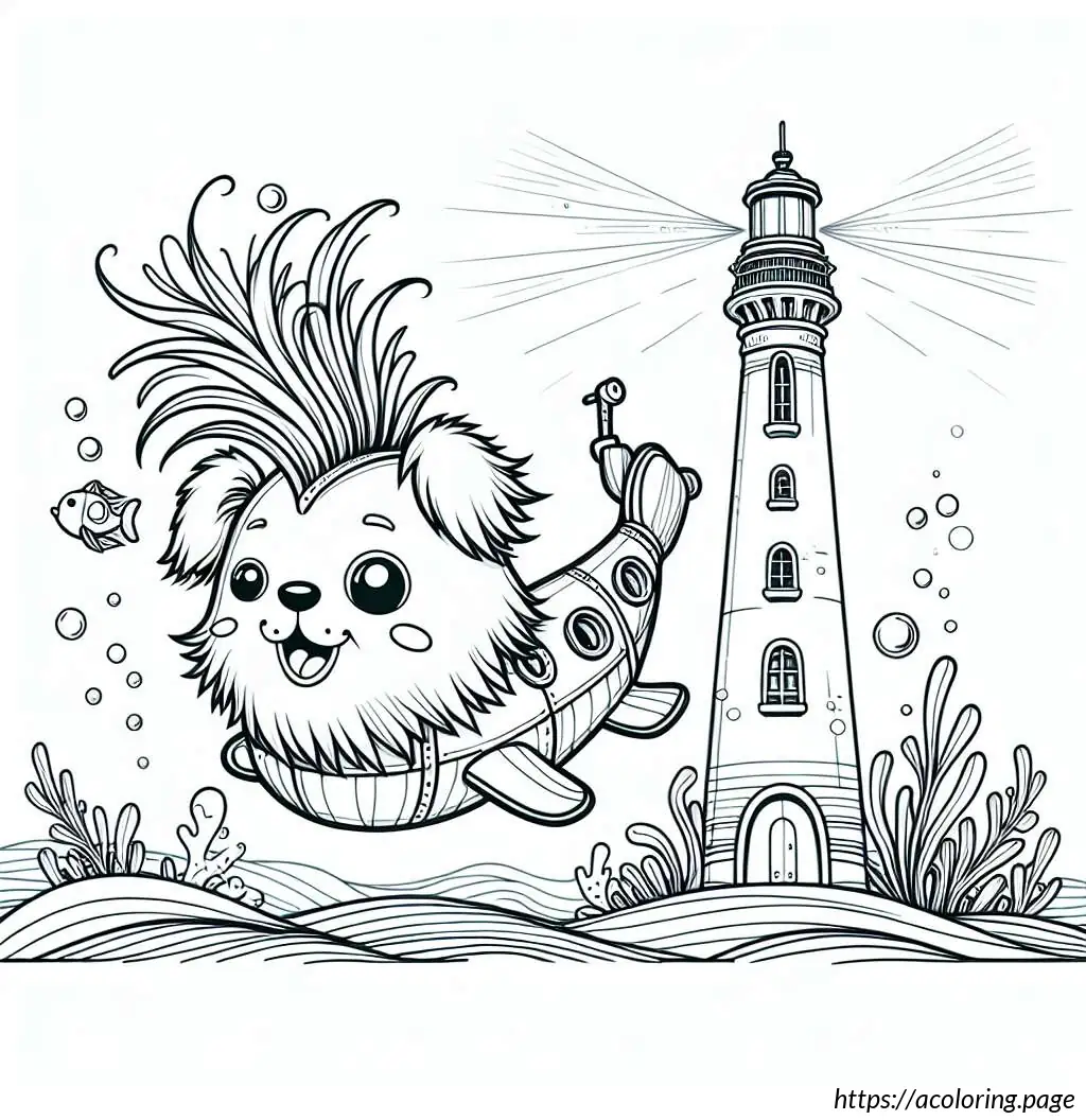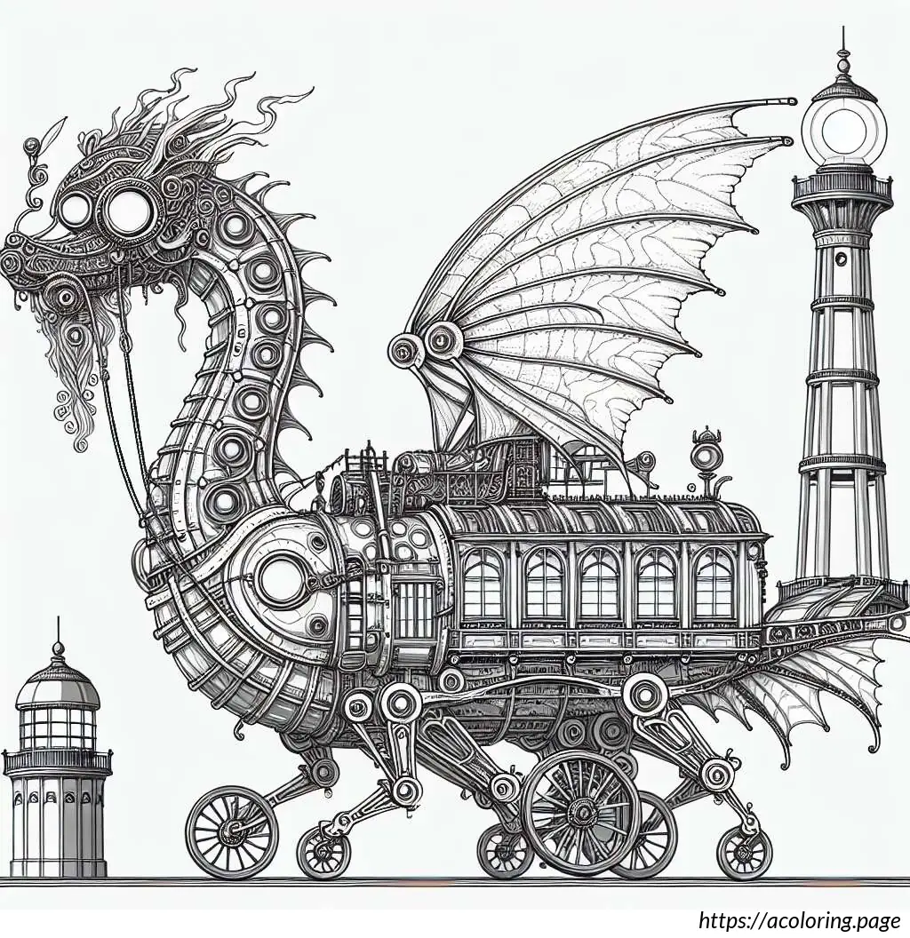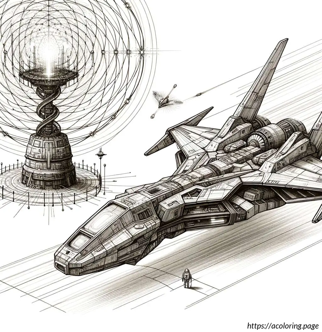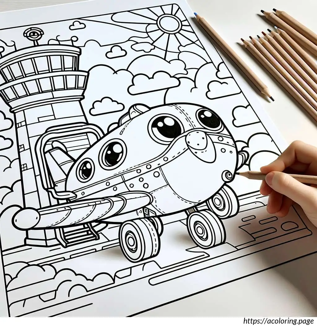 The overall style of the drawing is simple and bold, using black outlines with no shading or color, resembling a coloring book format. The scene is likely intended to be engaging and friendly, possibly aimed at children, evoking a sense of adventure and travel.