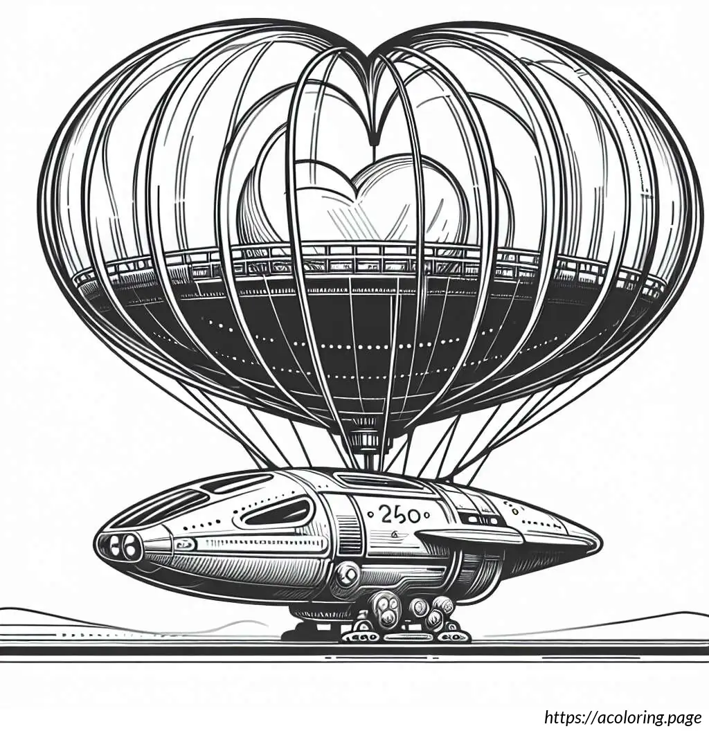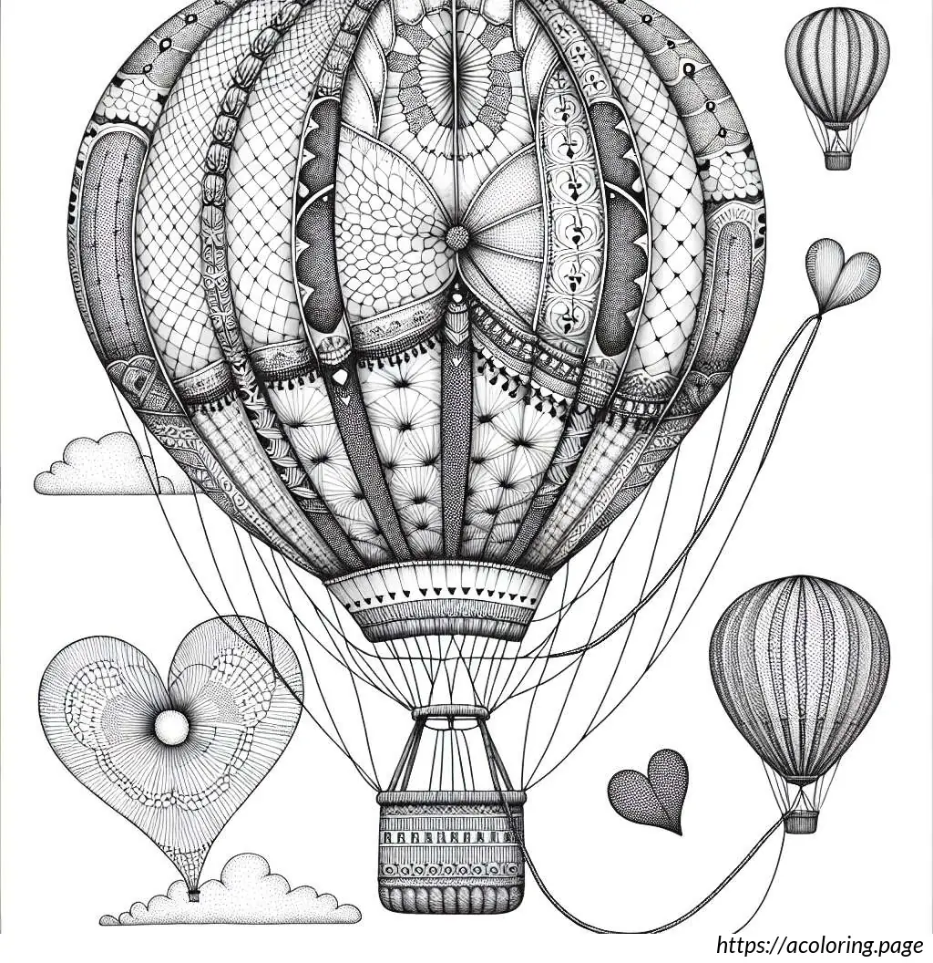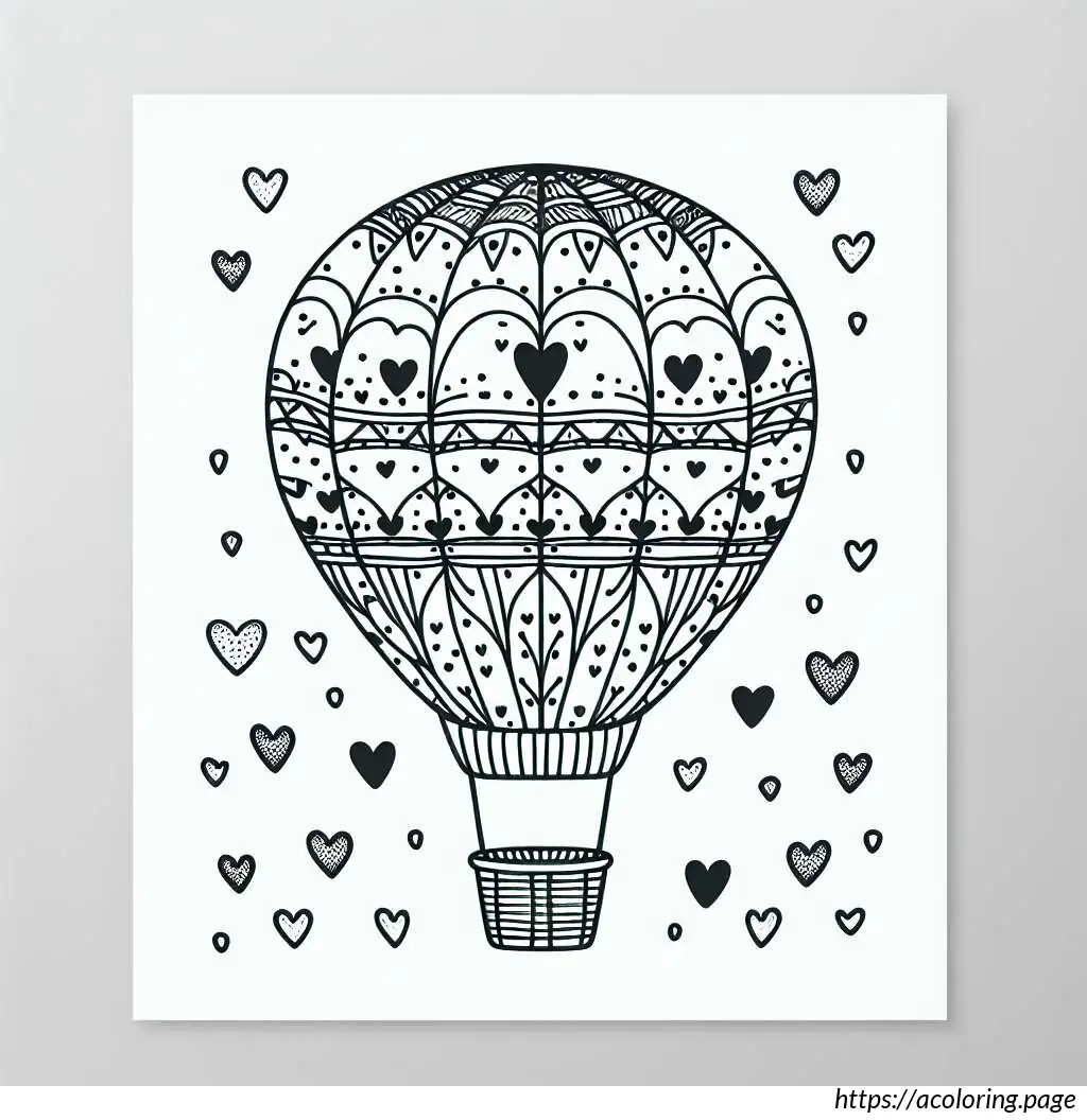 This image features a line drawing of a hot air balloon. The balloon is decorated in a specific pattern, comprising mainly geometric and heart shapes. On the upper part, you see a series of vertical panels with decorative elements. Each panel has a charming heart motif at the top, followed by diamond-shaped outlines, and three oval shapes arranged vertically at each panel’s center. The gondola or basket of the hot air balloon is simple and rounded, attached to the envelope (the balloon part) with curved lines simulating the ropes or cables that hold it. The overall design is structured and symmetrical, typically seen in coloring book illustrations or simple clip art designs.