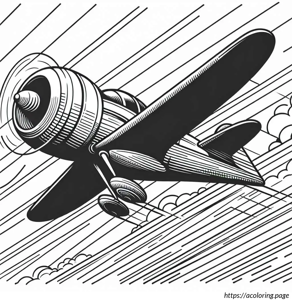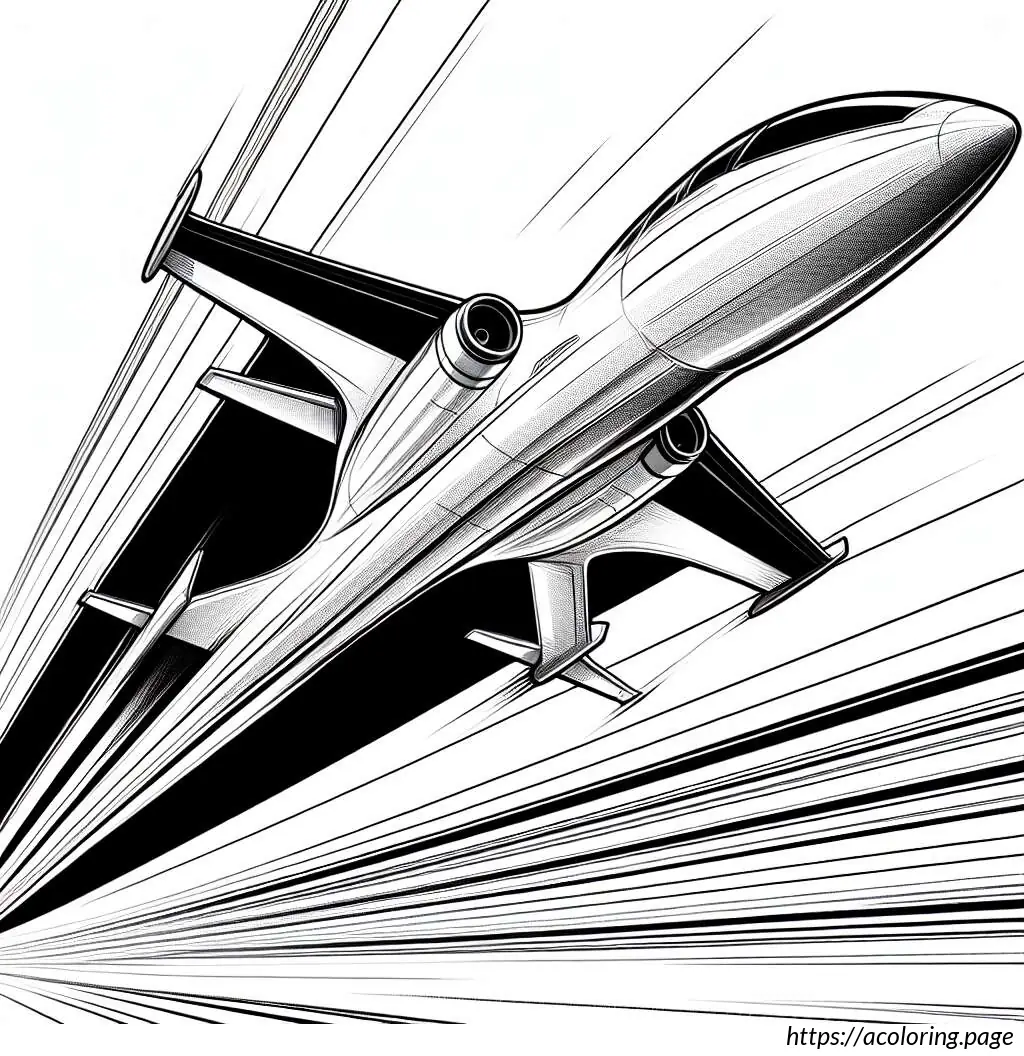 This image features a streamlined, simplistic line drawing of a futuristic aircraft. The aircraft, illustrated in a cartoon-like, monochrome style, has an aerodynamic design suggestive of high-speed travel or sci-fi themes. It has a rounded body with elongated, smooth contours and is equipped with a pair of forward-leaning wings that have sharp, angular tips. The rear of the aircraft includes tail fins that are similarly styled to the wings, contributing to its overall dynamic and sleek appearance. The plane is shown in an upward angle as if taking off or in flight, and the background consists of horizontal lines that suggest motion or speed. There are no discernible cockpit windows, which adds to its possibly unmanned or futuristic aura.