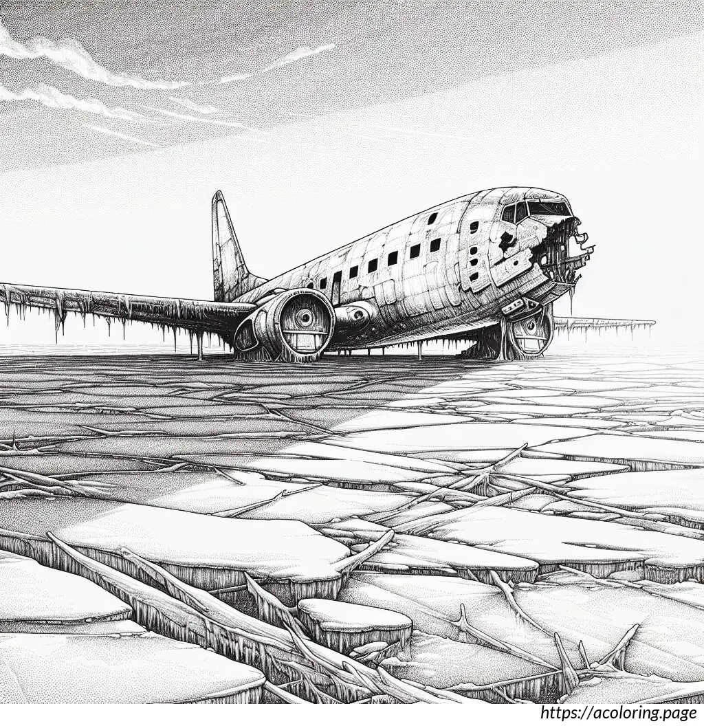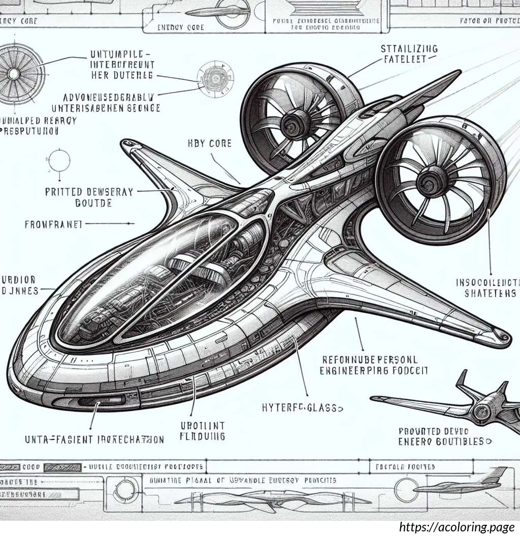 The image shows a cartoon-style drawing of an airplane. It features a sleek, streamlined design with prominent, simple shapes and minimal detail, typical of a stylized illustration. The airplane has one large, circular engine mounted on the body, with exaggeratedly large, circular intakes visible. The cockpit is positioned just behind the engine, rounded on top, suggesting it is covered by a canopy, though no pilot is depicted. The wings of the airplane extend directly from the middle of the fuselage and are depicted with flat, smooth surfaces, tapering to a point at the rear. The aircraft’s tail consists of a vertical stabilizer and horizontal stabilizers, simplified into basic geometric shapes. Additionally, the landing gear is shown extended beneath the plane, comprising simple, rounded wheels. The entire drawing is done in black outline without any shading or color, giving it a clear and easily interpretable appearance.