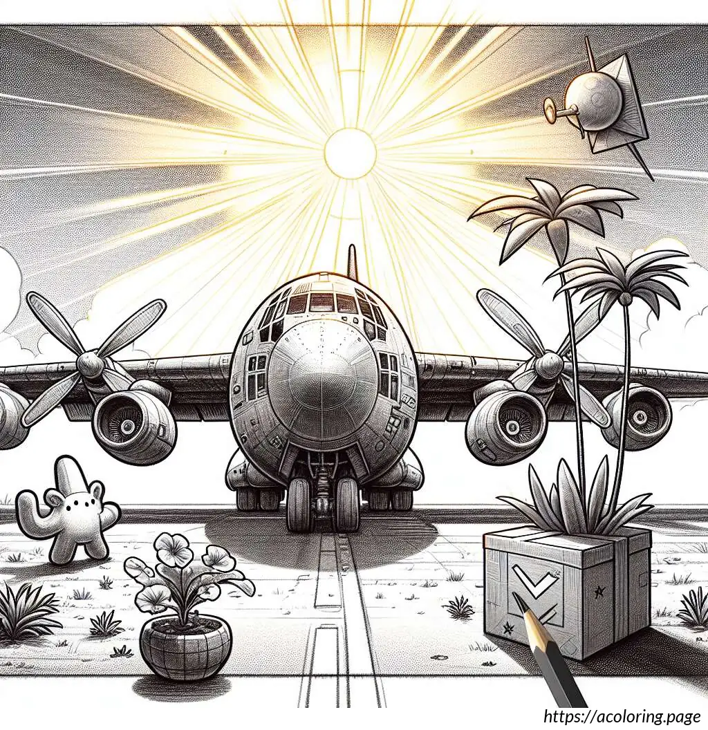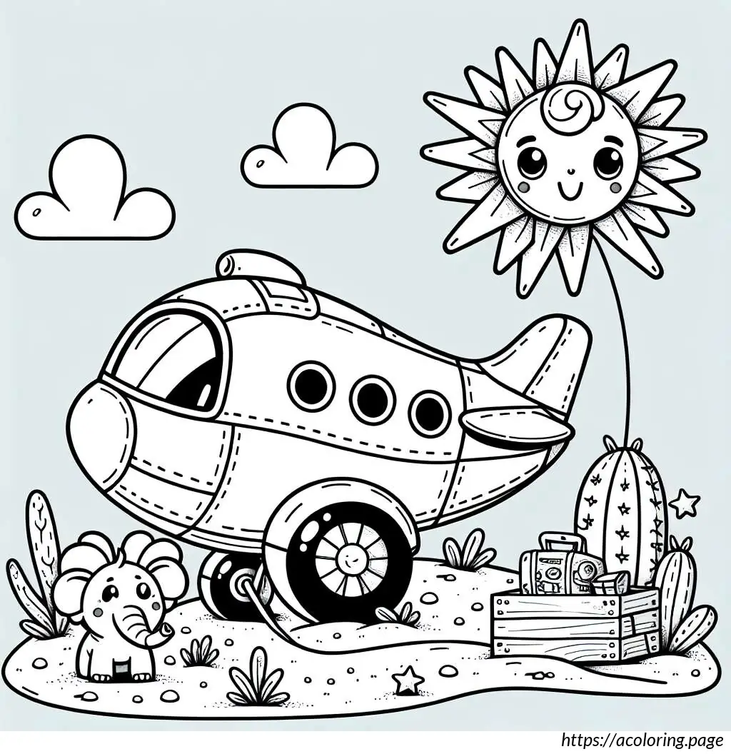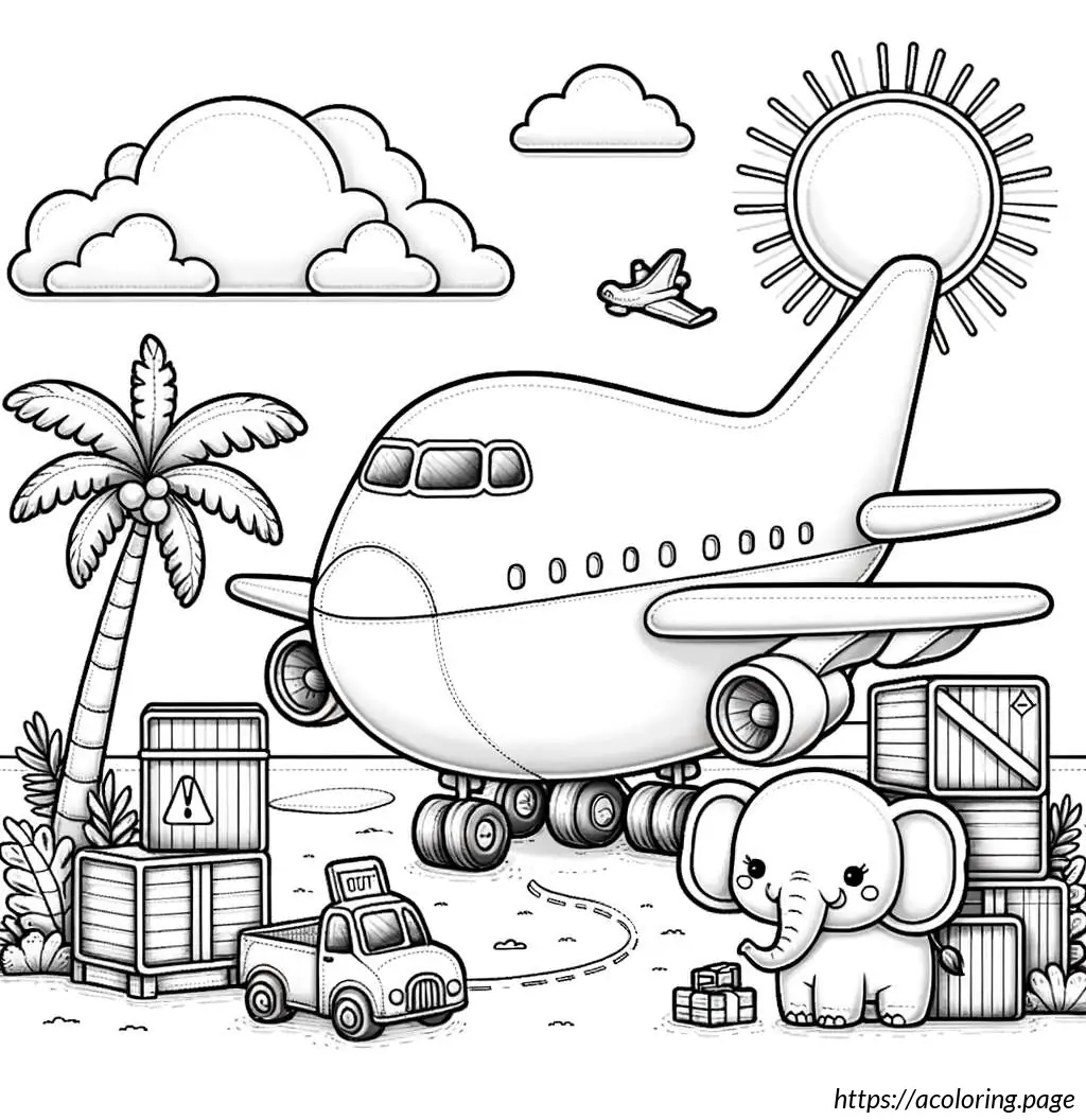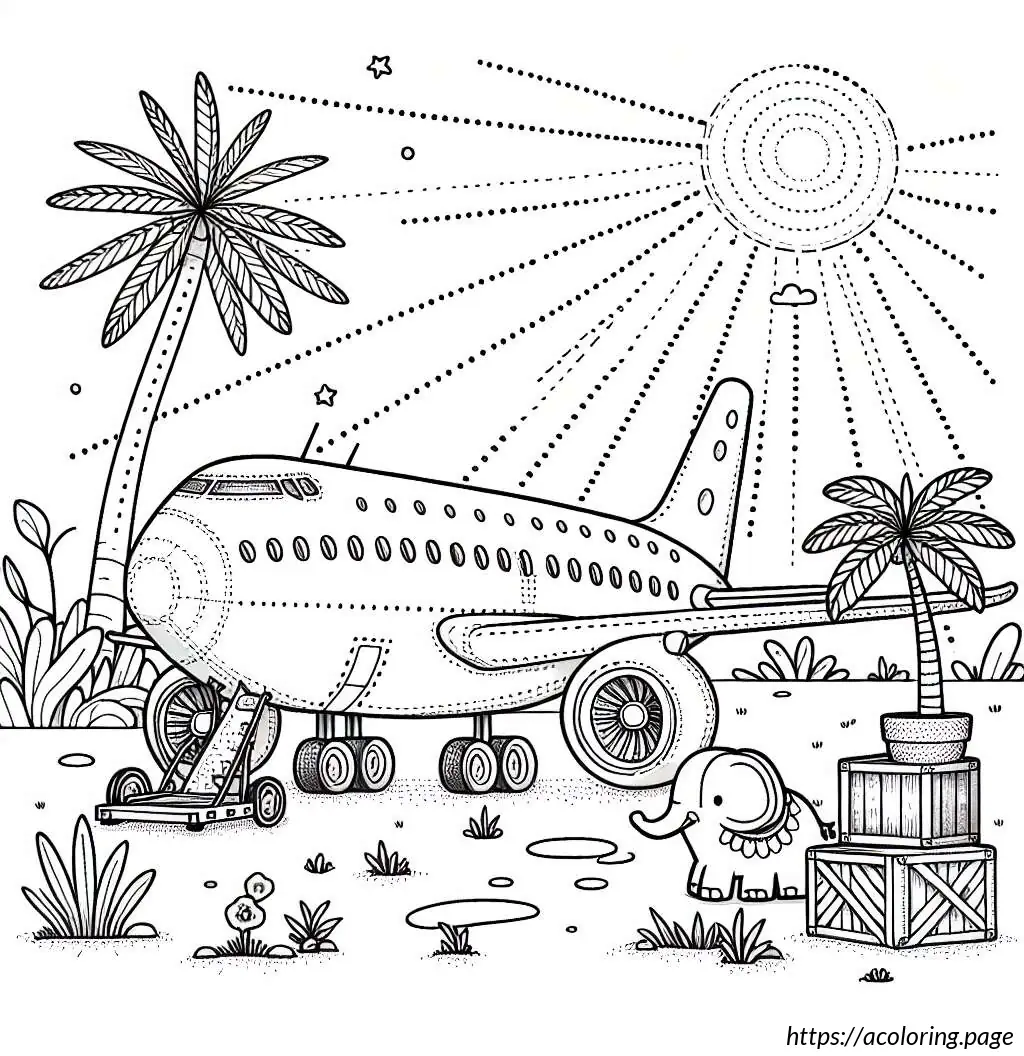 The image depicts a simple, cartoon-style drawing featuring a large airplane with its cargo ramp opened, located in a sunny landscape. The plane is detailed with dotted rivets along its surface, a small window at the front, and landing gear visible underneath. In front of the plane, there is a small elephant standing on the ground, looking towards the plane. Beside the elephant, there’s a potted palm tree and two boxes, one crisscrossed indicating it might be a wooden crate. The scene is set in a relatively barren environment with a couple of tufts of grass and a small star-shaped plant near the plane’s front. In the background, the sun is depicted as a simple circle with rays emanating outwards, suggesting a bright day. The overall feel of the image is playful and simplistic.