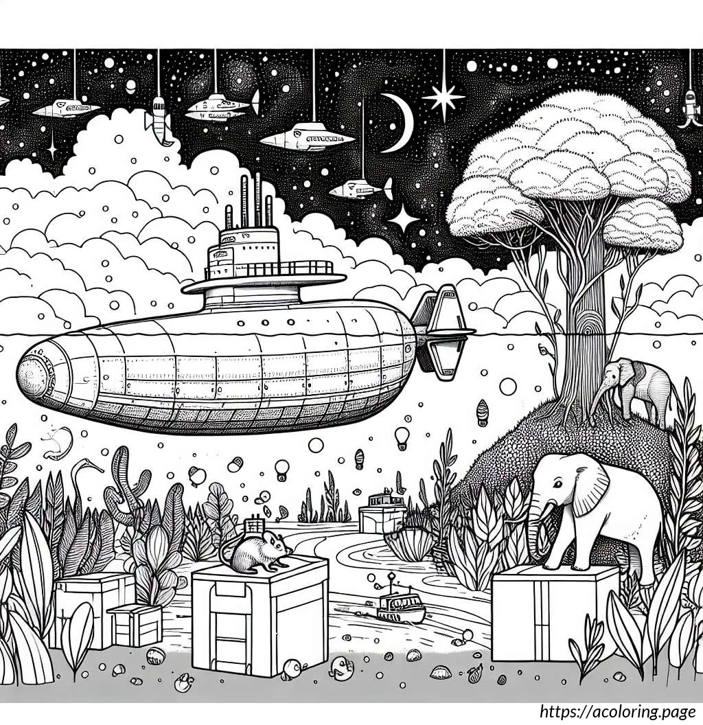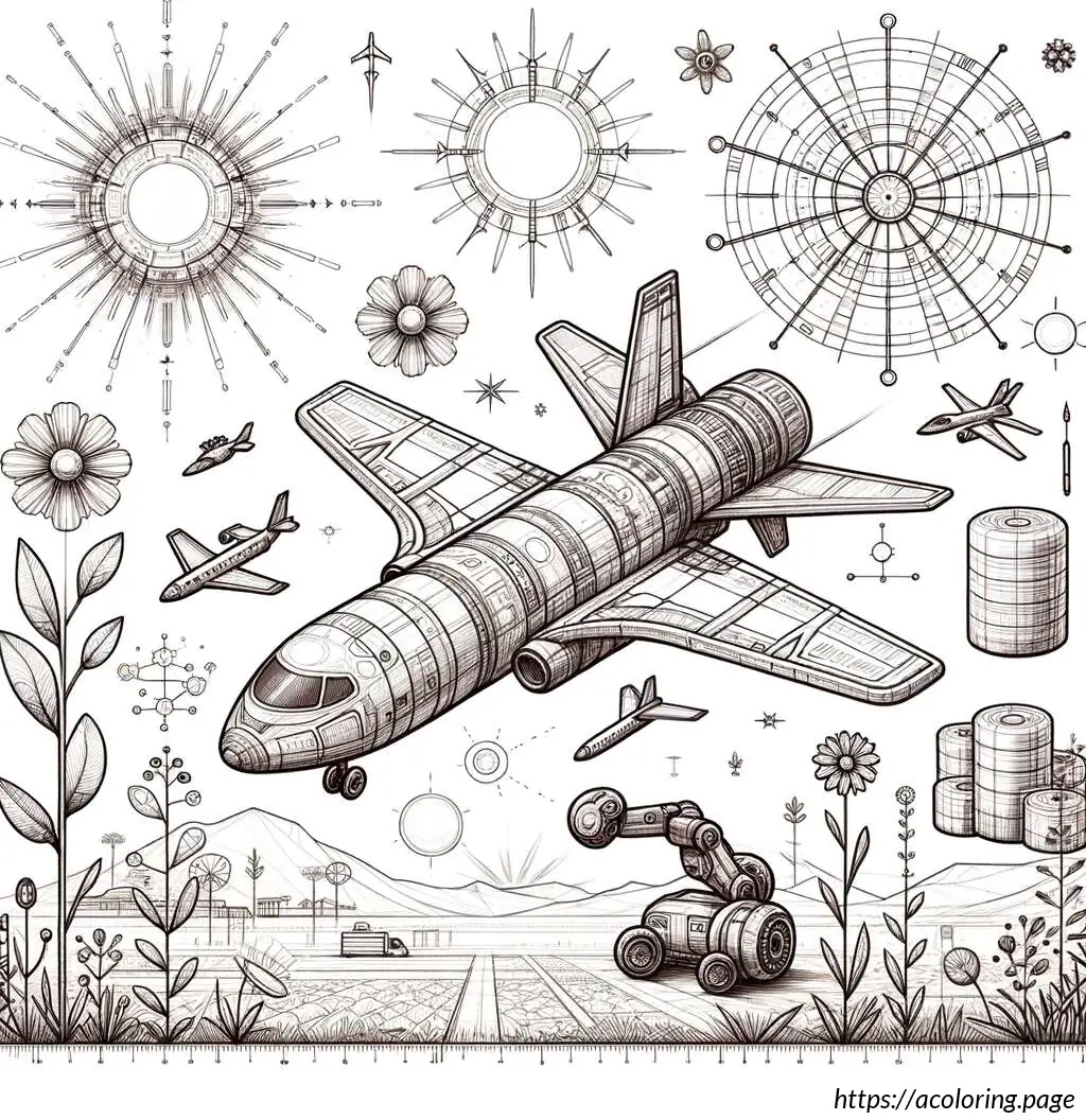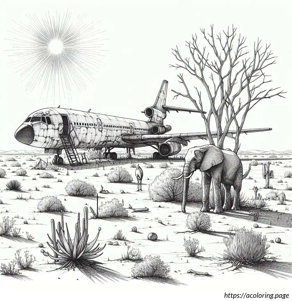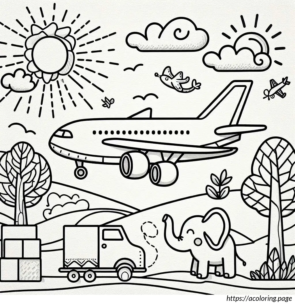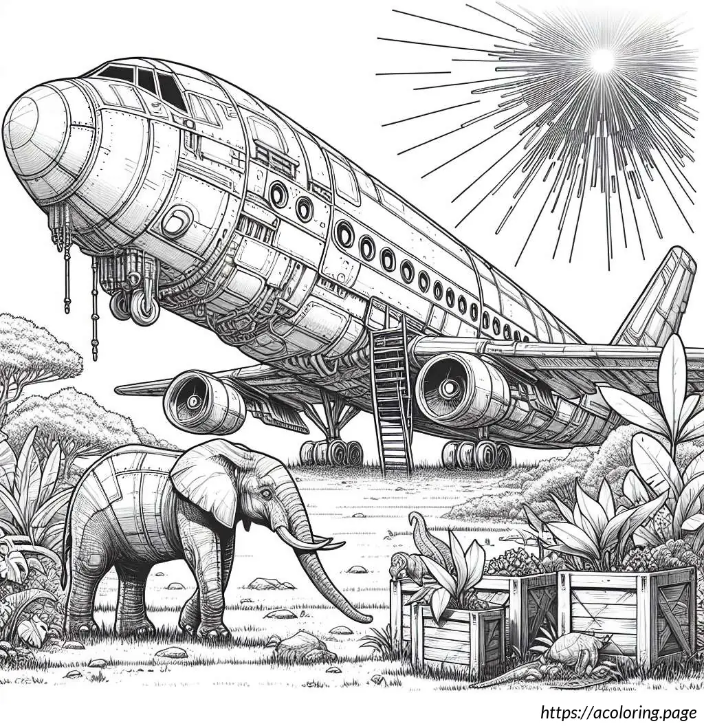 The image depicts a simple, cartoon-style drawing featuring a large airplane with its cargo ramp opened, located in a sunny landscape. The plane is detailed with dotted rivets along its surface, a small window at the front, and landing gear visible underneath. In front of the plane, there is a small elephant standing on the ground, looking towards the plane. Beside the elephant, there’s a potted palm tree and two boxes, one crisscrossed indicating it might be a wooden crate. The scene is set in a relatively barren environment with a couple of tufts of grass and a small star-shaped plant near the plane’s front. In the background, the sun is depicted as a simple circle with rays emanating outwards, suggesting a bright day. The overall feel of the image is playful and simplistic.