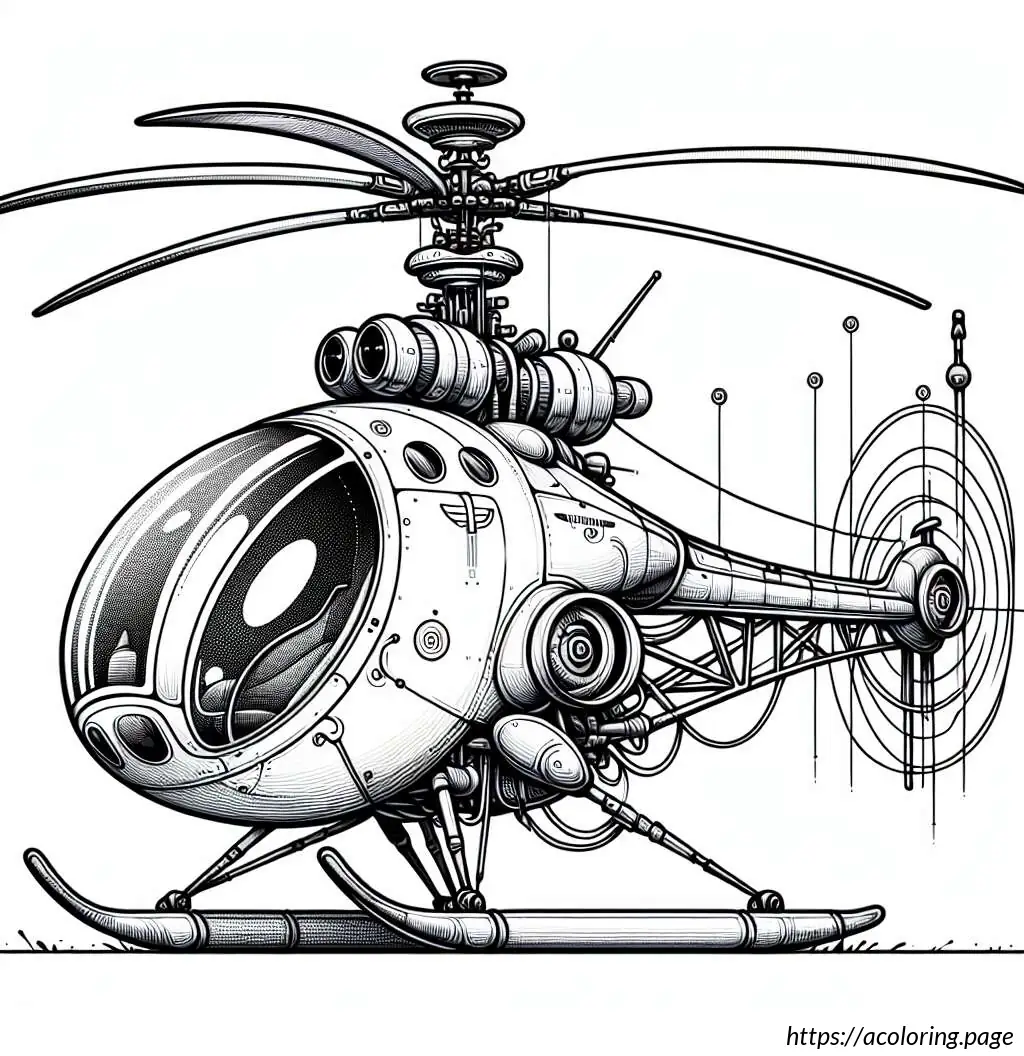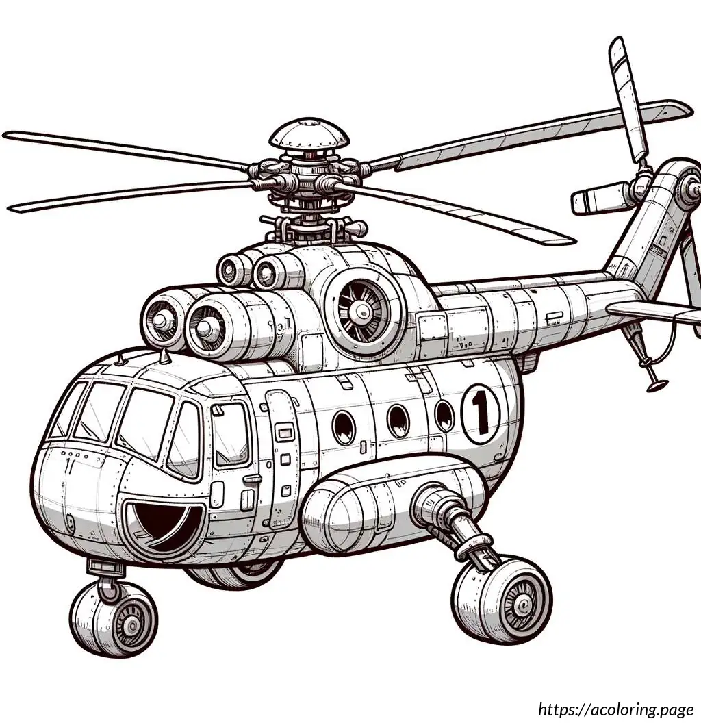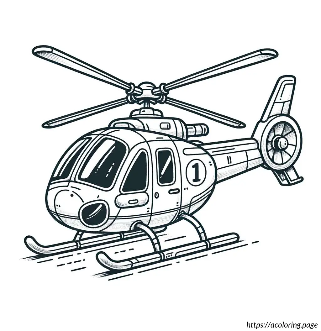 The image depicts a cartoon-style drawing of a helicopter. The helicopter features a large body with a number “1” on the side, implying it might be a rescue or special service helicopter. The body has rounded edges and a bulbous shape, enhancing its cartoon-like appearance. Two large propellers are visible, one on top for lift and a smaller one at the tail for navigation. Additionally, there are three landing wheels under the body, each resembling a small bulb. This image seems designed for coloring activities, with bold outlines and clear spaces to apply colors.
