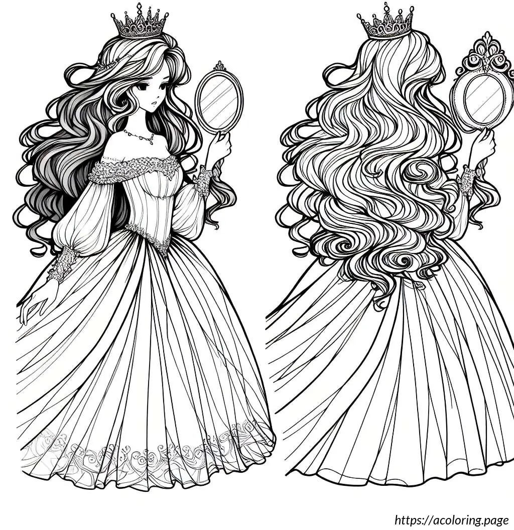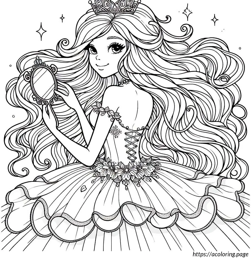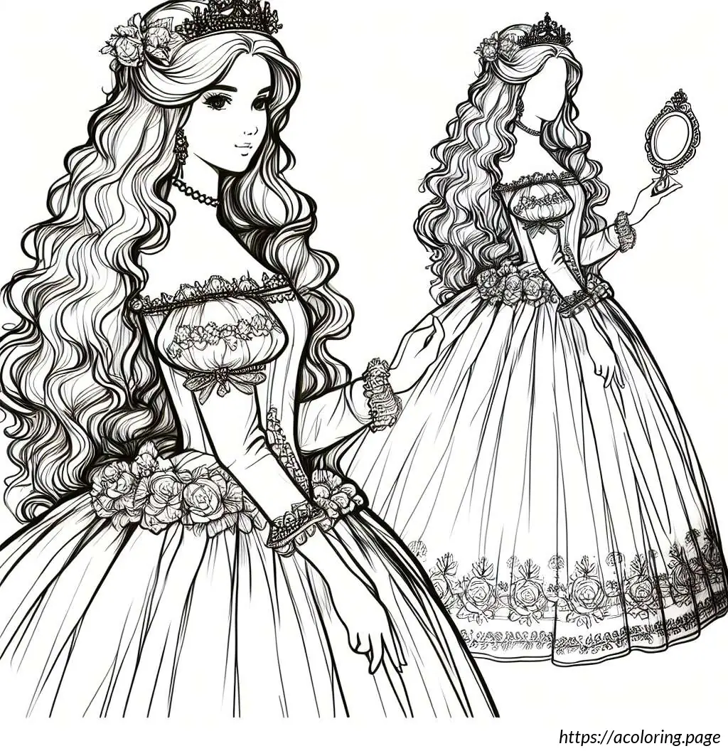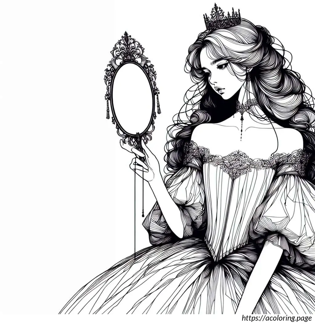 The image features a line drawing of a princess, designed in a style typical of a coloring book meant for children. The princess has wavy, long hair and wears a crown adorned with points and circular accents. She is dressed in an elegant strapless gown with a sweetheart neckline, decorated with a floral ornament at the waist. The gown flows outward in ample, structured folds, giving it a regal and voluminous appearance. She is posed holding a hand mirror in her right hand, angled to view her reflection. The drawing is uncolored, composed with bold, clear lines that outline her features, attire, and accessories, perfectly set up for coloring.