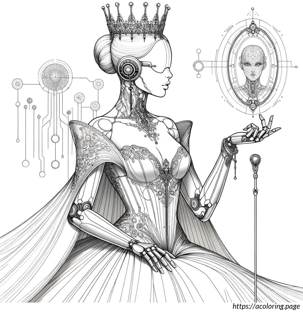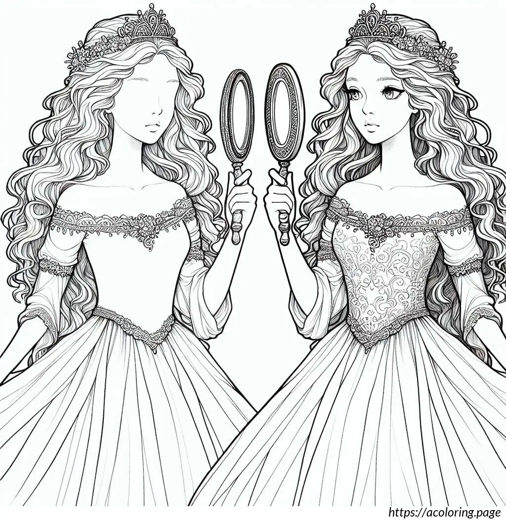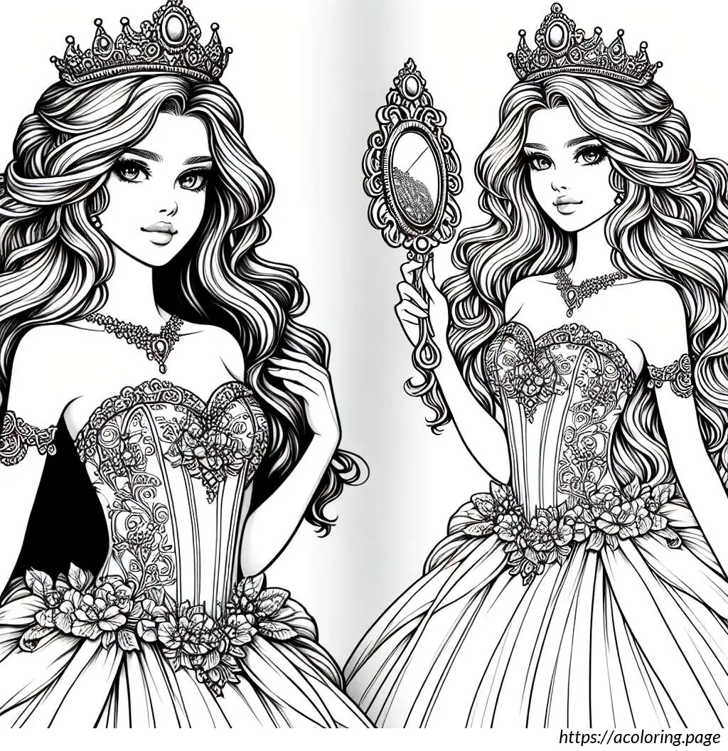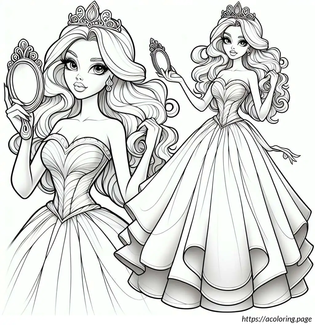 The image features a line drawing of a princess, designed in a style typical of a coloring book meant for children. The princess has wavy, long hair and wears a crown adorned with points and circular accents. She is dressed in an elegant strapless gown with a sweetheart neckline, decorated with a floral ornament at the waist. The gown flows outward in ample, structured folds, giving it a regal and voluminous appearance. She is posed holding a hand mirror in her right hand, angled to view her reflection. The drawing is uncolored, composed with bold, clear lines that outline her features, attire, and accessories, perfectly set up for coloring.
