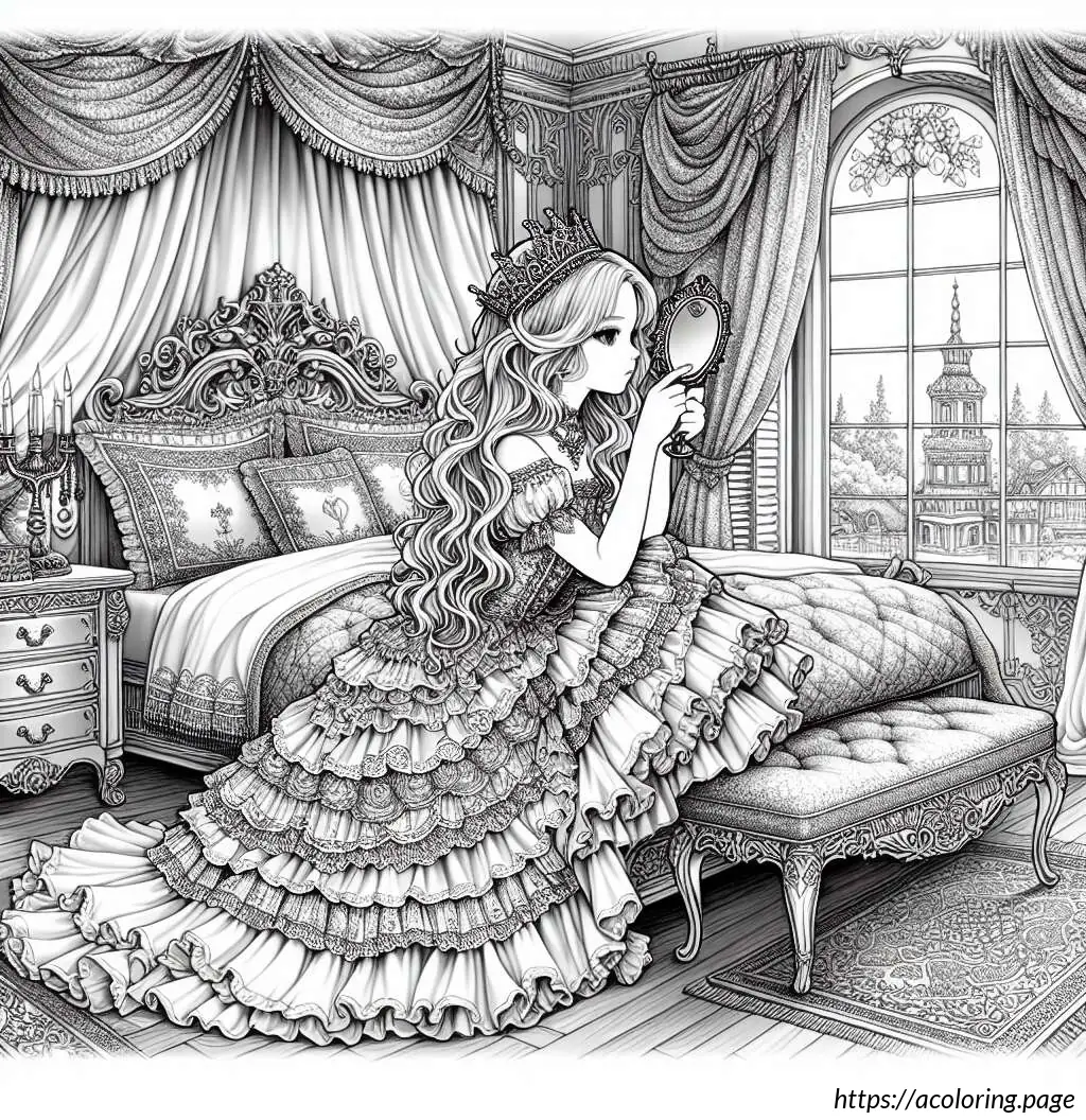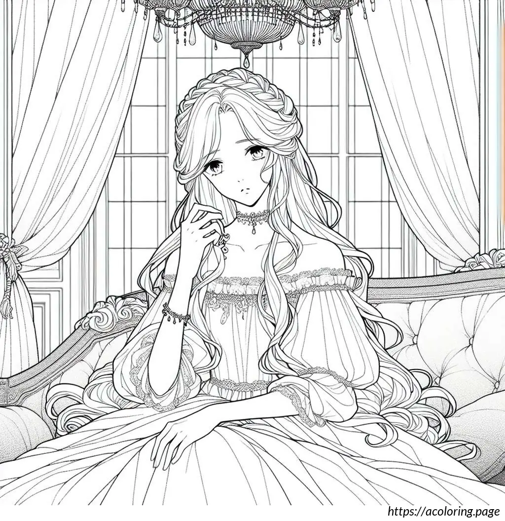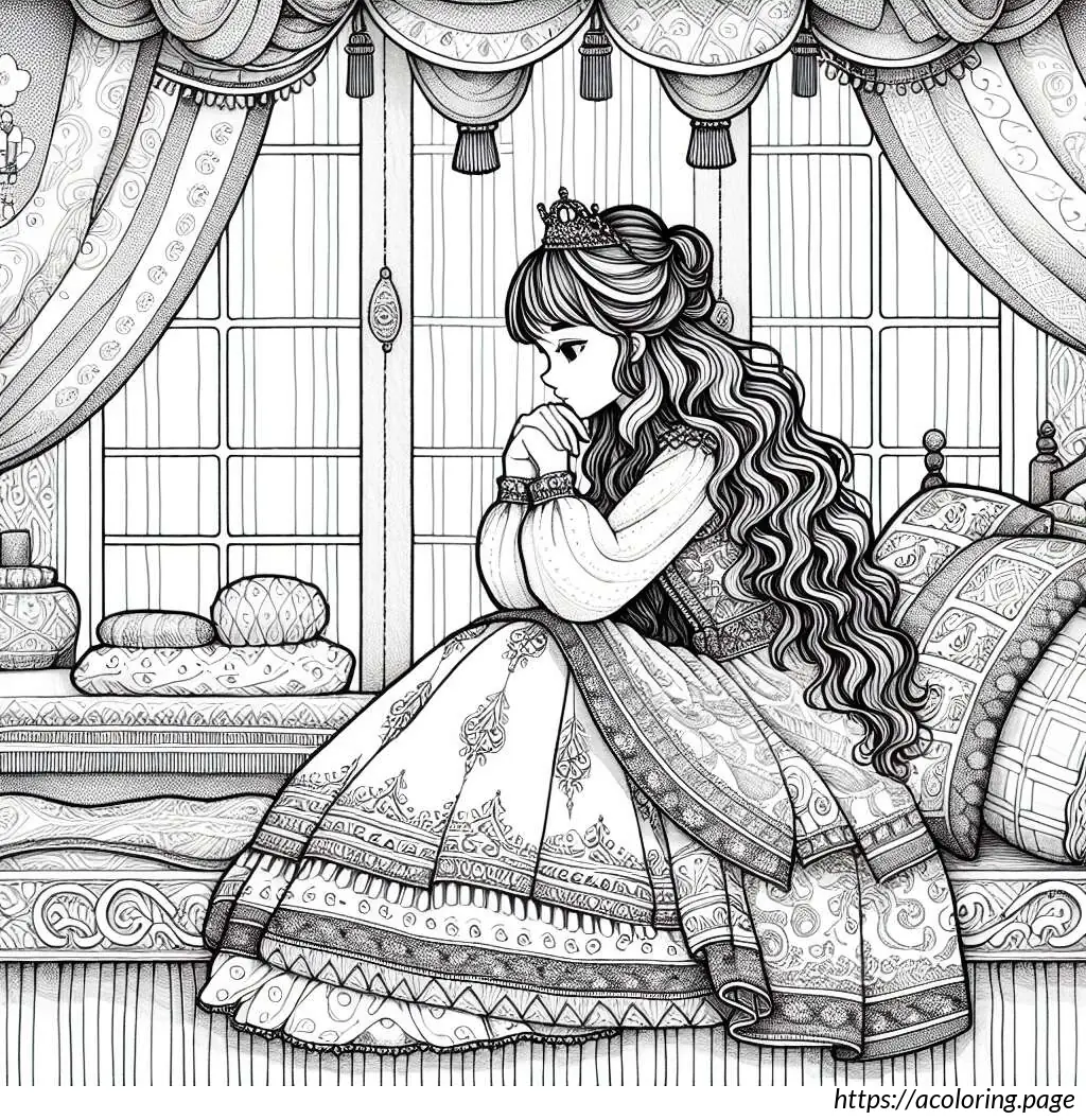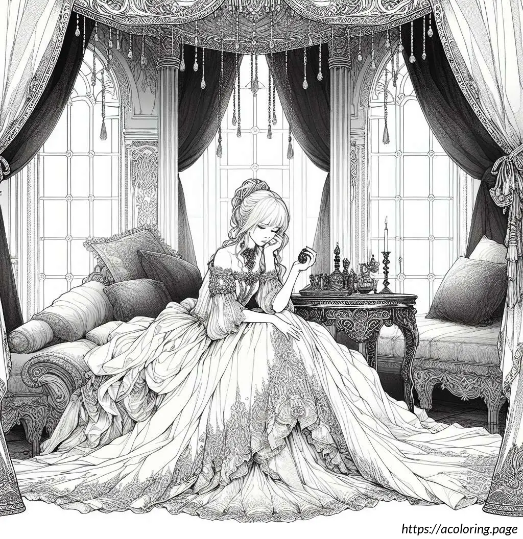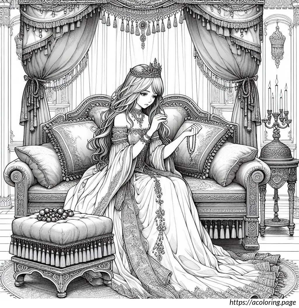 The image is a black and white line drawing of a young princess, depicted sitting on a luxurious, cushioned bench within a medieval styled chamber. The princess has long, flowing hair and is wearing a crown, a necklace, and a floor-length gown. She appears contemplative or worried, as she is looking at a gemstone or some small object in her hand.