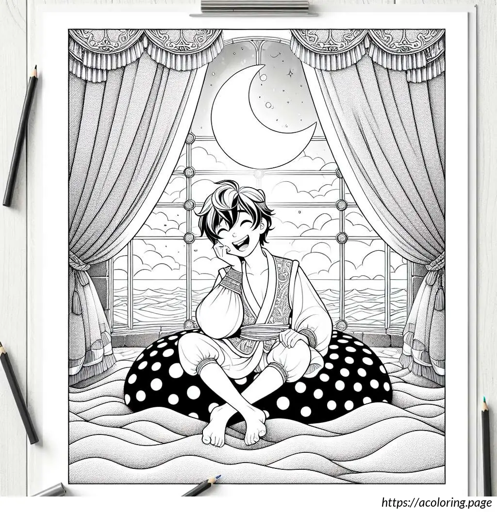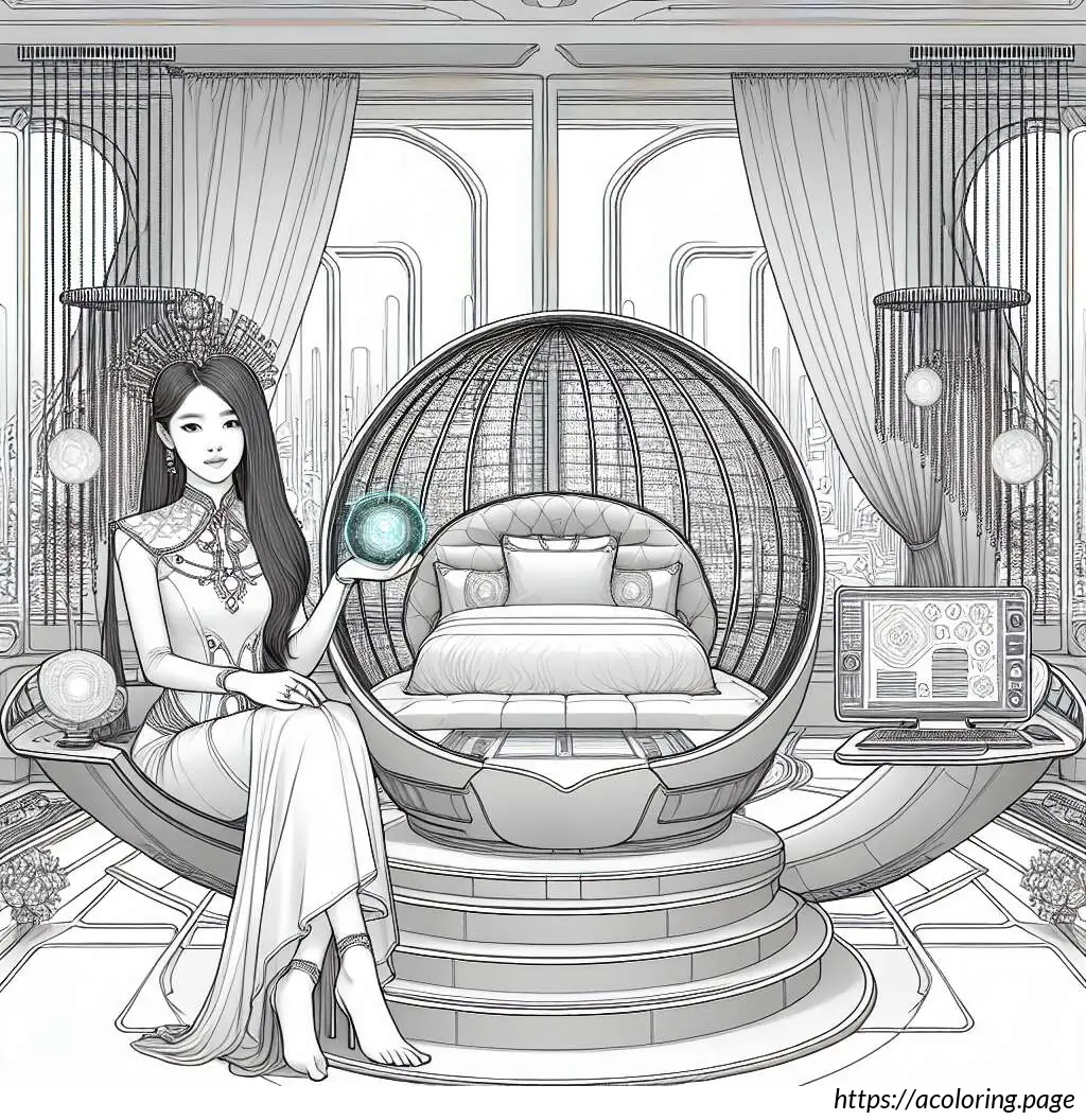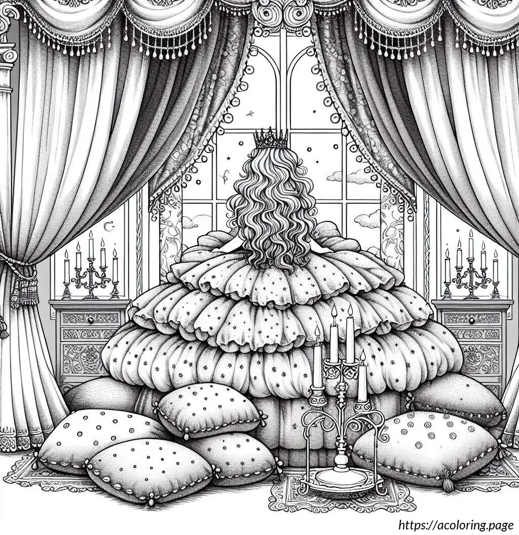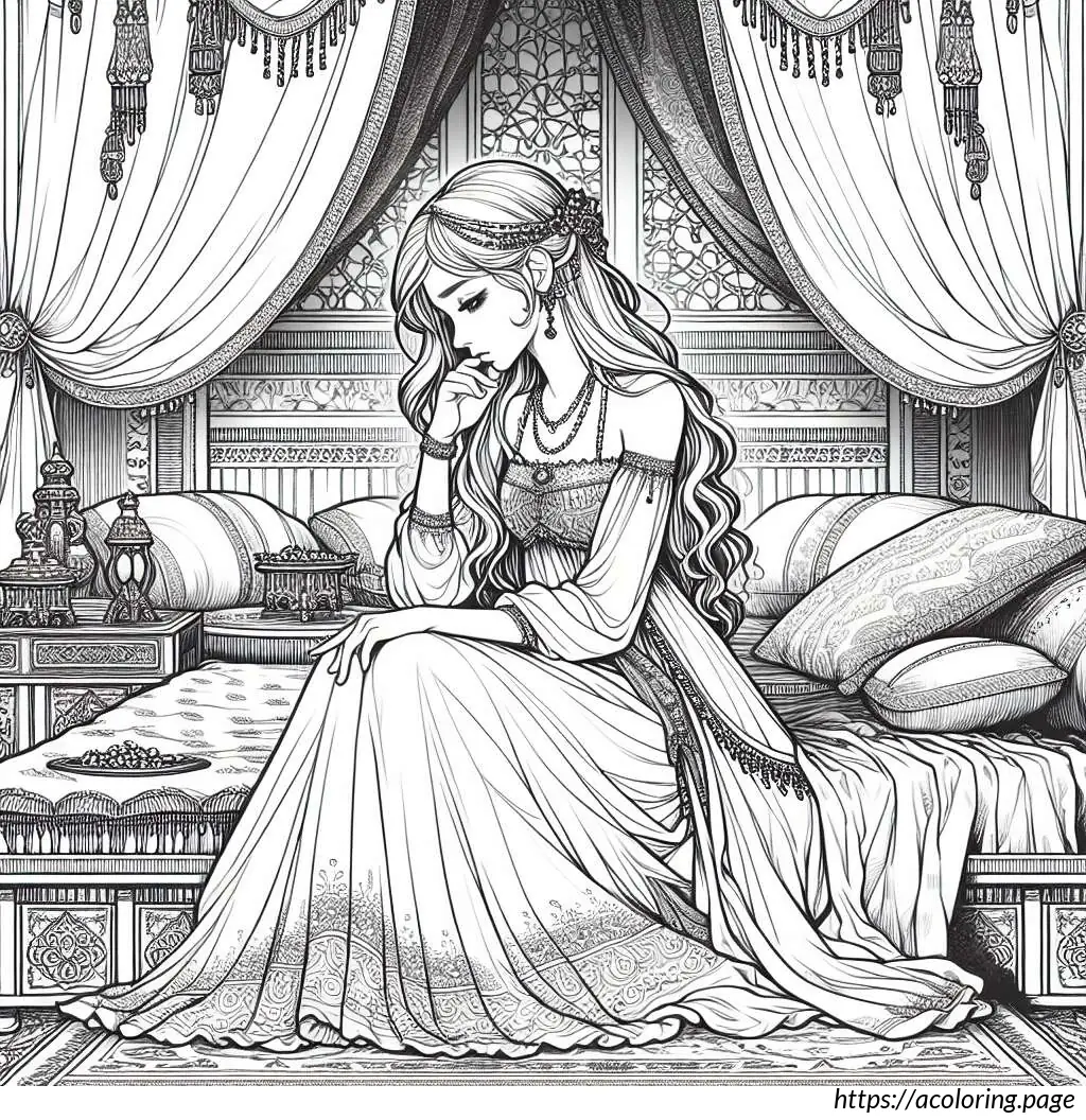 The setting is richly decorated: the chamber features draping curtains, tassels on the cushions, and a candle sconce on the wall behind her. The image has a lot of ornamental detail, such as scalloped edges on the cushion and dotted patterns which add to the regal atmosphere. The scene seems ideal for a coloring activity, with numerous elements that could be creatively colored.