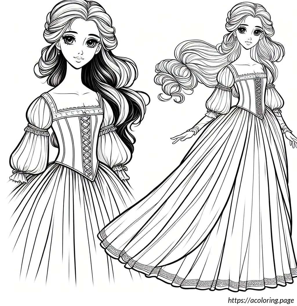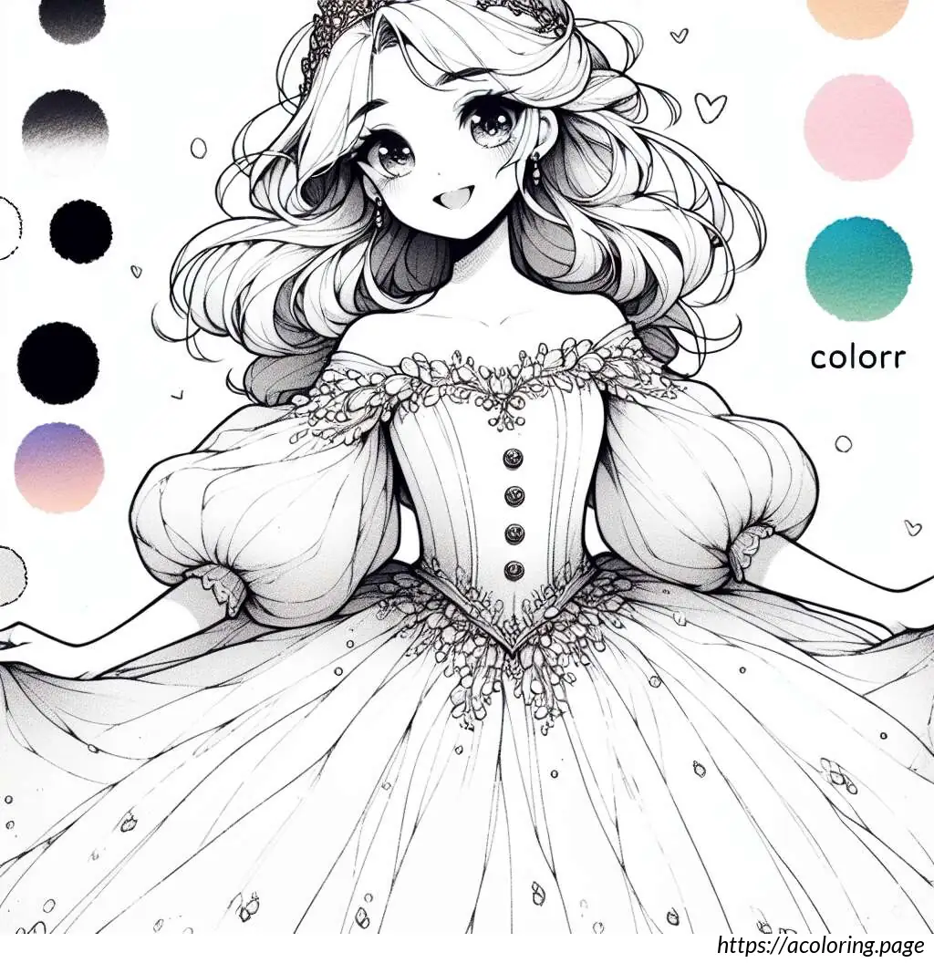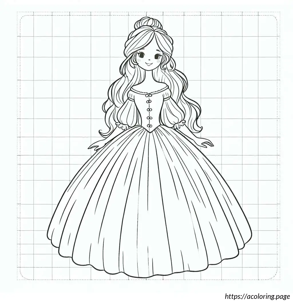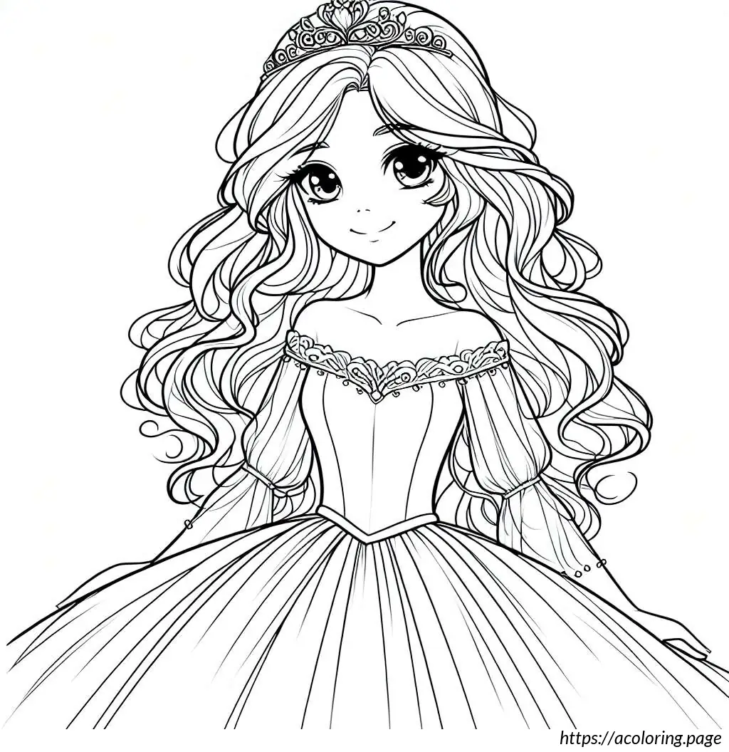 This image is a line drawing of a young princess wearing a regal gown. The character has long, wavy hair that is partially pulled up into a small bun atop her head, adorned with a simplistic, crown-like accessory. Her facial features are sweet and friendly, consisting of large, expressive eyes, a small nose, and a gentle smile.