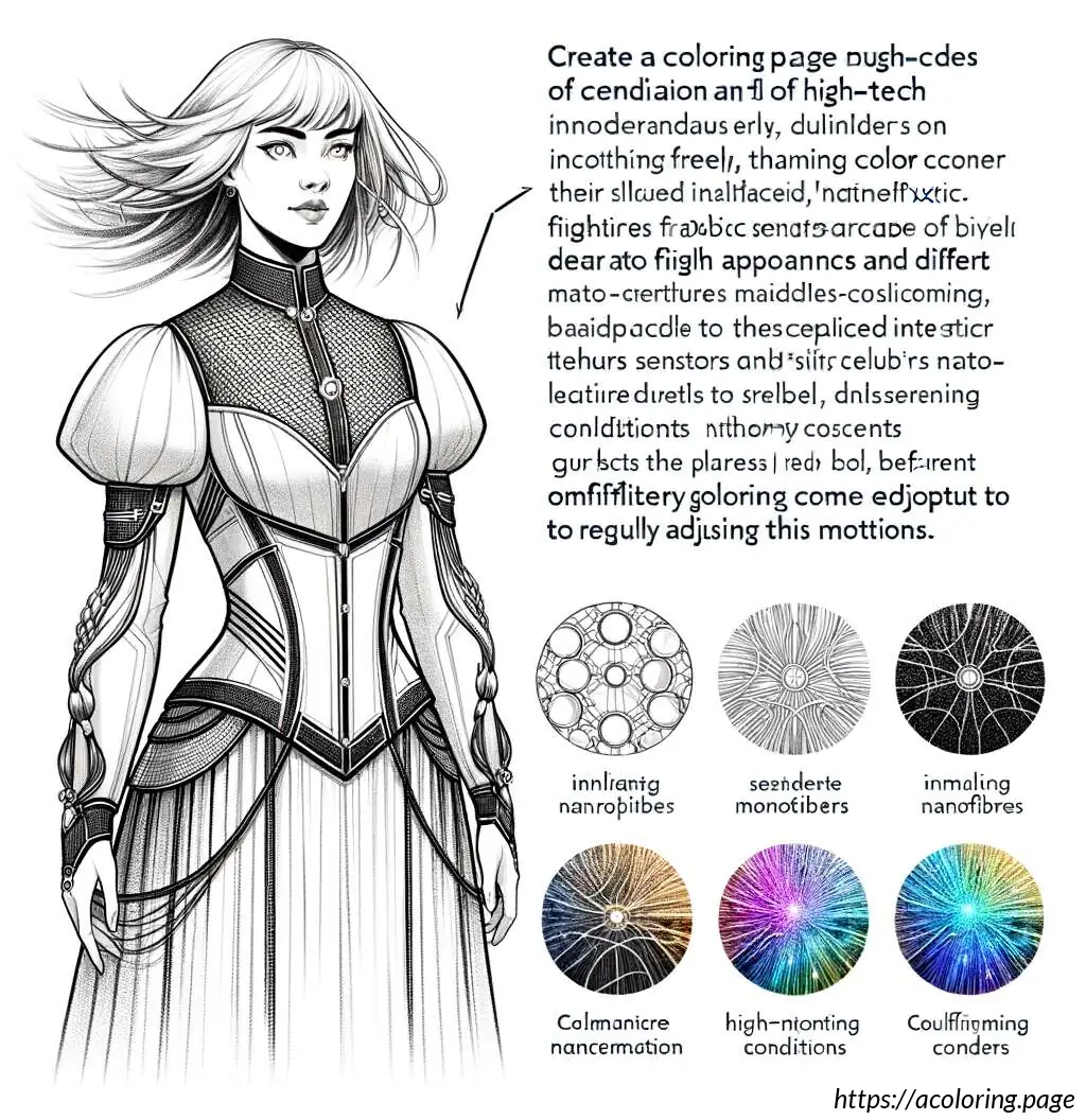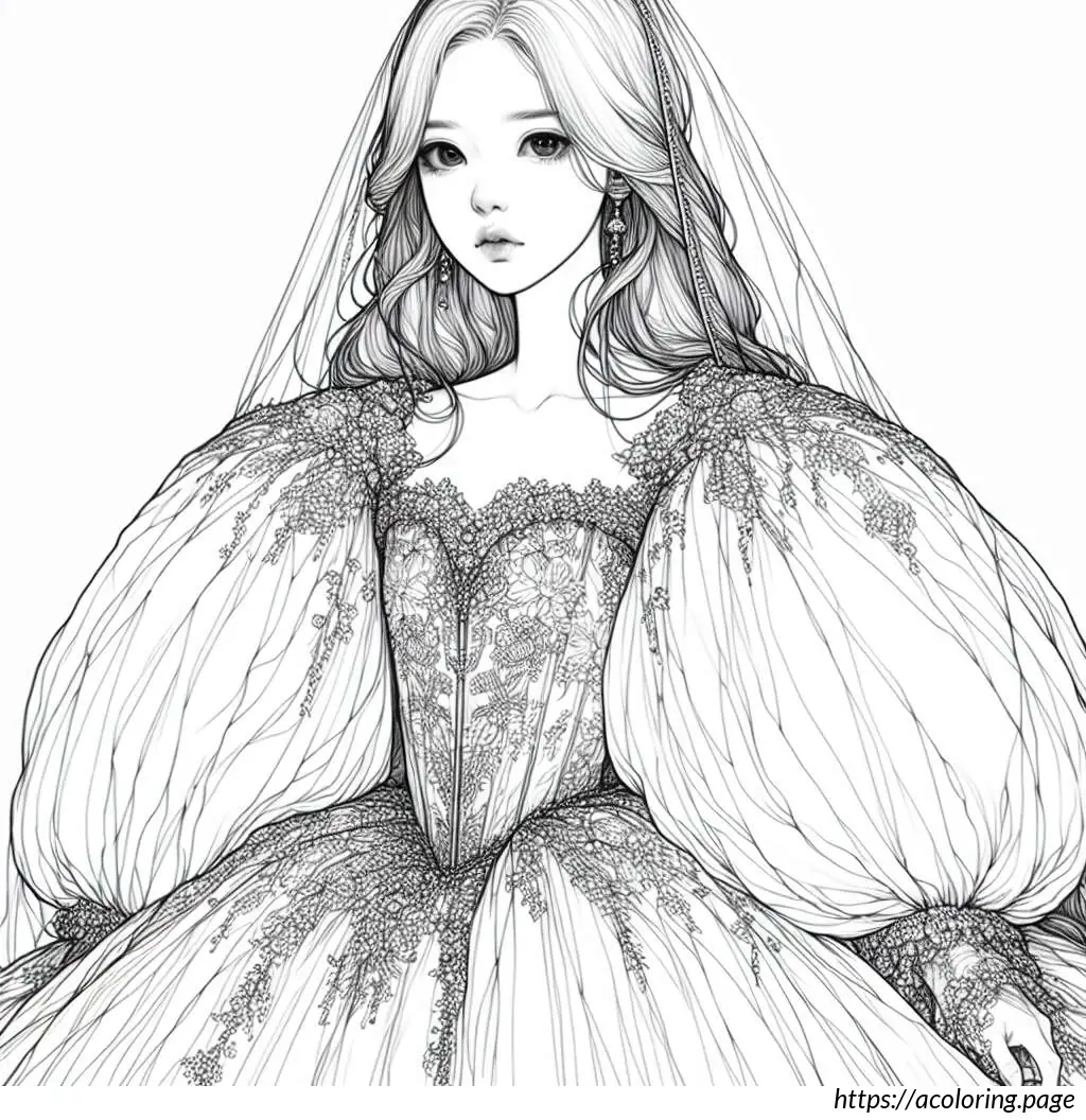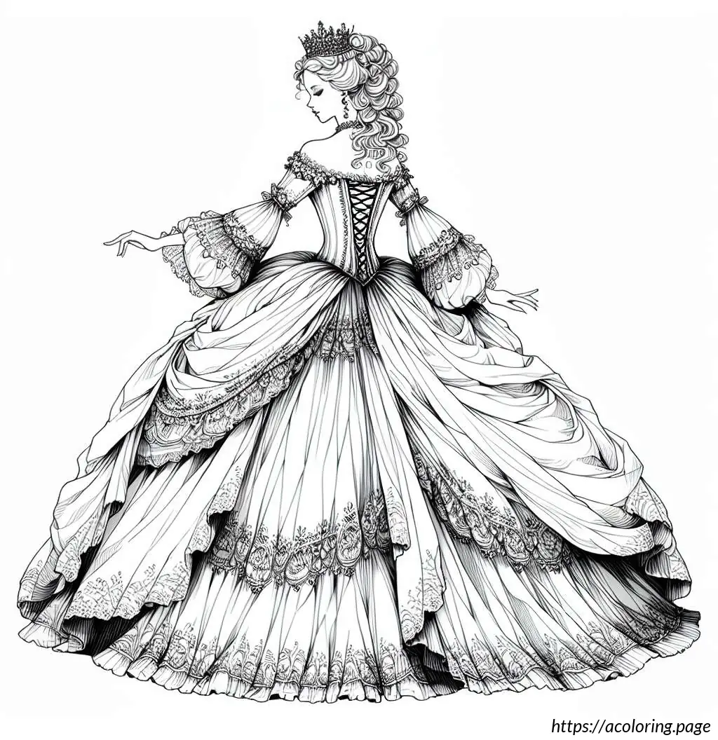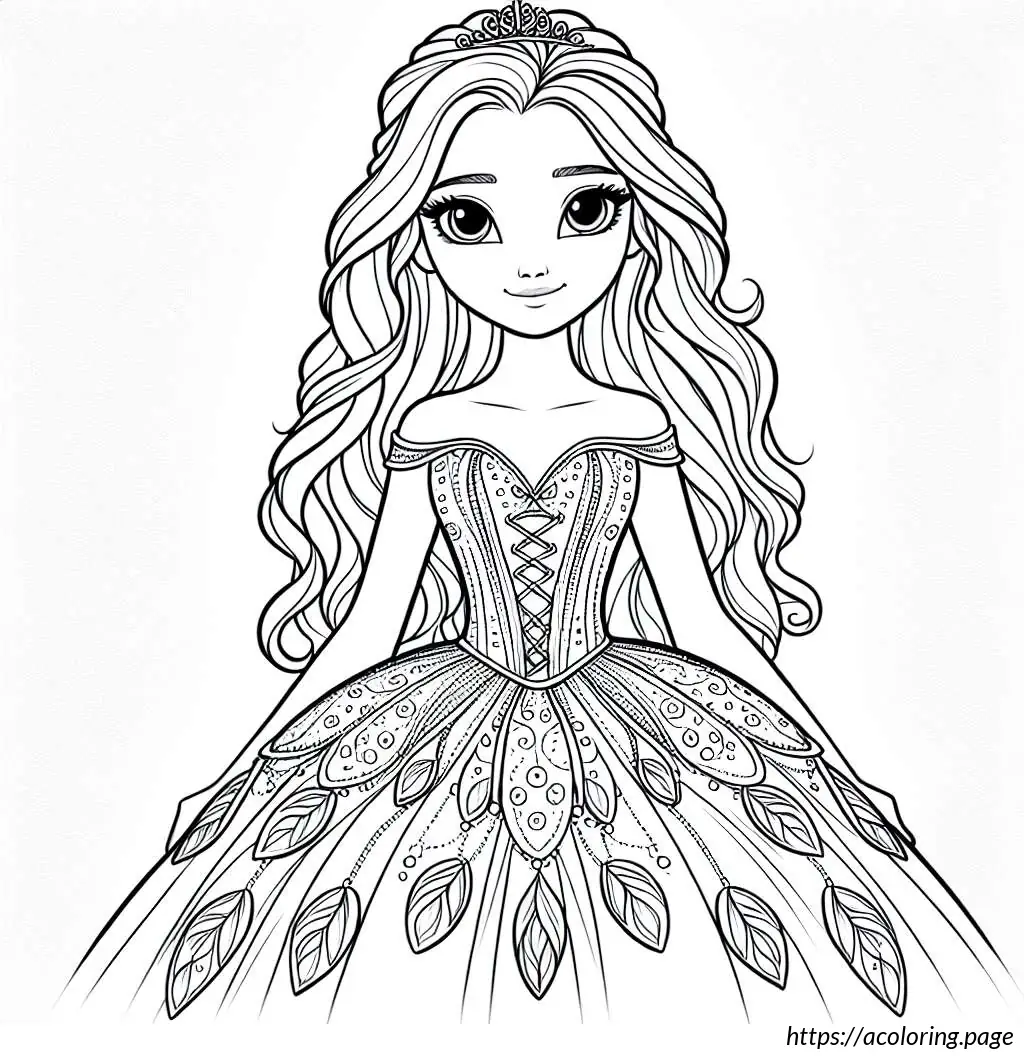 The princess’s dress is elegant and finely detailed. The bodice is fitted, with a laced corset design featuring vertical lines and dots that suggest stitching or decoration. The sleeves are not visible, suggesting a strapless or off-the-shoulder design. Her gown has a wide, flowing skirt with large, overlapping leaf-like embellishments that add a voluminous appearance. These adornments begin at the waist and flow outward, with pinched gathers that create a dynamic, textured look. The hem of the dress is softly wavy, enhancing its ethereal quality.