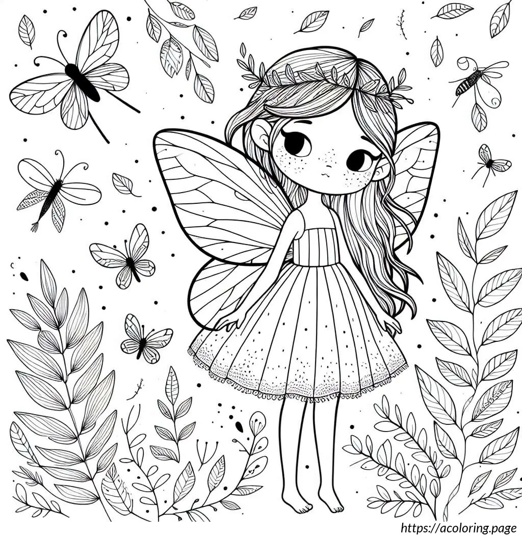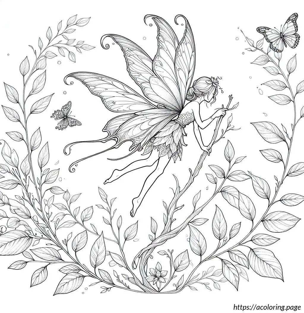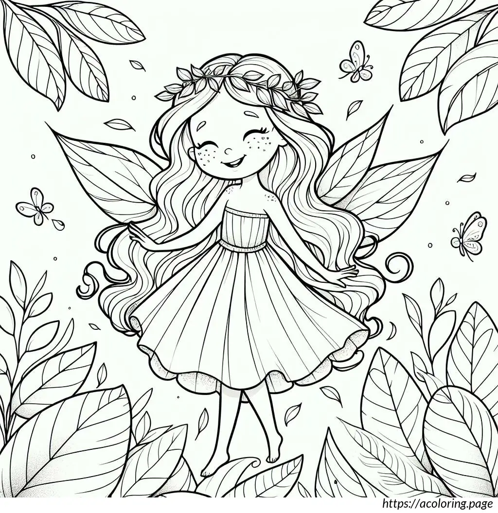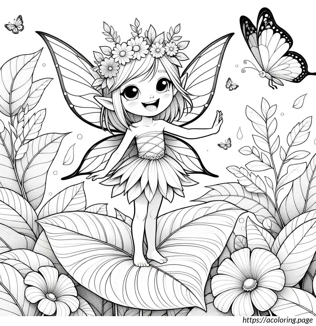 This is a black and white line drawing of a young, cheerful fairy with wings, standing amidst large leaves. The fairy, depicted in a playful pose, has long, wavy hair and is smiling. She wears a simple dress and has freckles on her cheeks. Her wings are prominent, flowing elegantly behind her. The scene is set in a natural environment with detailed leaves around her, suggesting a forest or garden setting. There’s a whimsical, light-hearted feel to the drawing, emphasized by small details such as a ribbon flowing from her hair and small butterflies fluttering nearby. The image seems designed perhaps as a coloring page, with its clear, bold lines and spacious composition.