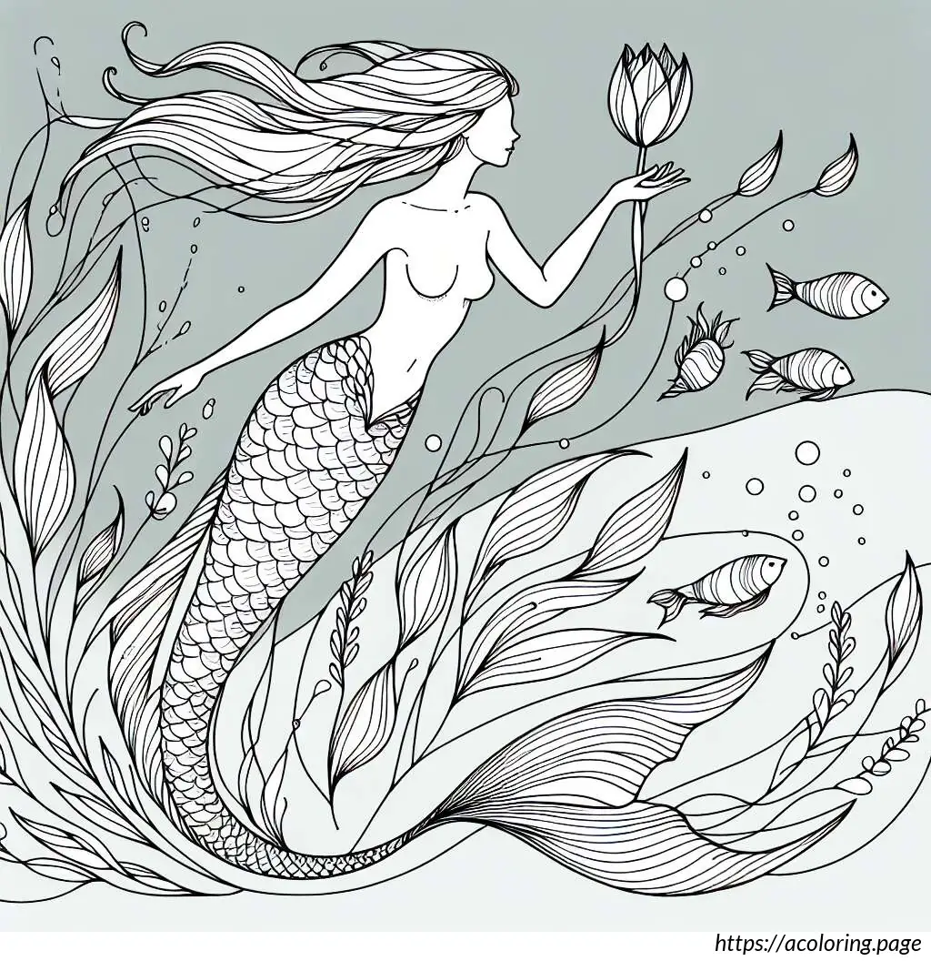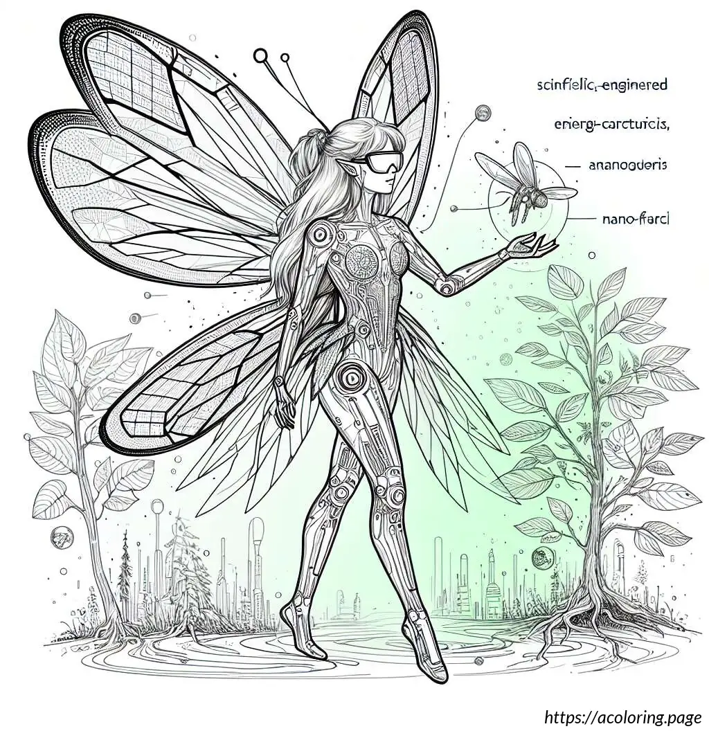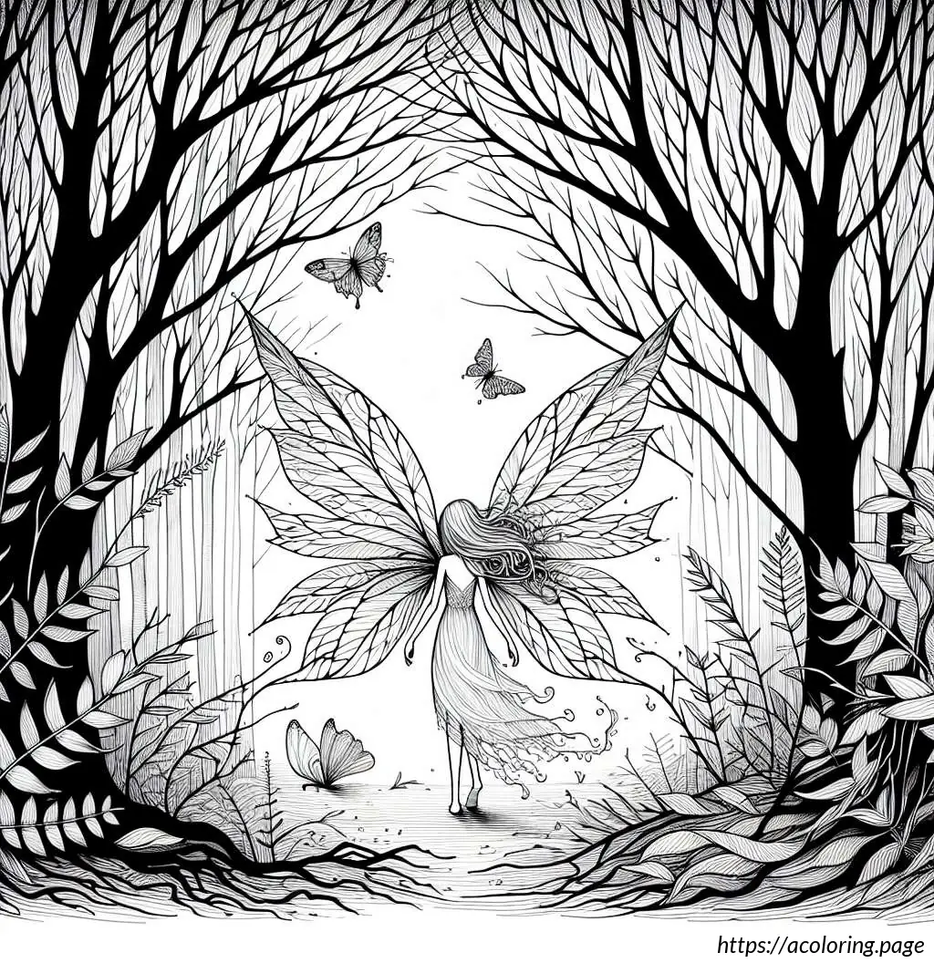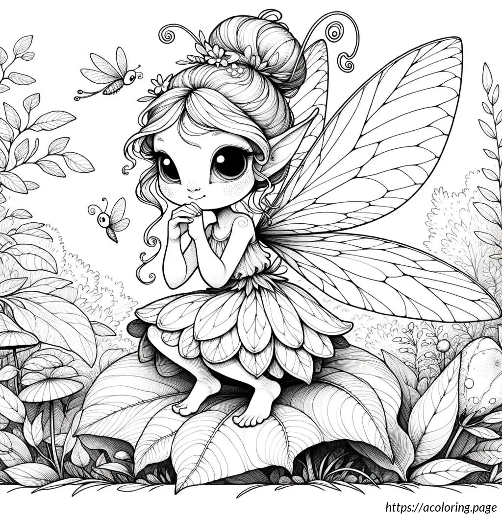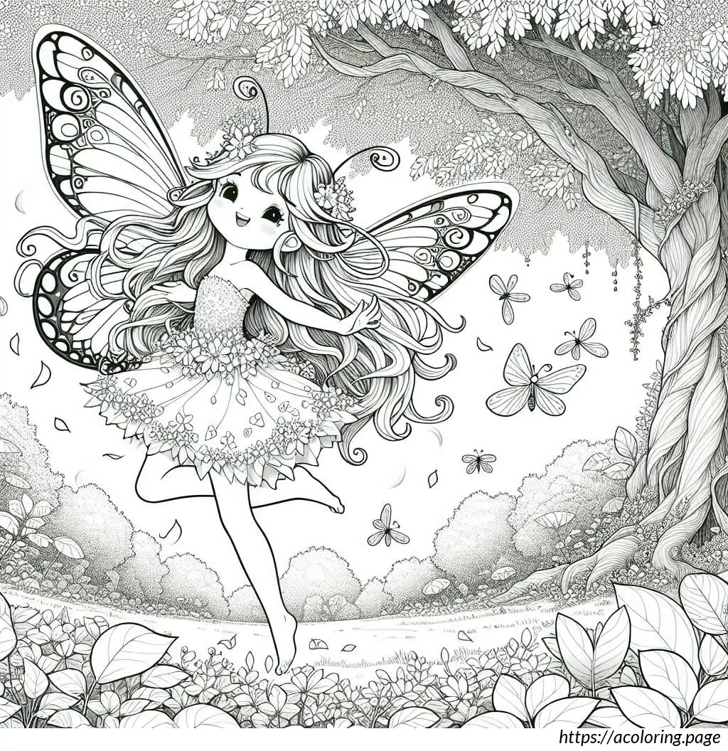 This is a black and white line drawing of a young, cheerful fairy with wings, standing amidst large leaves. The fairy, depicted in a playful pose, has long, wavy hair and is smiling. She wears a simple dress and has freckles on her cheeks. Her wings are prominent, flowing elegantly behind her. The scene is set in a natural environment with detailed leaves around her, suggesting a forest or garden setting. There’s a whimsical, light-hearted feel to the drawing, emphasized by small details such as a ribbon flowing from her hair and small butterflies fluttering nearby. The image seems designed perhaps as a coloring page, with its clear, bold lines and spacious composition.