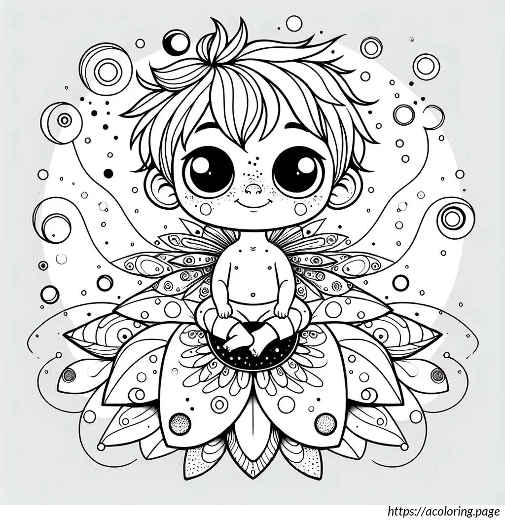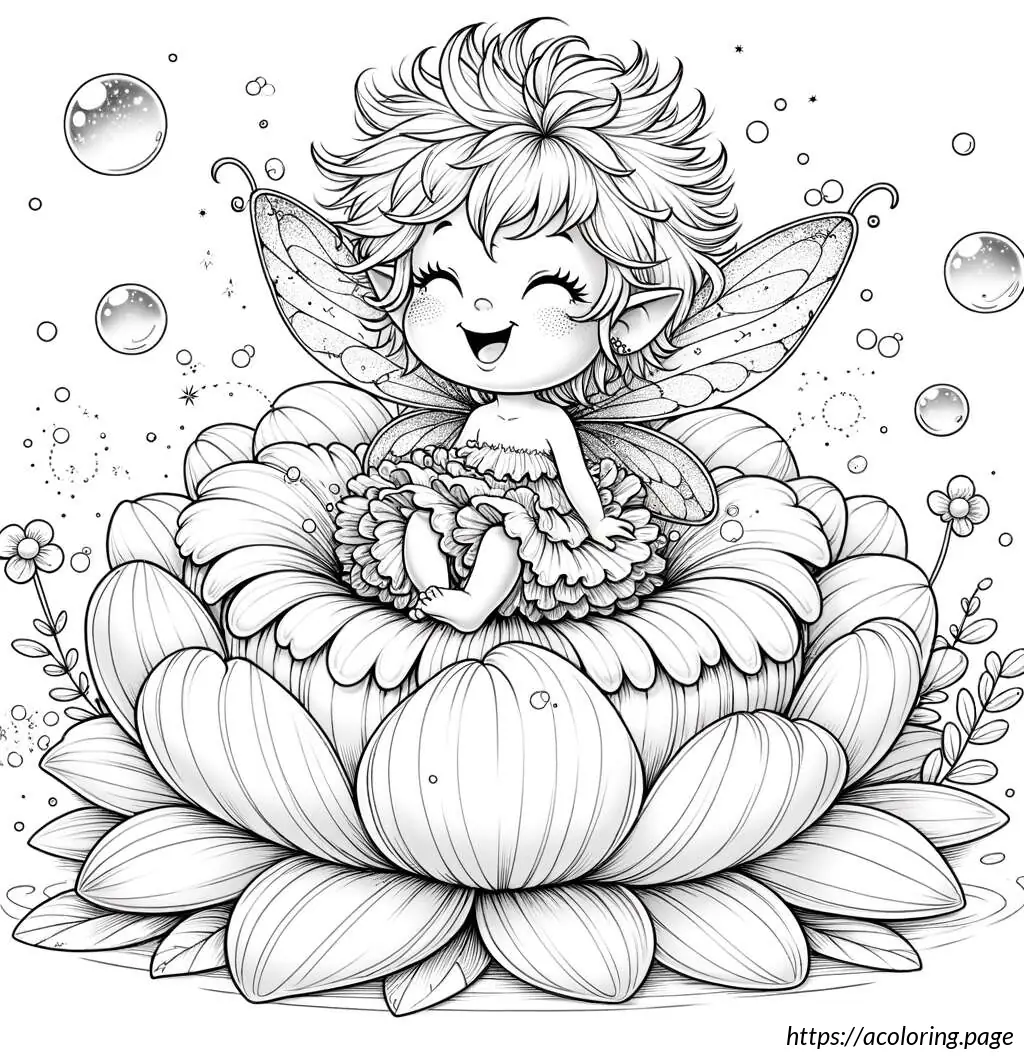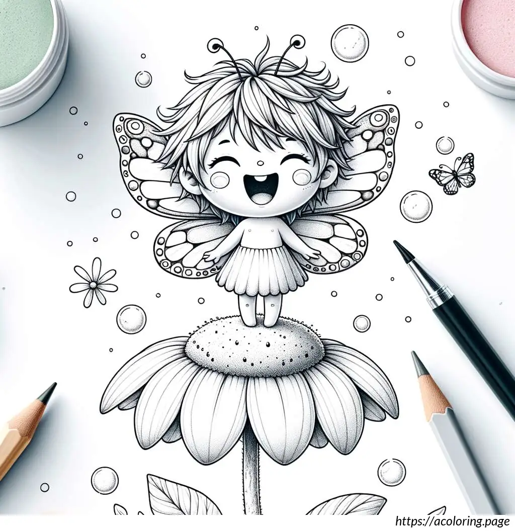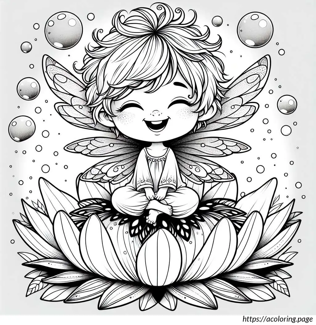 The image features a whimsical black and white line drawing of a joyful child with fairy-like wings, sitting atop a large flower. The child has fluffy, tousled hair and is smiling broadly, with closed eyes and a cheerful expression. The fairy wings are sizable with a flowing, elegant design. The child wears a simple, short-sleeved dress. Bubbles of varying sizes float around the child, adding to the playful, enchanted atmosphere of the scene. The flower beneath the child is stylized with large petals filled with different patterns, suggesting dimension and texture. Overall, the illustration has a light, joyful vibe suitable for coloring and children’s book illustrations.
