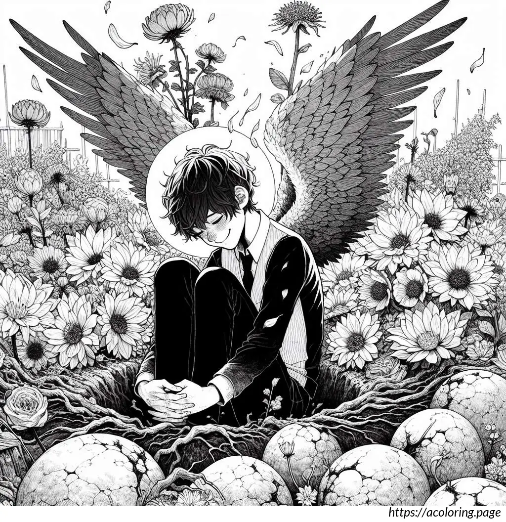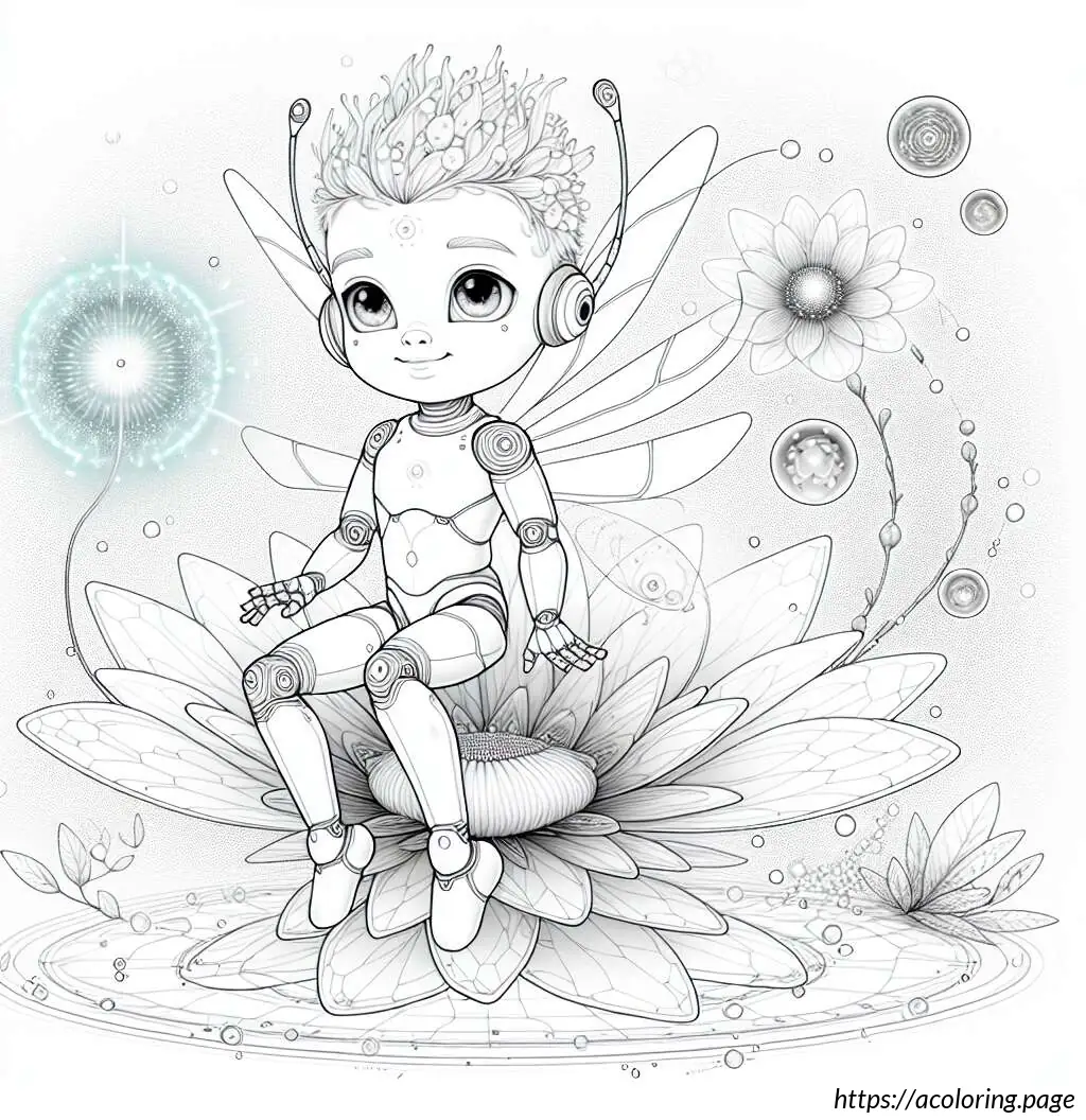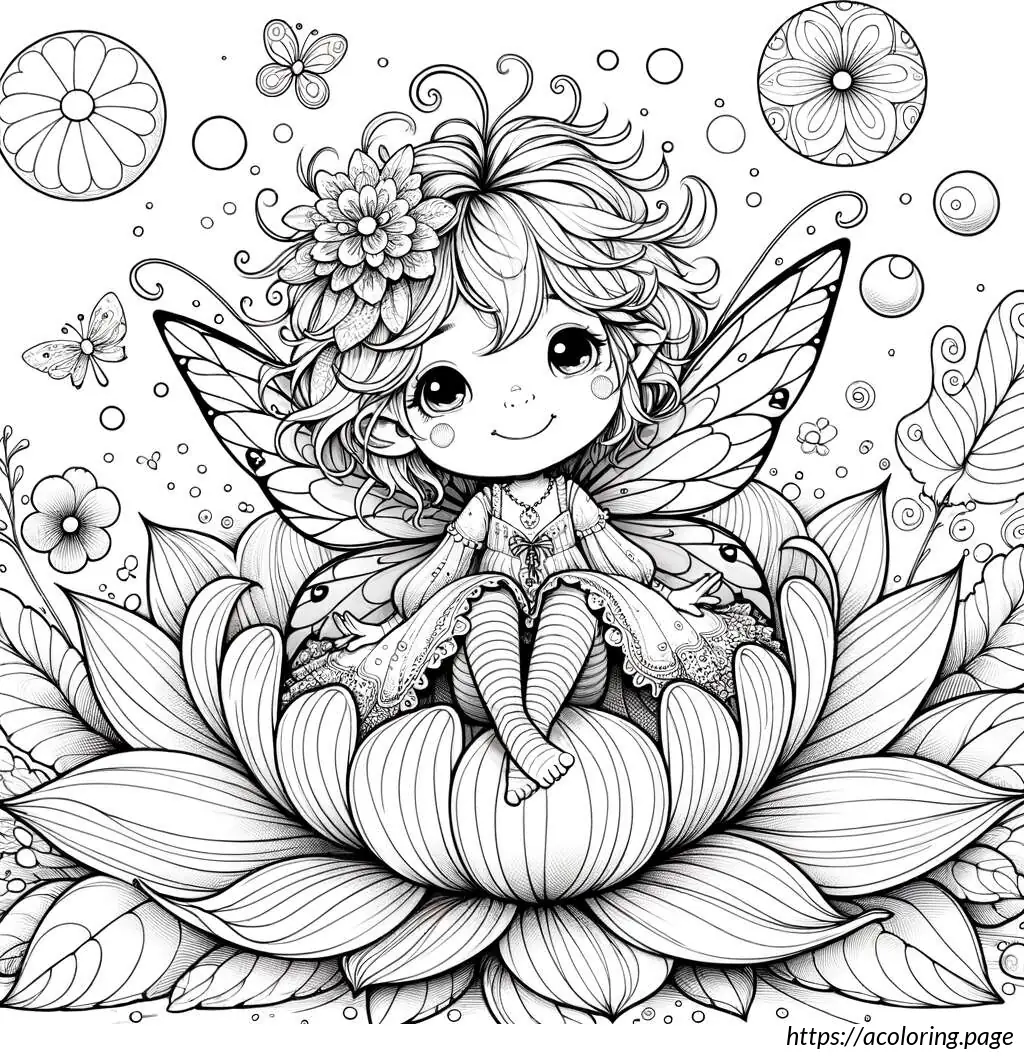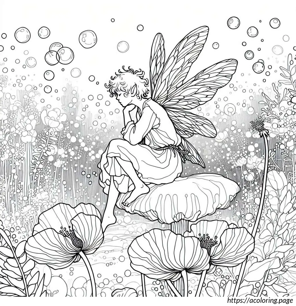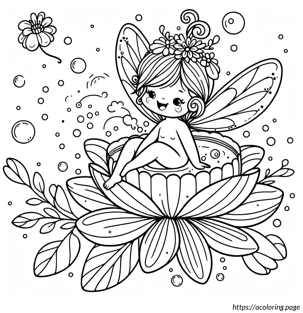 The image features a whimsical black and white line drawing of a joyful child with fairy-like wings, sitting atop a large flower. The child has fluffy, tousled hair and is smiling broadly, with closed eyes and a cheerful expression. The fairy wings are sizable with a flowing, elegant design. The child wears a simple, short-sleeved dress. Bubbles of varying sizes float around the child, adding to the playful, enchanted atmosphere of the scene. The flower beneath the child is stylized with large petals filled with different patterns, suggesting dimension and texture. Overall, the illustration has a light, joyful vibe suitable for coloring and children’s book illustrations.