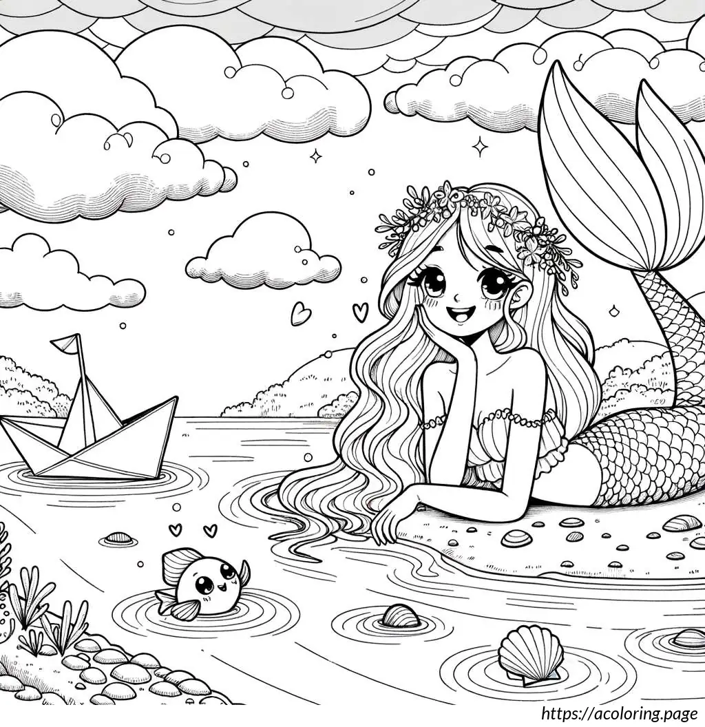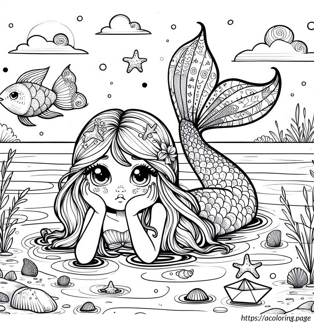 This black and white image appears to be a coloring page featuring a fantasy scene with a mermaid. The setting is likely at the edge of a body of water, indicated by the presence of water ripples and a small fish that appears at the bottom of the image. The mermaid is depicted with long, flowing hair, and her expressive eyes are emphasized with detail, giving her a friendly and inviting look. She is smiling and has her hands placed on her cheeks, suggesting a pose of relaxation or enjoyment.