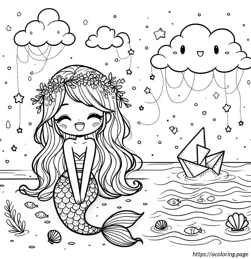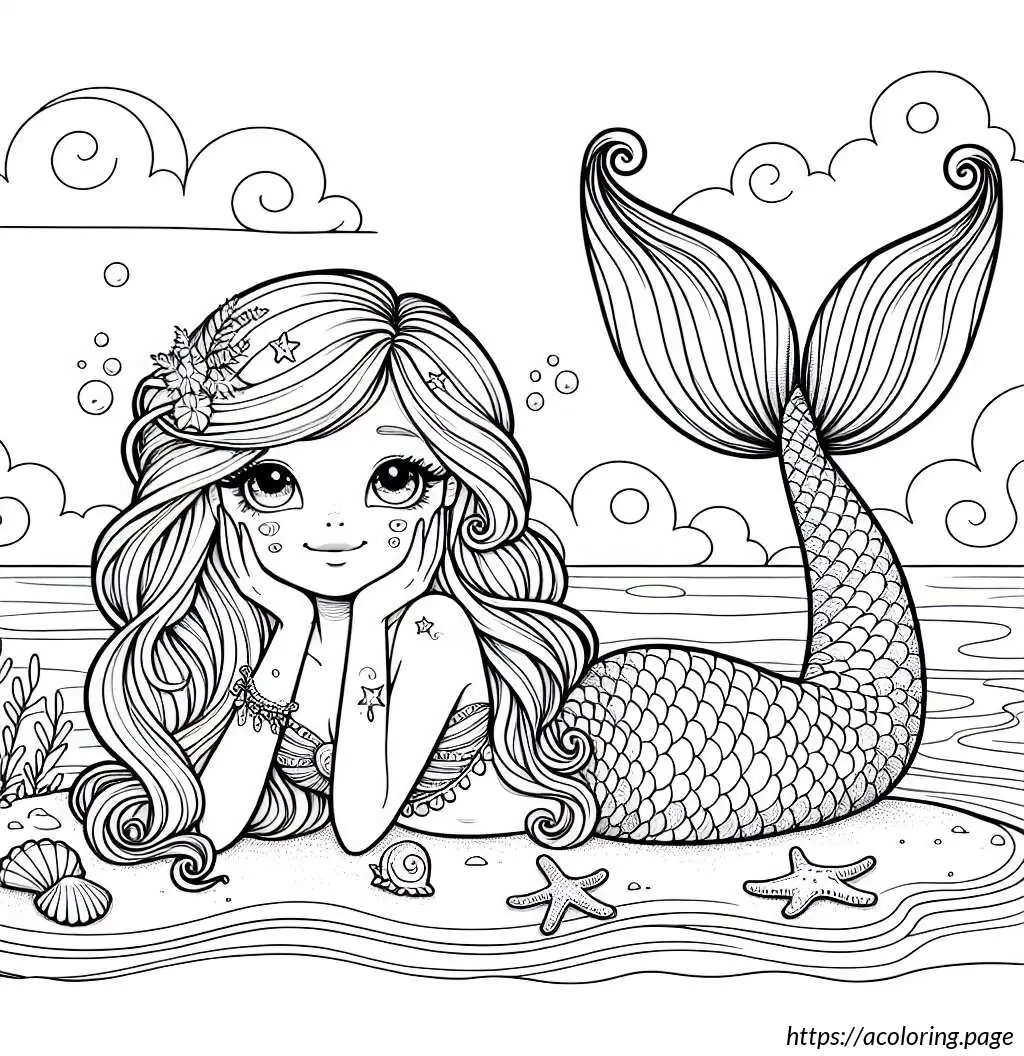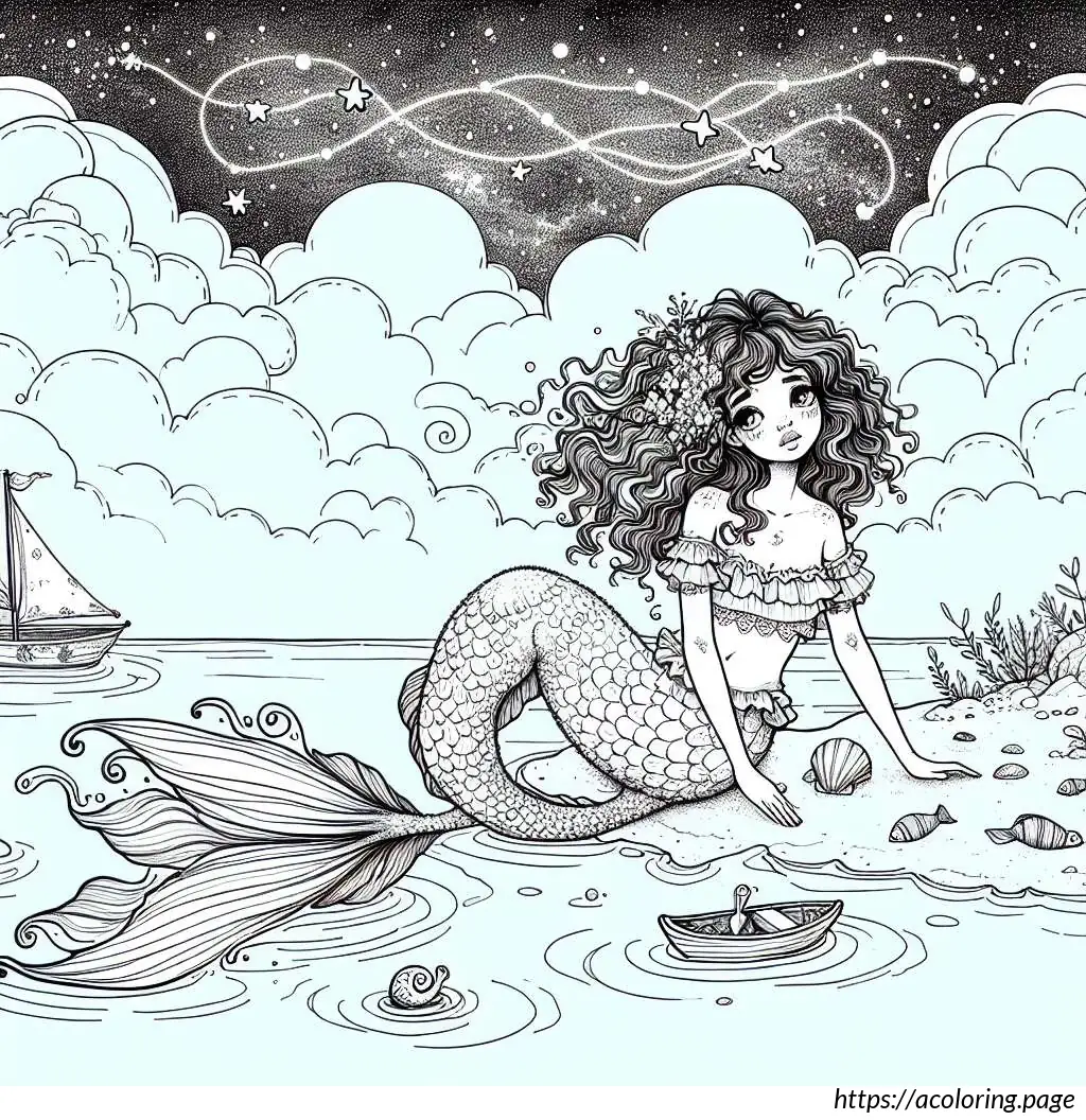 The mermaid’s tail, decorated with stars, extends out of the water onto what looks like sand, partially coiled around her. Surrounding her in the sand are small objects that resemble shells and possibly a starfish, contributing to the maritime theme. The background features cloud shapes, hinting at an open sky, thereby framing the mermaid in a pleasant, natural setting.