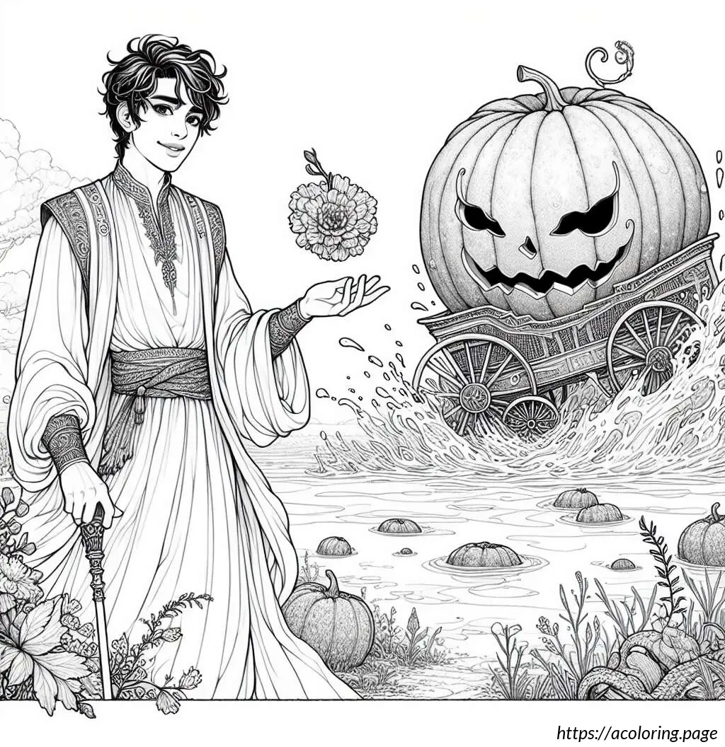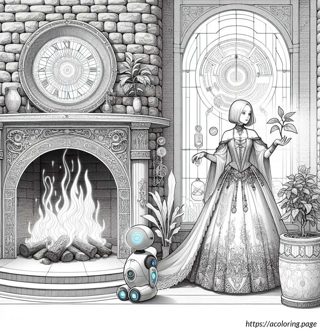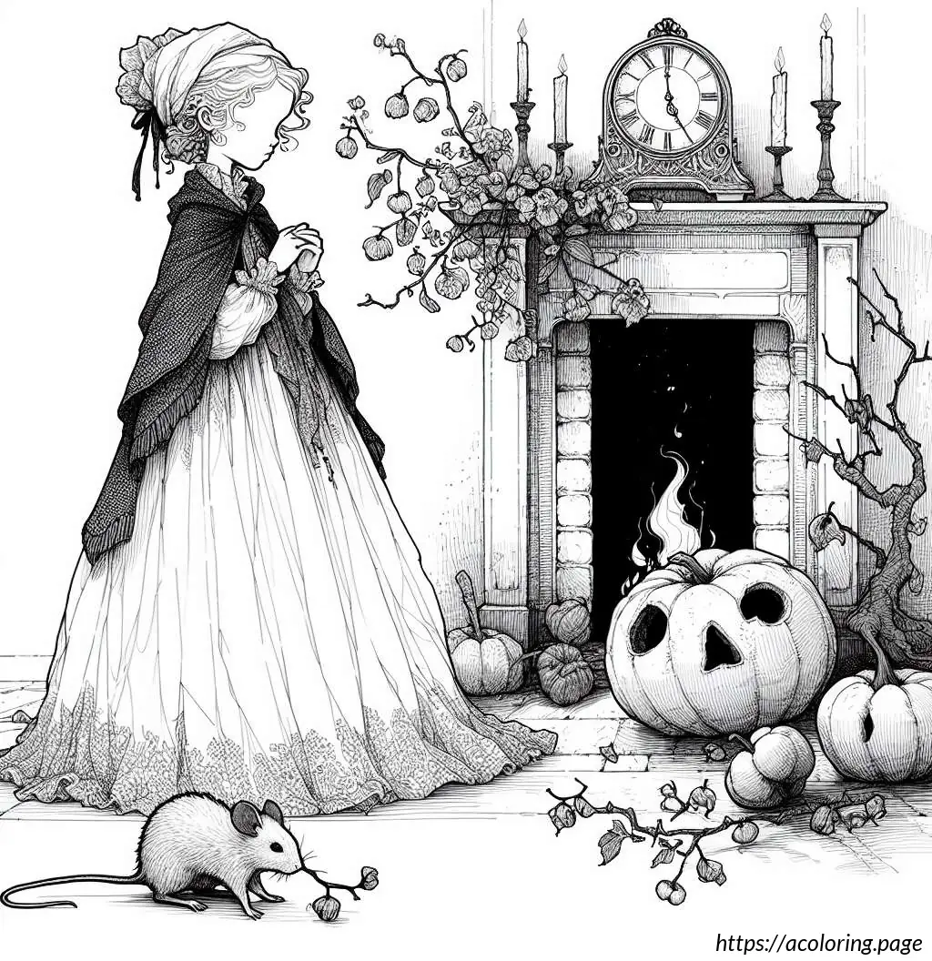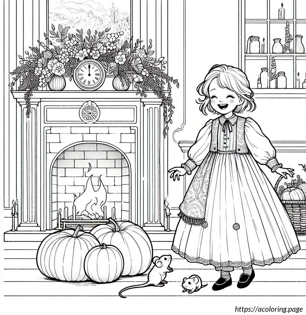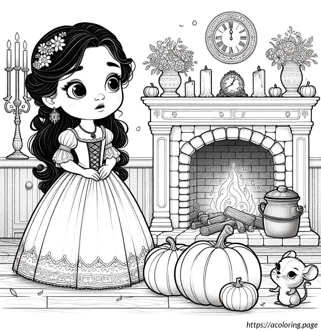 In the background, there’s a stone fireplace with an ornate metal pot hanging inside it. Beside the fireplace stands a stone wall where a clock and a vase with a couple of flowers are placed on a ledge. The scene also shows two large pumpkins on the floor, enhancing the fairy tale vibe of the setting. The lines are clean and clear, making it easy for coloring and suitable for children’s activities.